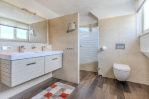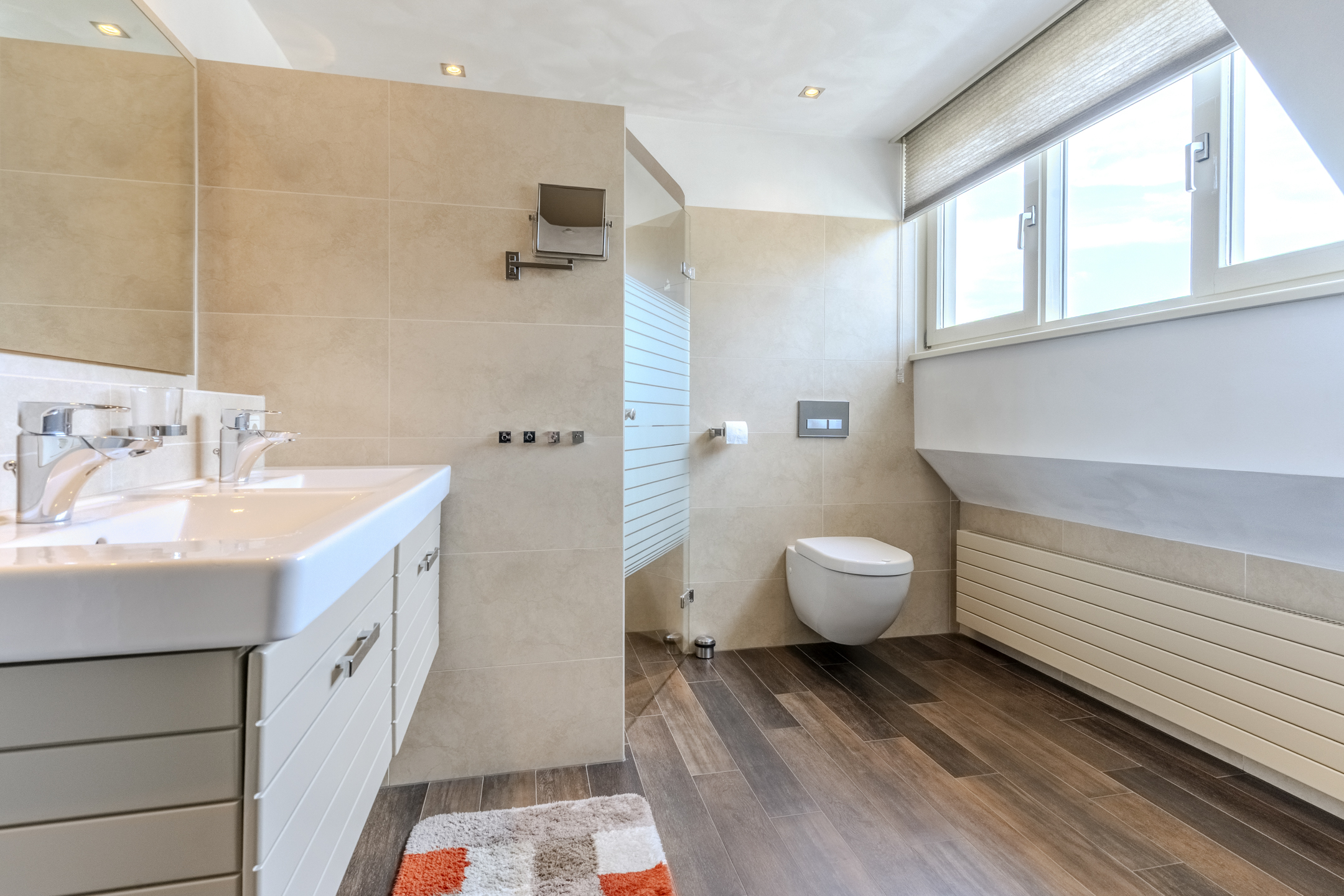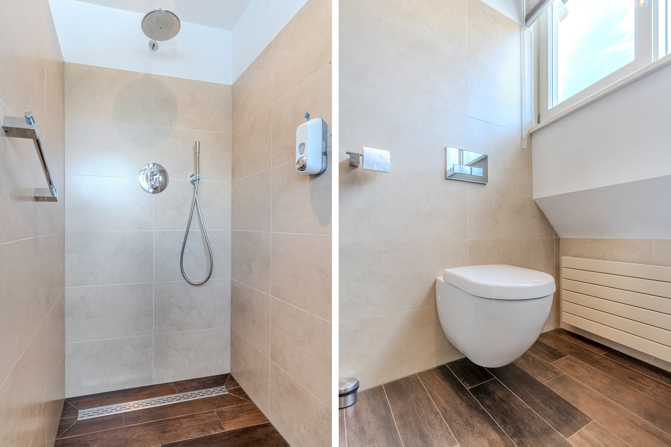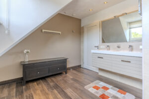 Luxe en moderne badkamer (2010) voorzien van een dubbele vaste wastafel met meubel, inloopdouche met regendouche en inbouwkranen, vrij hangend toilet. In de badkamer zijn daarnaast een dakkapel en schuurwerk plafondafwerking met inbouwspots aanwezig.