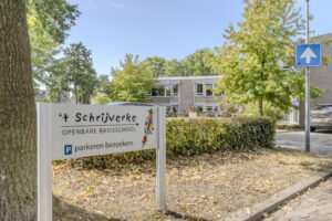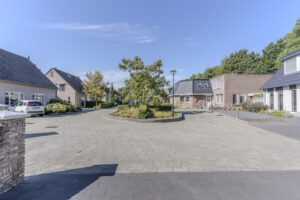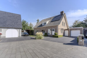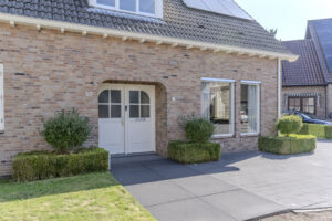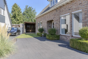 Aan de voorzijde van de woning gelegen ruime en brede oprit. De oprit biedt toegang tot de garage en een achterom.