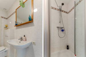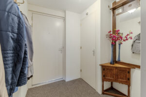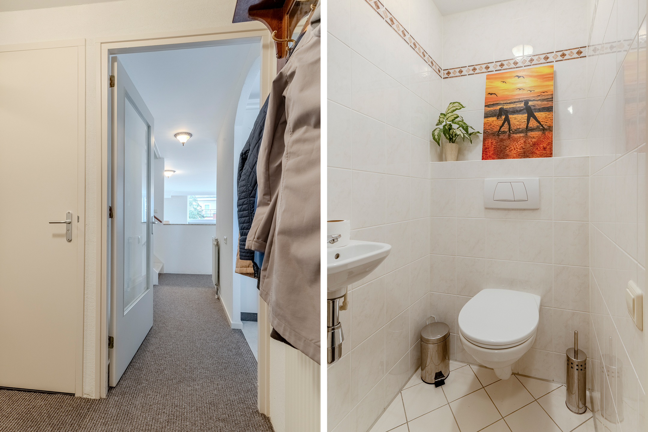 Hal met uitgebreide meterkast (en loze leidingen voor extra contactpunten) en een licht betegelde toiletruimte voorzien van een vrij hangend toilet met fontein. De hal geeft toegang tot een 2e hal en de keuken.
