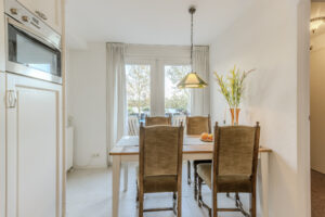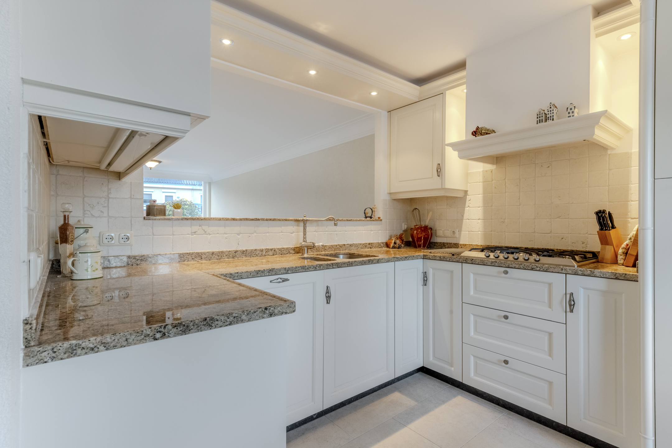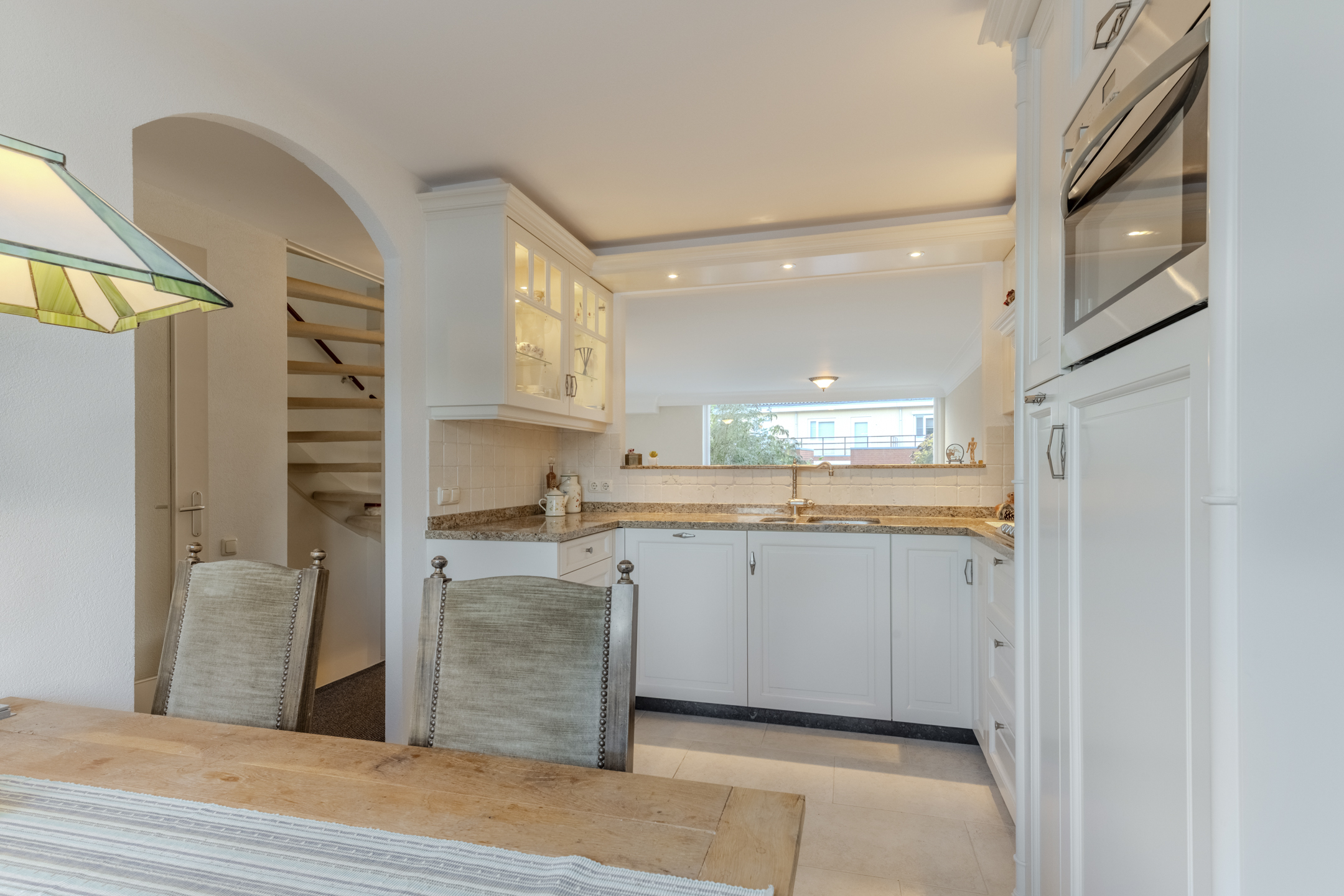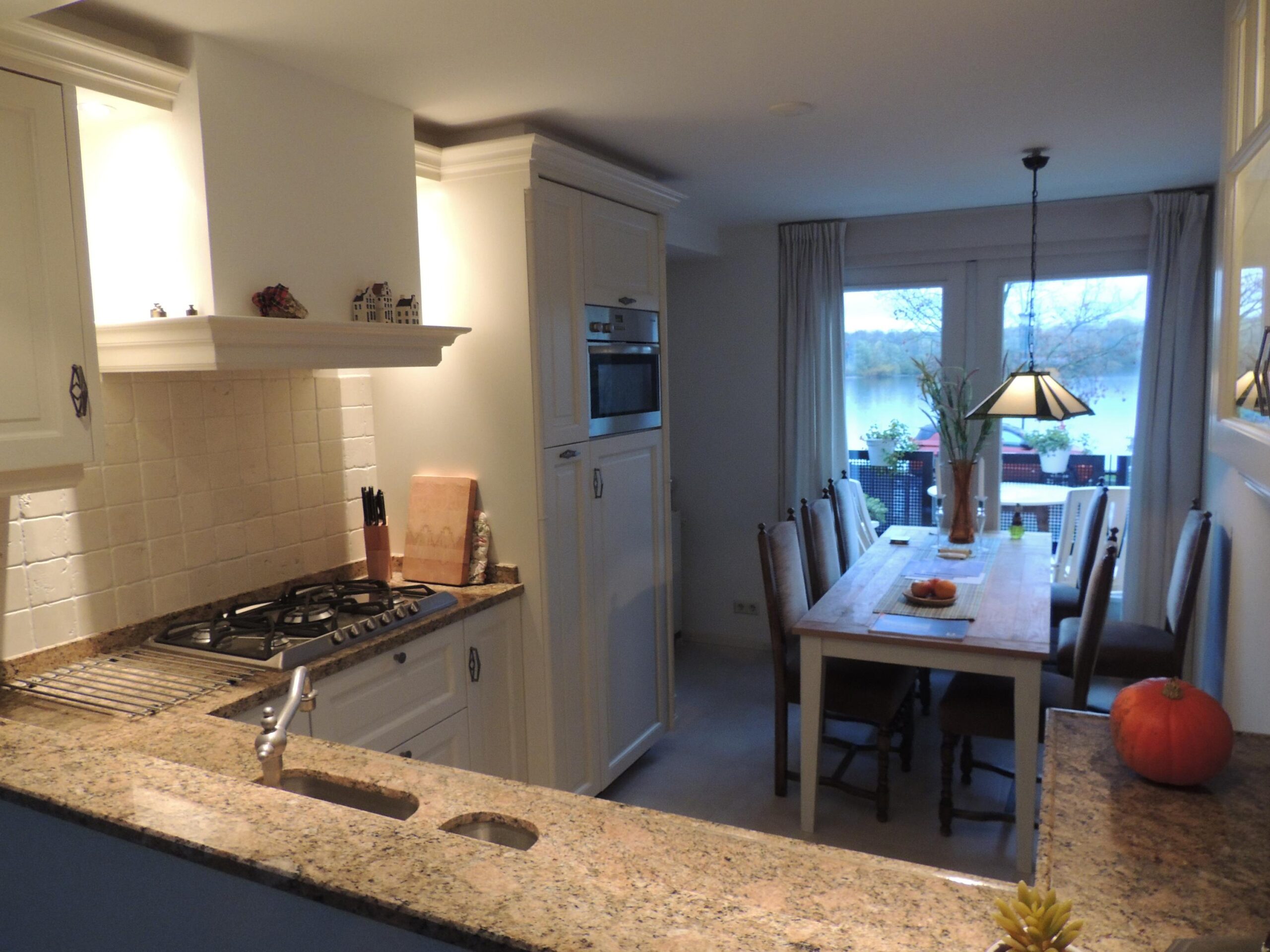 De keukeninrichting in U-vorm is voorzien van een granieten blad, 1 ½ spoelbak, 5-pits gaskookplaat (SMEG), afzuigkap (Novy), koelkast met vriesvak (Miele), combi magnetron (Miele) en een vaatwasser (Miele). De meeste apparatuur is nagenoeg ongebruikt dus zo goed als in nieuwstaat.