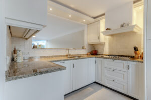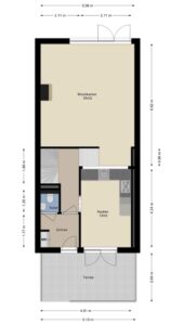 Aan de voorzijde van de woning is de woonkeuken circa 12m² gelegen met lichte tegelvloer, spachtelputz wandafwerking, strak stucwerk plafondafwerking en inbouwspots. Twee openslaande deuren (met rolluik) geven toegang tot een terras aan de voorzijde, waar u heerlijk kunt genieten van het uitzicht.