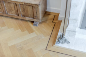 - Woonkamervloer van massief Frans eikenhout met sierrand voorzien van zwarte bies.