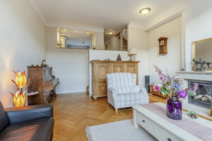 De woonkamer is voorzien van een prachtige visgraat massieve hardhouten vloer met zwarte bies, spachtelputz wandafwerking, strak stucwerk plafondafwerking met sierlijst, sfeervolle schouw met gashaard (Faber) en twee openslaande tuindeuren.