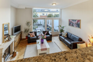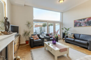 Via een massief eikenhouten trap is de lager gelegen woonkamer circa 35m² gelegen met een prachtige plafondhoogte van circa 3.50 meter! Dit zorgt voor een erg ruimtelijk gevoel en de vele raampartijen in de achtergevel zorgen voor veel lichtinval en een fraai zicht op de achtertuin.