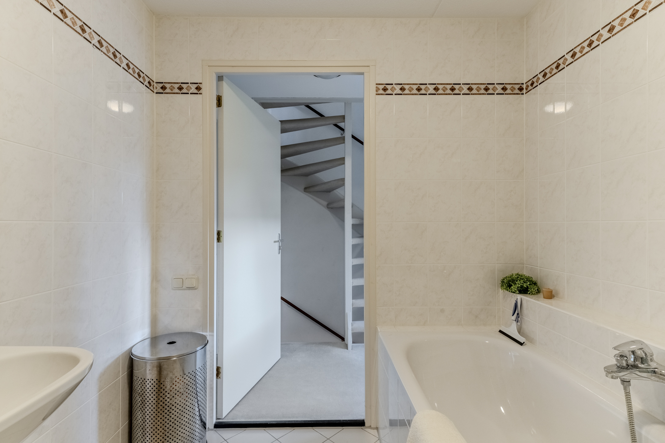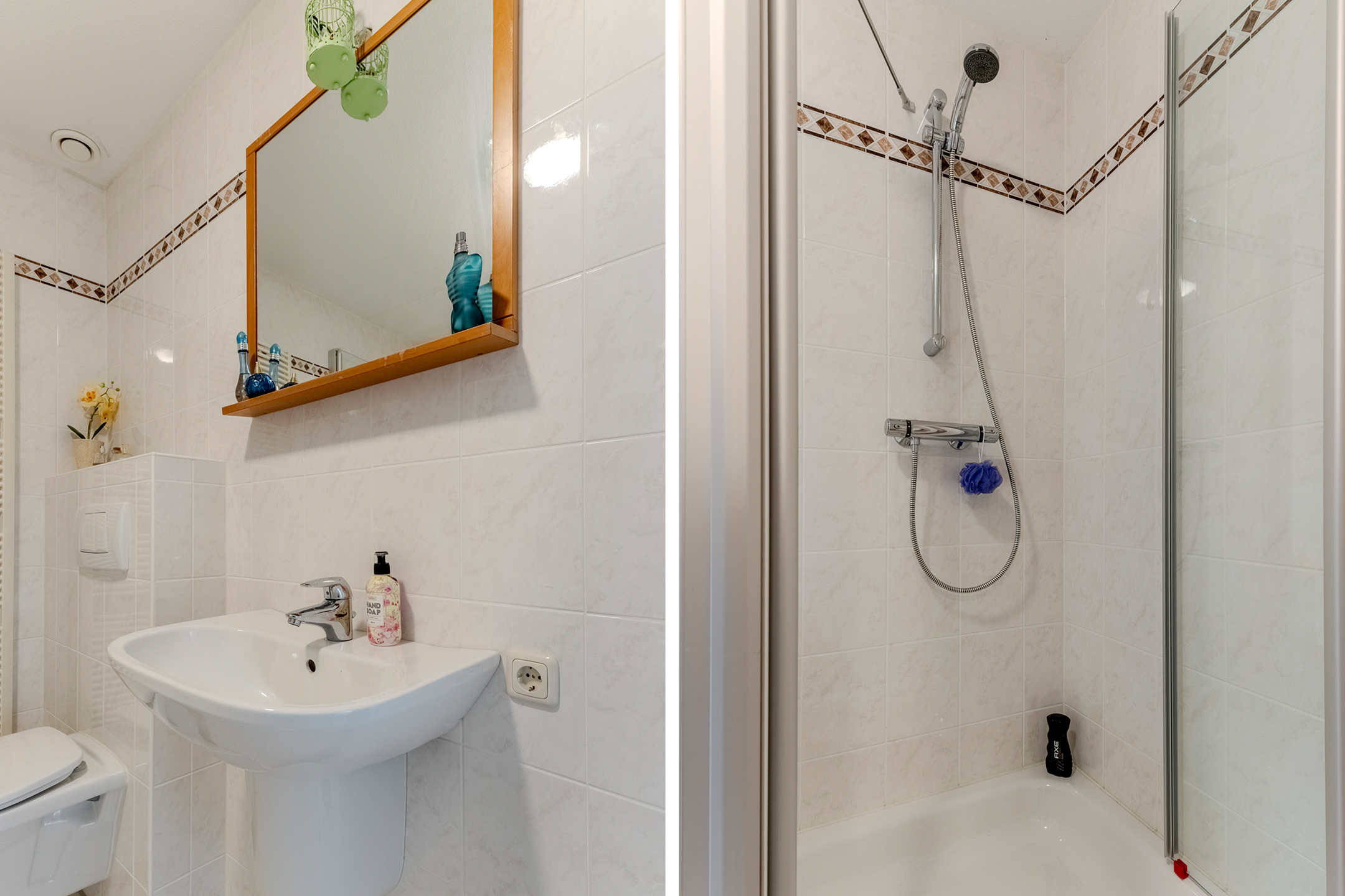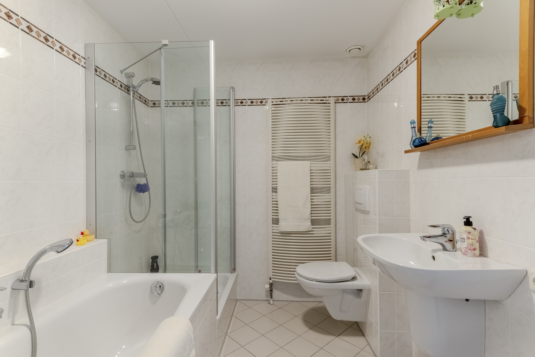 Licht betegelde badkamer voorzien van een vaste wastafel, ligbad, douche met thermostaat kraan, vrij hangend toilet en een design radiator.