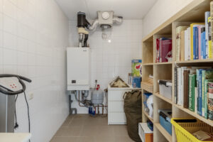 Betegelde berging/ wasruimte met de c.v. combi ketel (Nefit Ecomline HR), de aansluitingen voor de wasapparatuur en de unit voor de mechanische ventilatie.