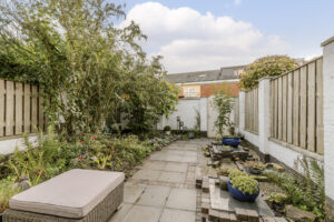 De achtertuin ligt op het zonnige zuid westen en is bestraat, voorzien van diverse natuurlijke borders (met beplanting als een vlinderstruik en hazelnootstruik) en een achterom. De degelijke, gemetselde erfafscheidingen met houten panelen zijn voorzien van loze leidingen voor tuinverlichting en op de achtergevel van de woning is ook een aansluitpunt voor buitenverlichting en een buitenkraantje.