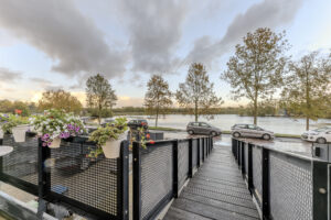 Via een fraaie statige loopbrug zijn de entree van de woning en het terras te bereiken.