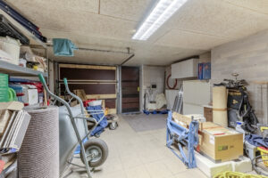 In het souterrain van de woning is de inpandige en ruime garage van circa 32m² te bereiken met de mogelijkheid om 2 auto’s te stallen/ parkeren. De garage is voorzien van een tegelvloer en de wanden zijn betegeld. Er is daarnaast een praktische bergkast aanwezig met een optie om de wasmachine te plaatsen. Een loopdeur en een kanteldeur geven toegang tot de eigen oprit.
