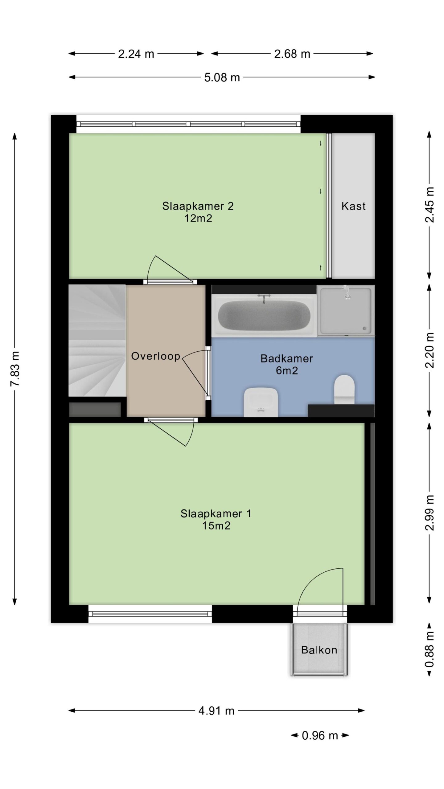 Voorslaapkamer circa 15m² met een deur naar een balkon en een achterslaapkamer circa 12m² met vaste kastenwand en een rolluik.