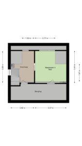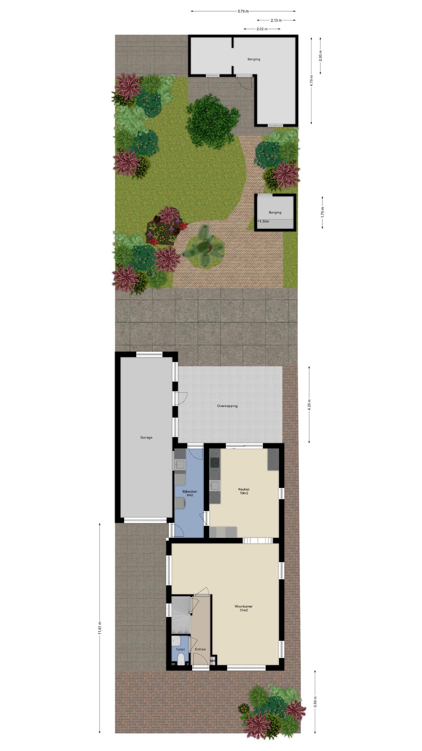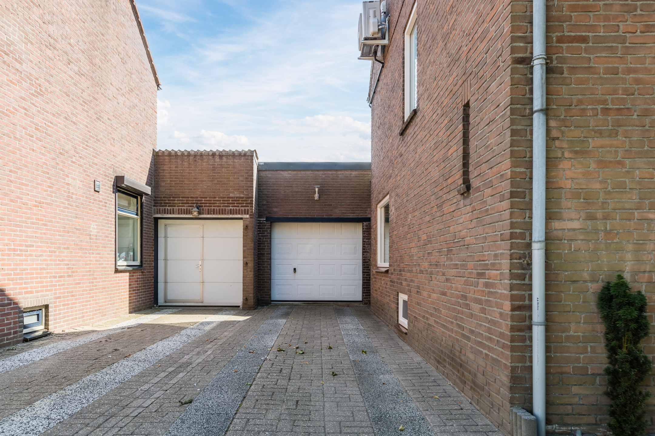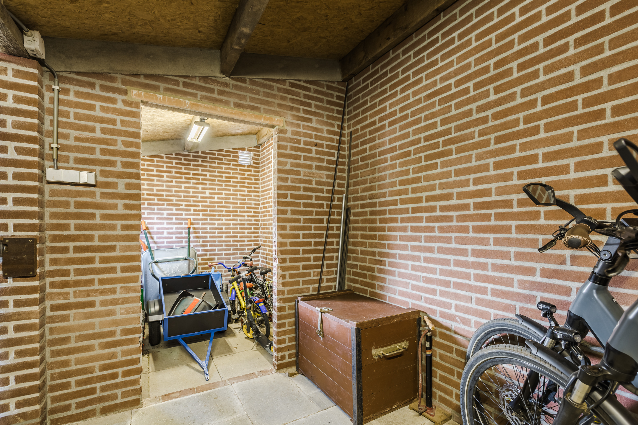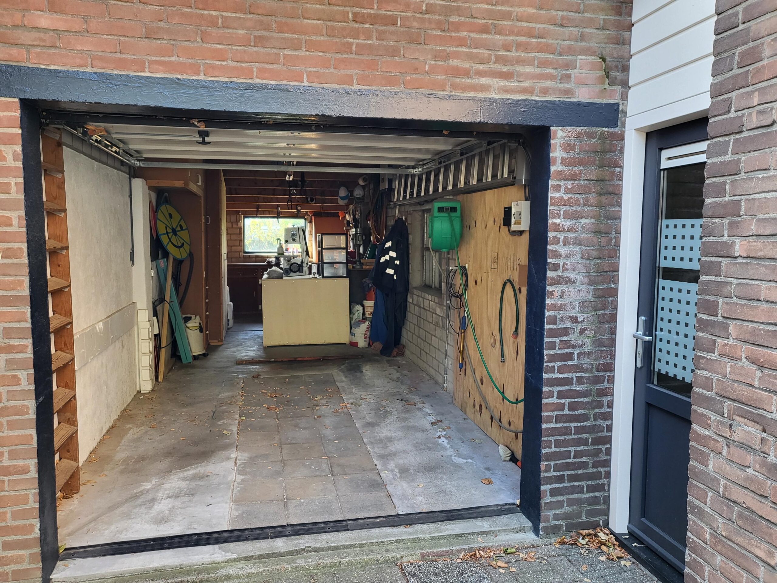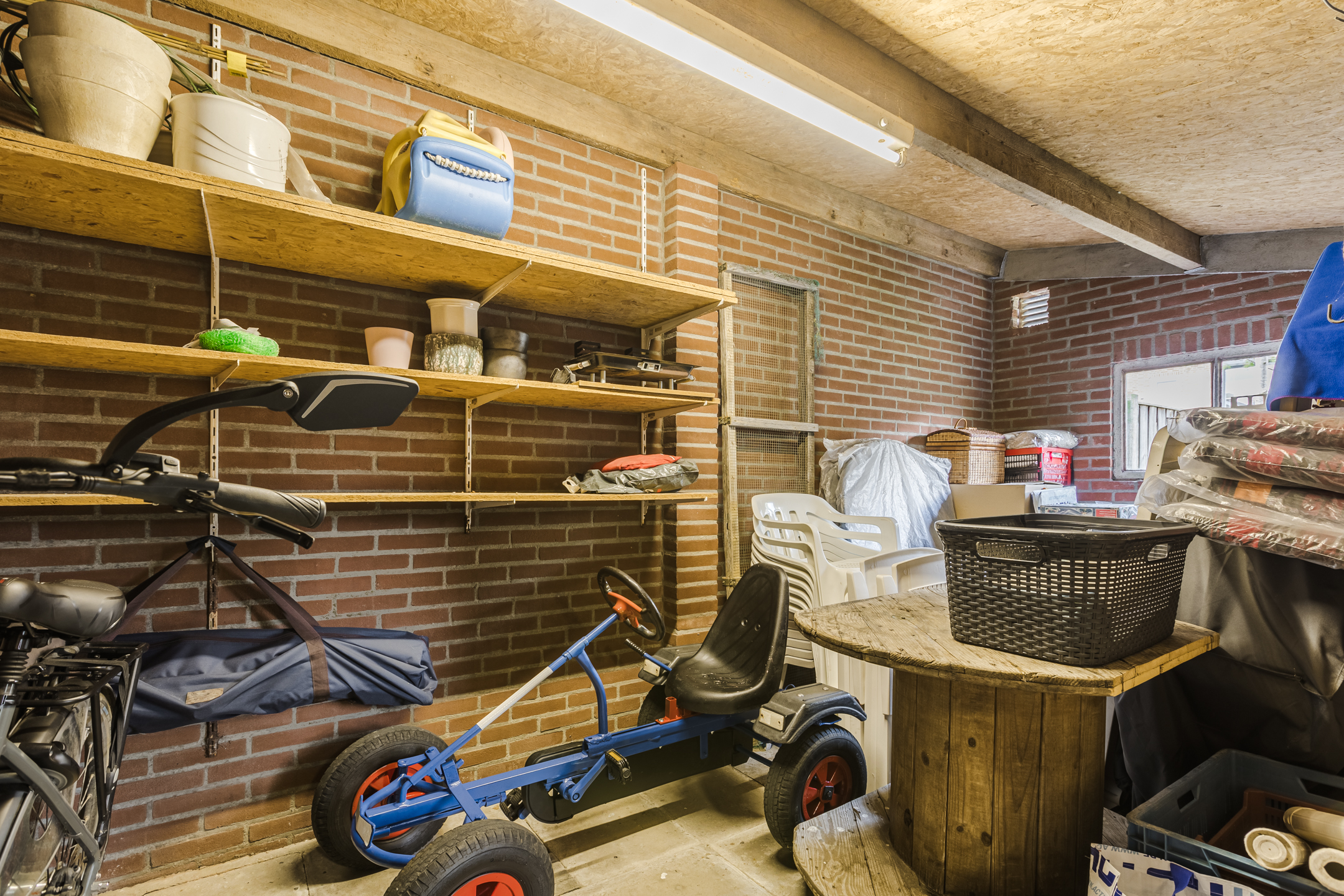 Inpandig vanuit de bijkeuken te bereiken grote in spouw gebouwde en geïsoleerde garage van ca. 8.87mx2.88m (voorzien van een elektrische roldeur met afstandsbediening) en een tweetal in de tuin gelegen bergingen met elektra. Tevens is de woning voorzien van een kelder van ca. 1.75m hoog (ca. 4m²).