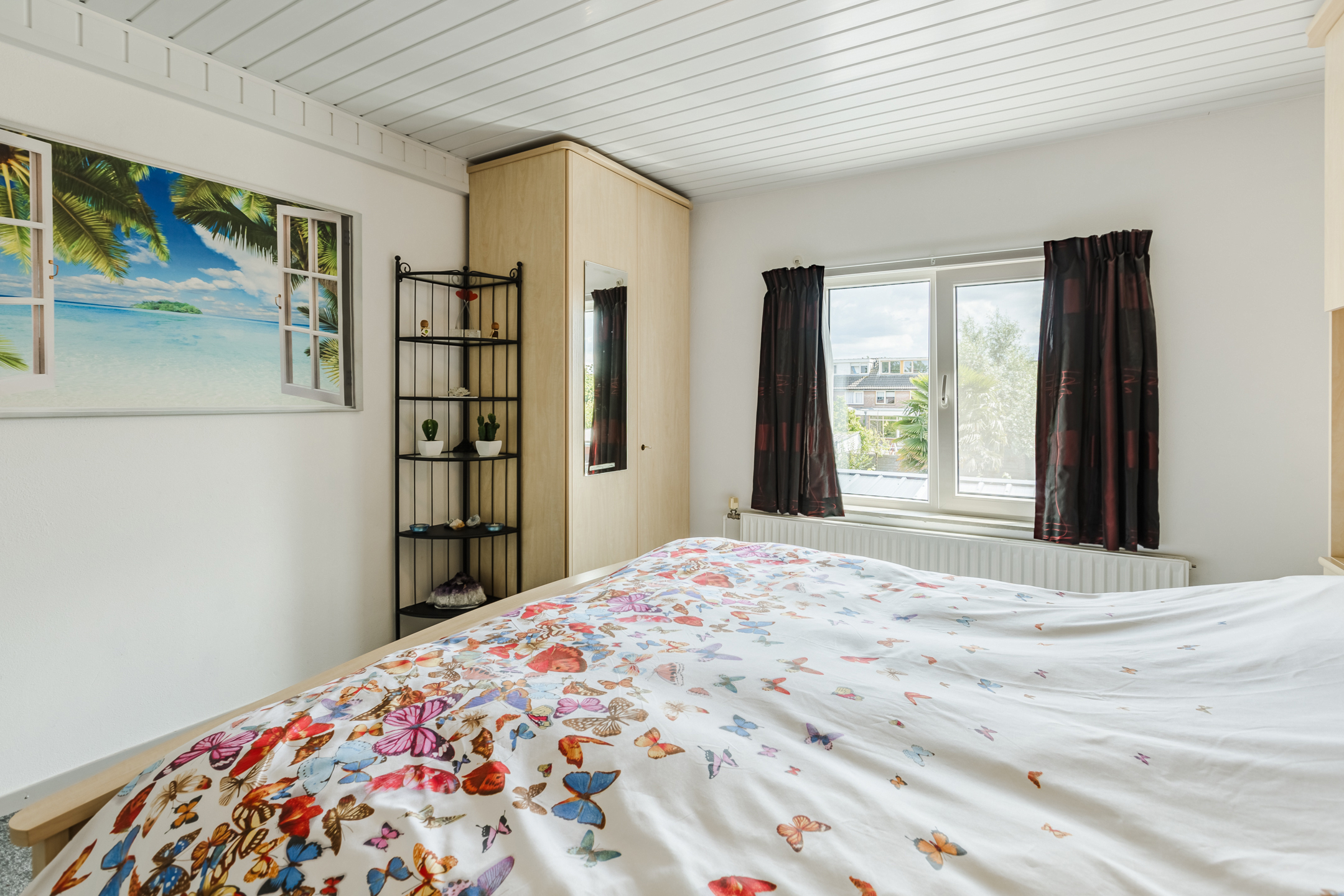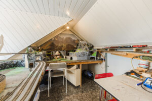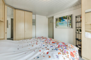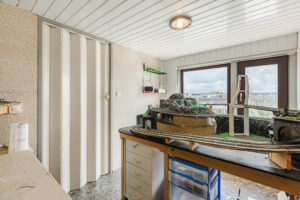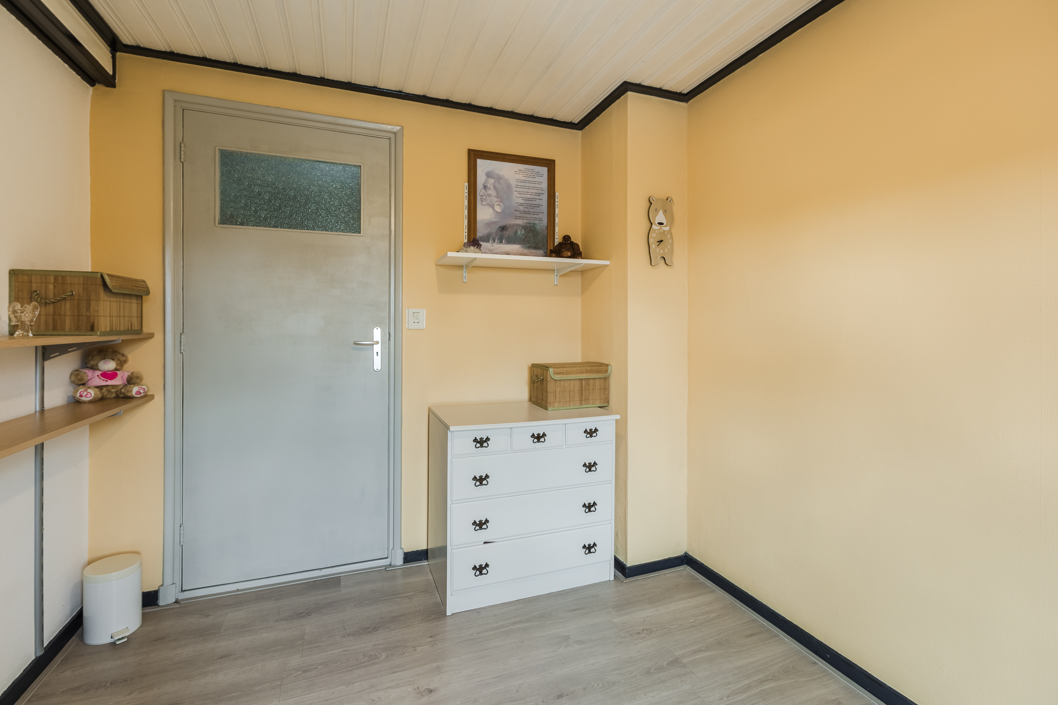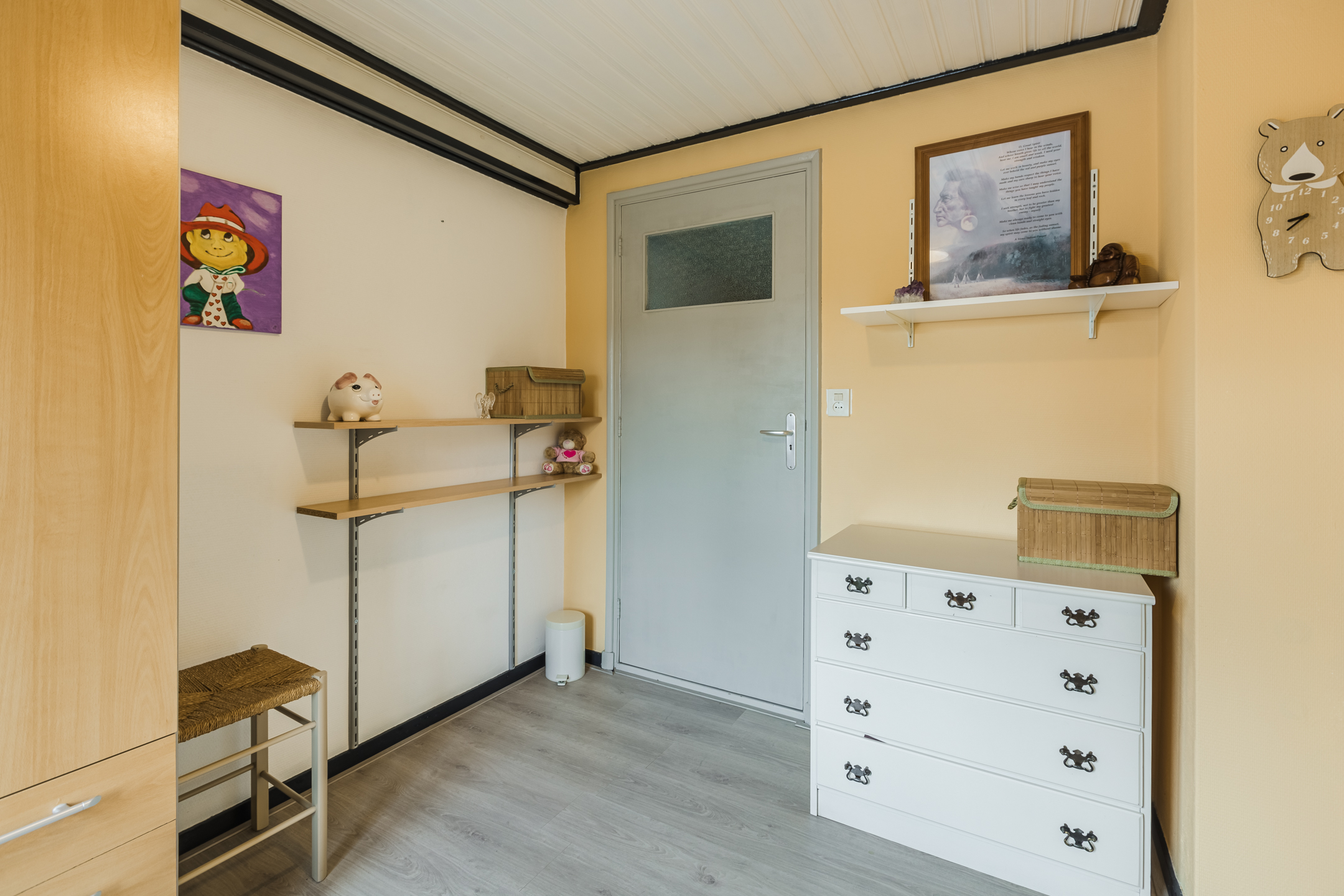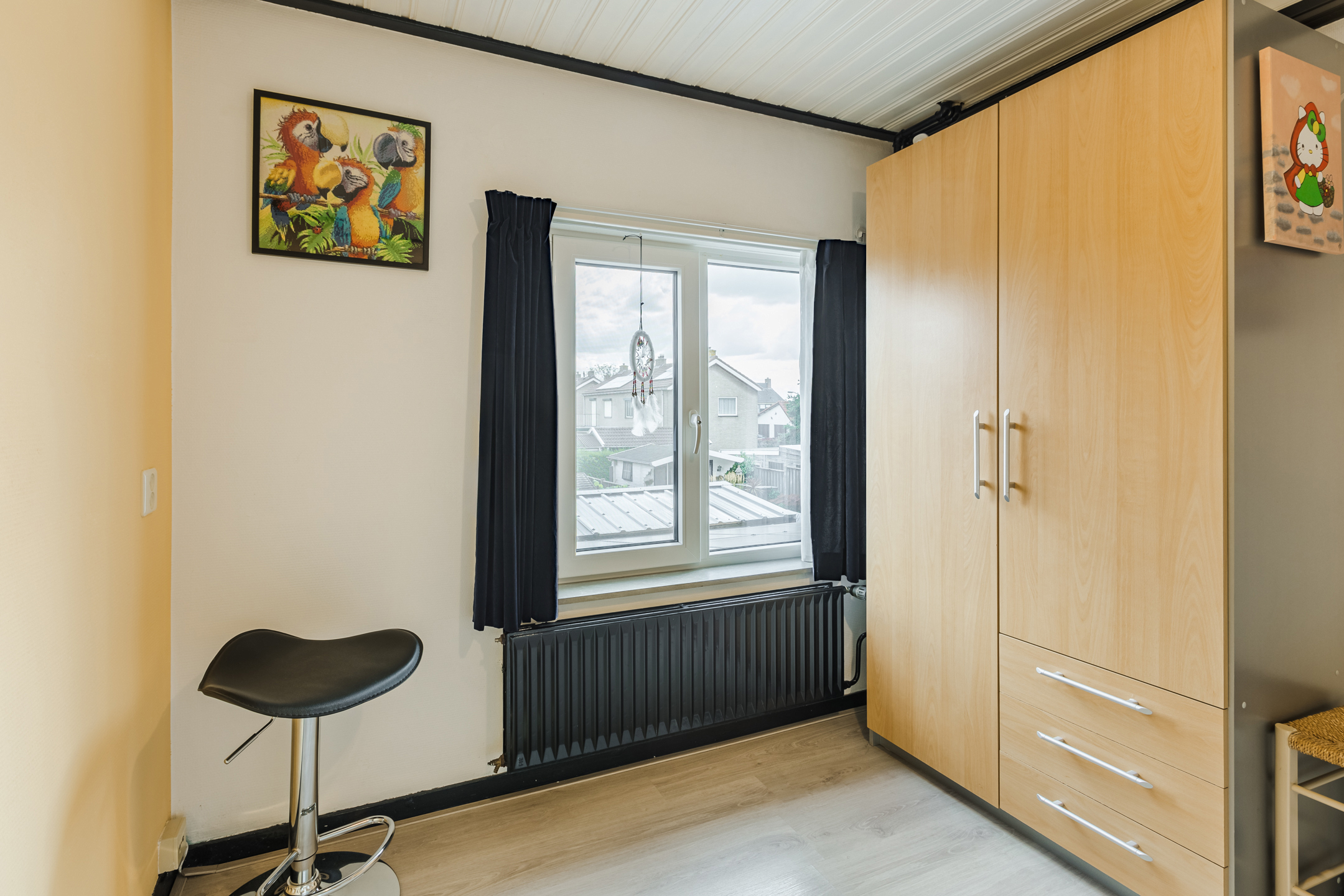 Slaapkamer 4 (ca. 9m²) met dakkapel aan de achterzijde en eveneens toegang tot de praktische bergruimte achter de schotten.
