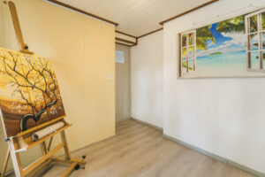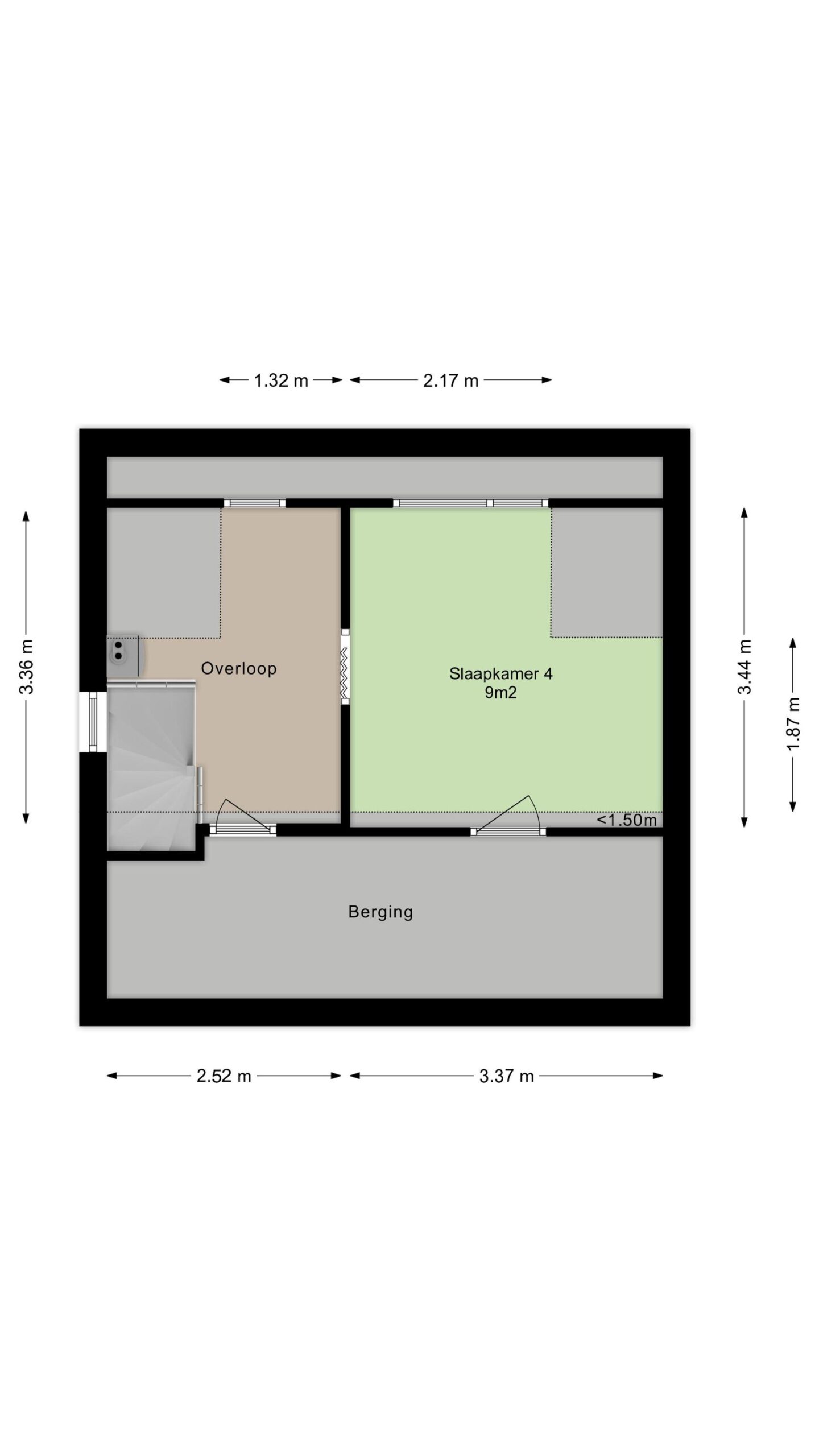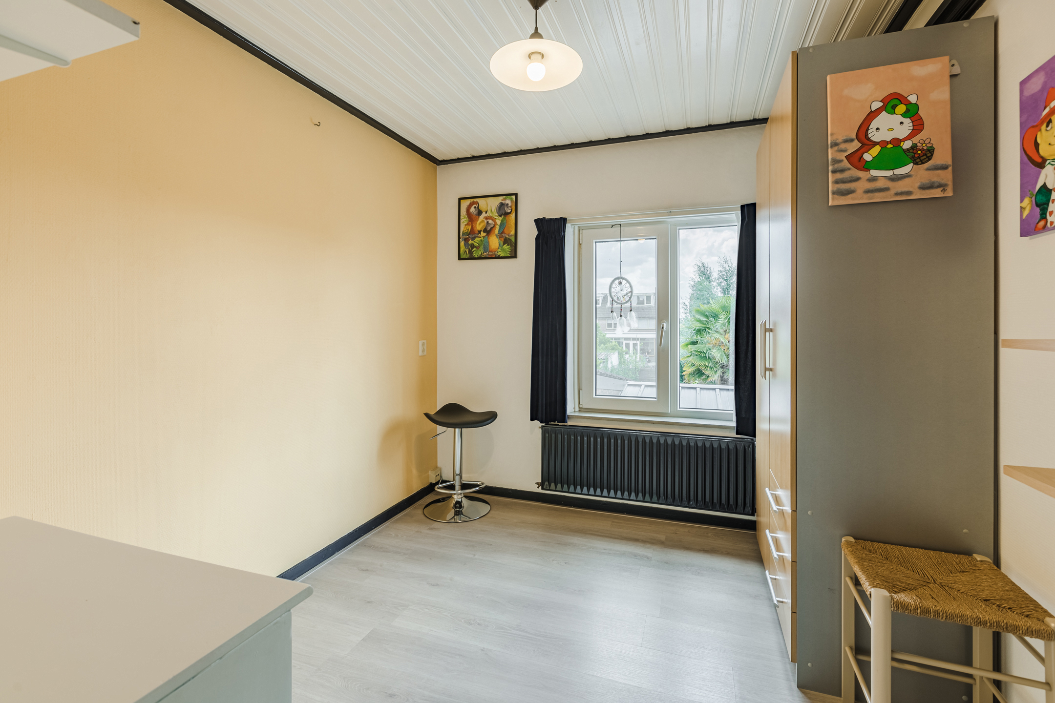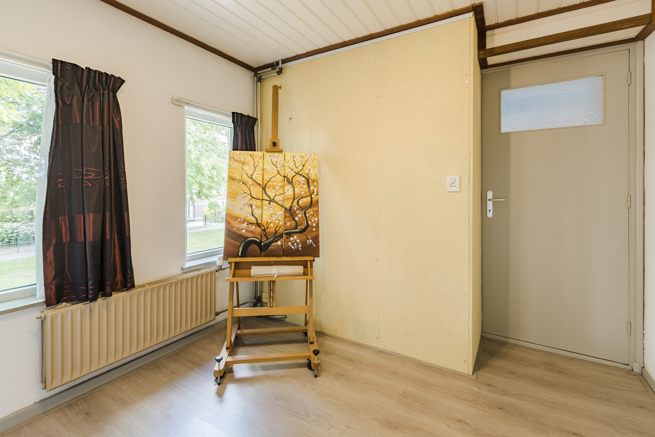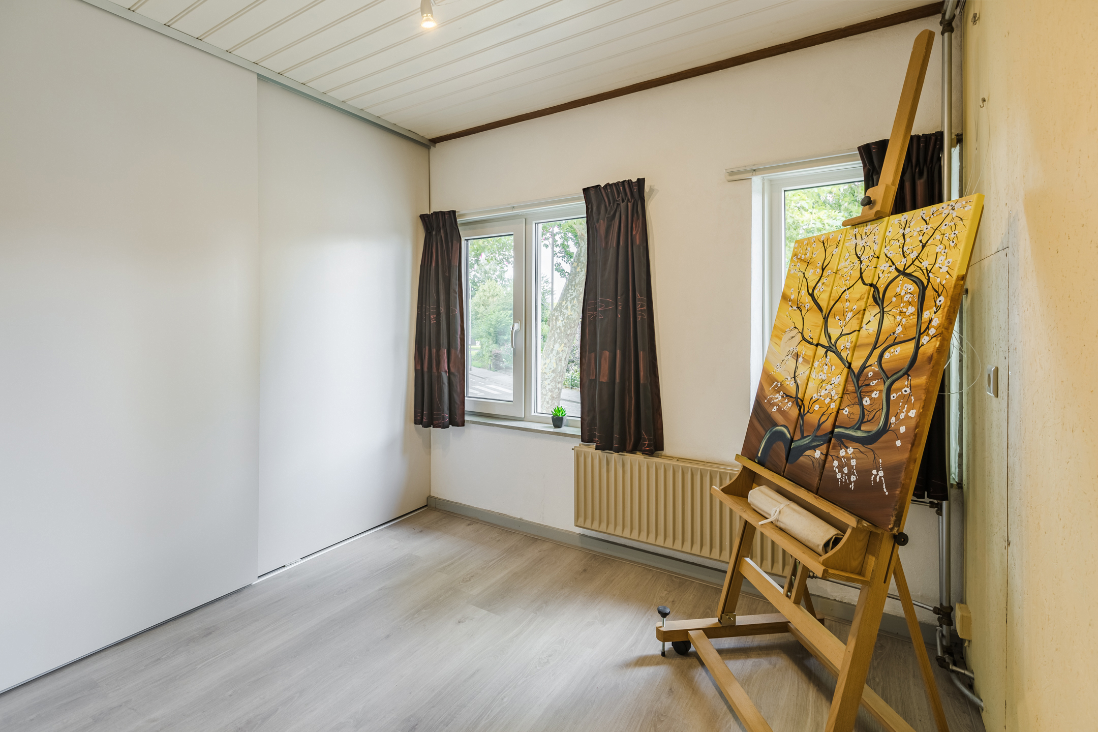 Slaapkamer 4 (ca. 9m²) met dakkapel aan de achterzijde en eveneens toegang tot de praktische bergruimte achter de schotten.