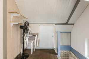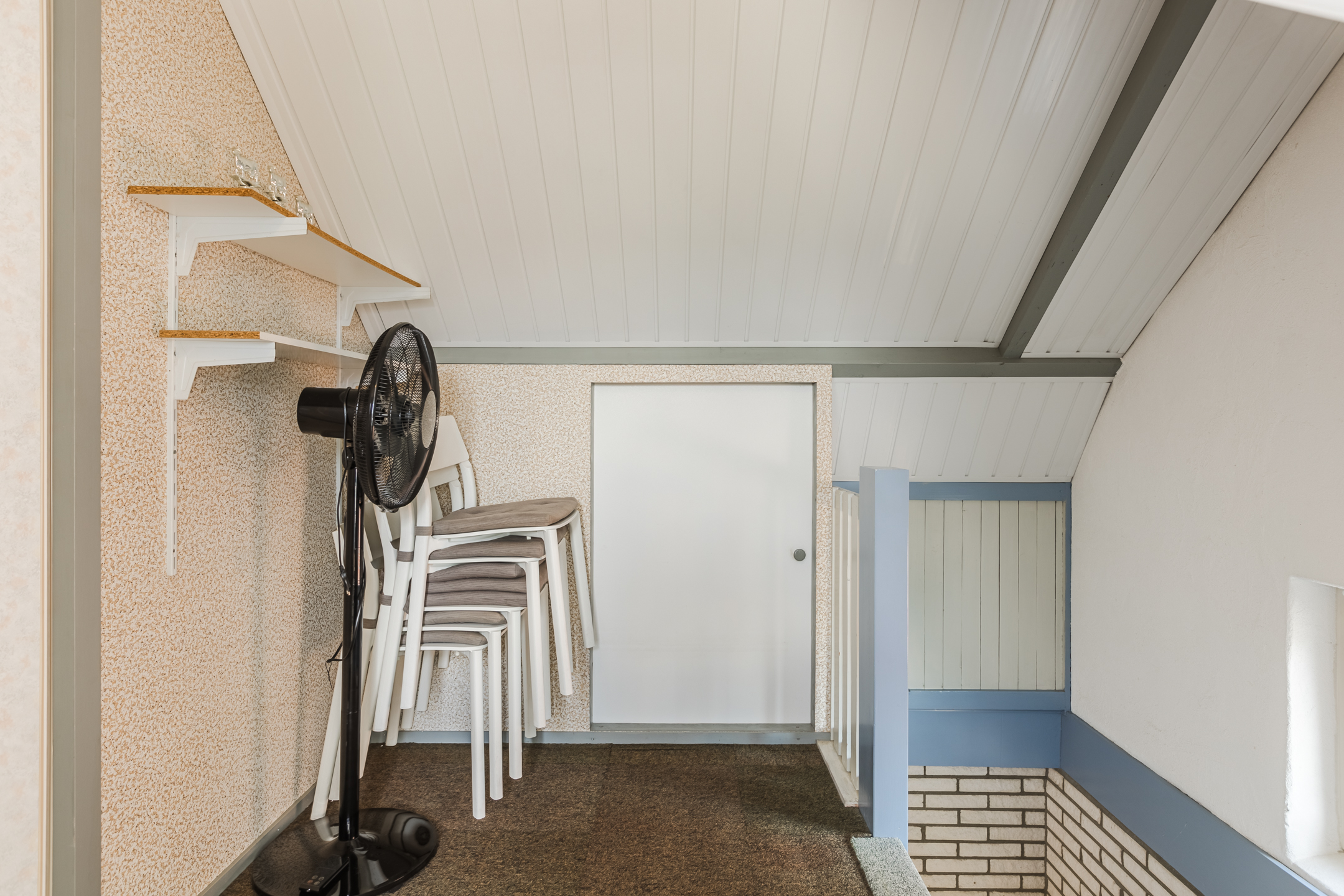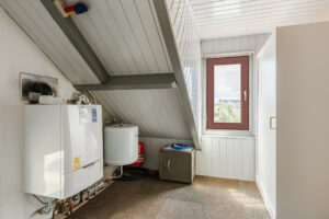Voorzolder/overloop met dakkapel en opstelplaats van de hybride cv-combiketel met warmtepomp (ca. 2023) en toegang tot de bergruimte aan de voorzijde.