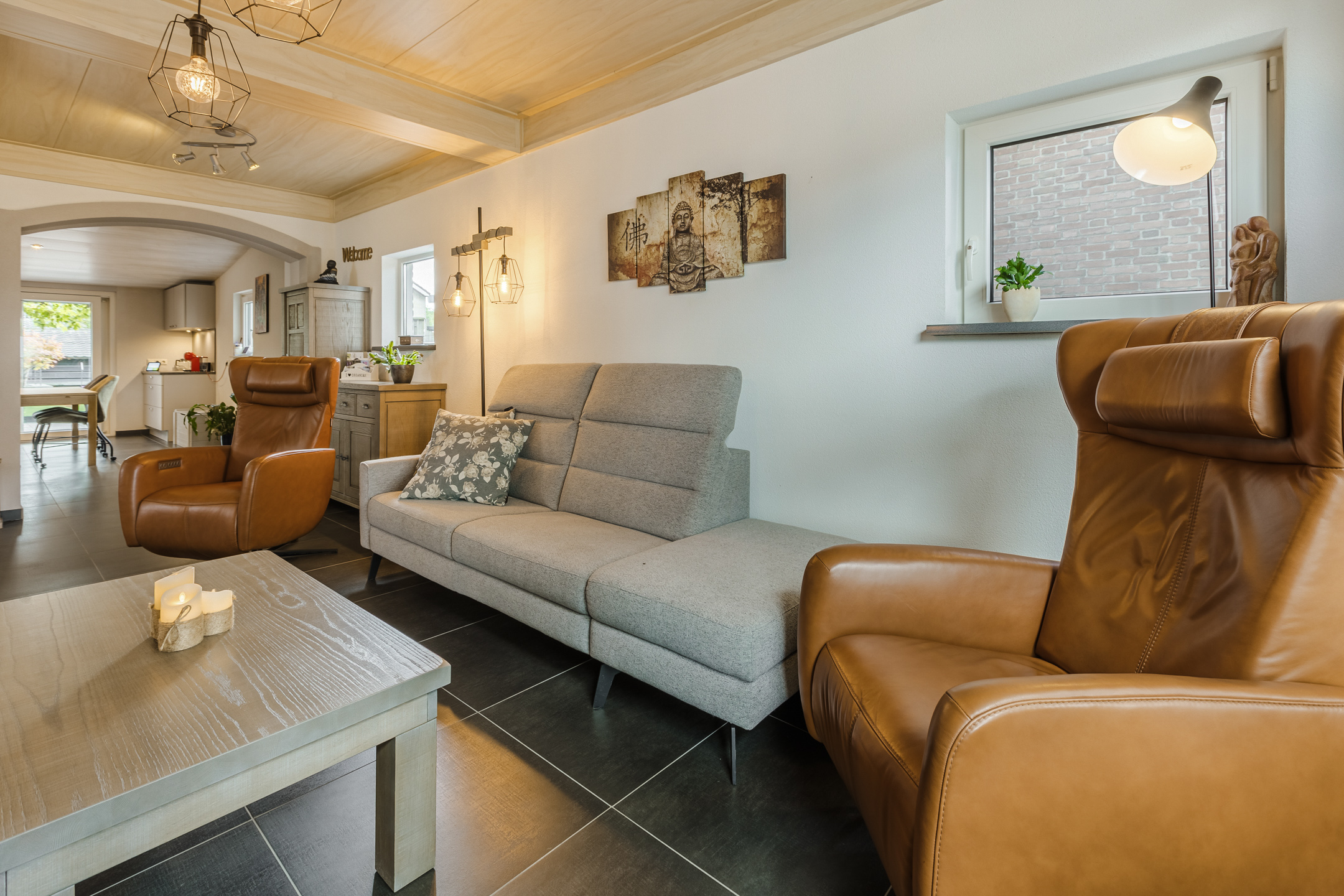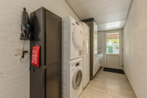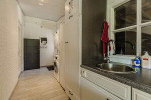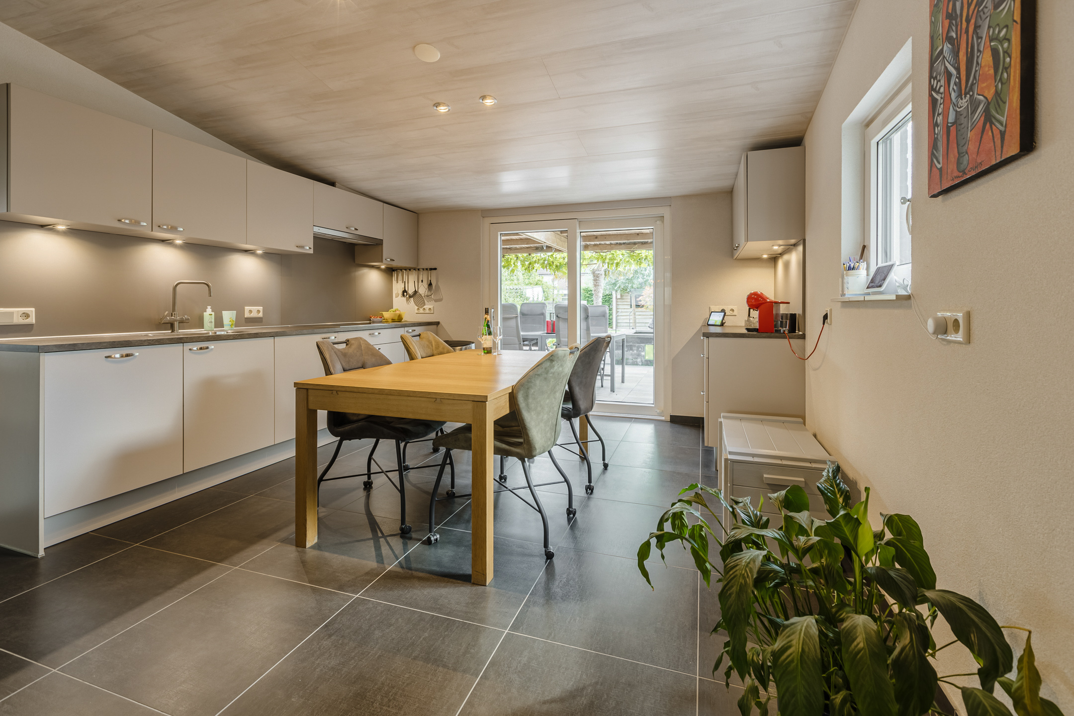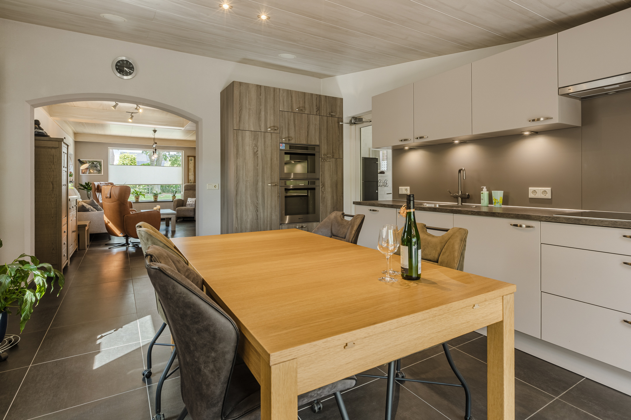 Entree/hal met meterkast, trapopgang naar de eerste verdieping en een geheel betegelde toiletruimte met een vrijhangend closet en een fonteintje. Ruime L-vormige zitkamer (ca. 31m²) gelegen aan de voorzijde van de woning welke in directe verbinding staat met de aan de achterzijde riant aangebouwde woon/eetkeuken van maar liefst 19m². De woon/eetkeuken is ingericht met een moderne keukeninrichting met de navolgende inbouwapparatuur te weten: inductiekookplaat, Quooker (2024), oven, combi-magnetron, brede afzuigschouw, koelkast en een vaatwasmachine. Vanuit de keuken is er een schuifpui naar het tuingerichte overdekte terras van ca. 25m². Eveneens is er vanuit de keuken toegang tot de grote praktische bijkeuken. Hier bevinden zich de aansluitingen ten behoeve van de wasapparatuur en een handig keukenblokje (inclusief grote extra inbouwkoelkast).