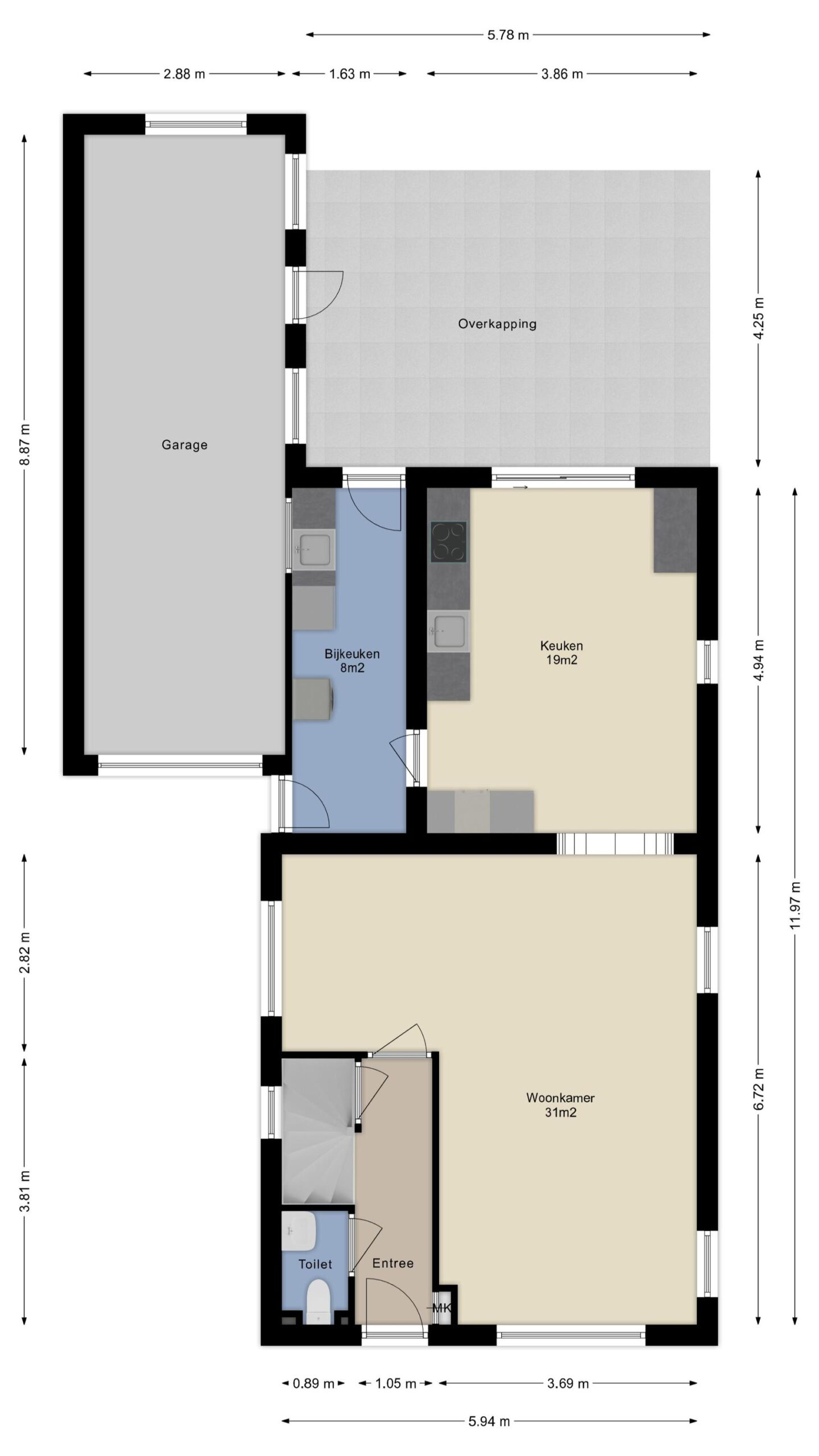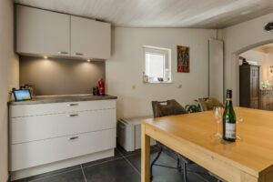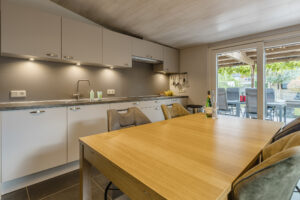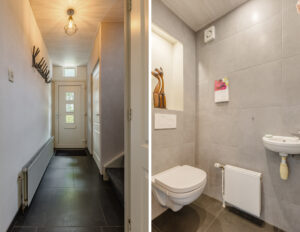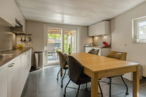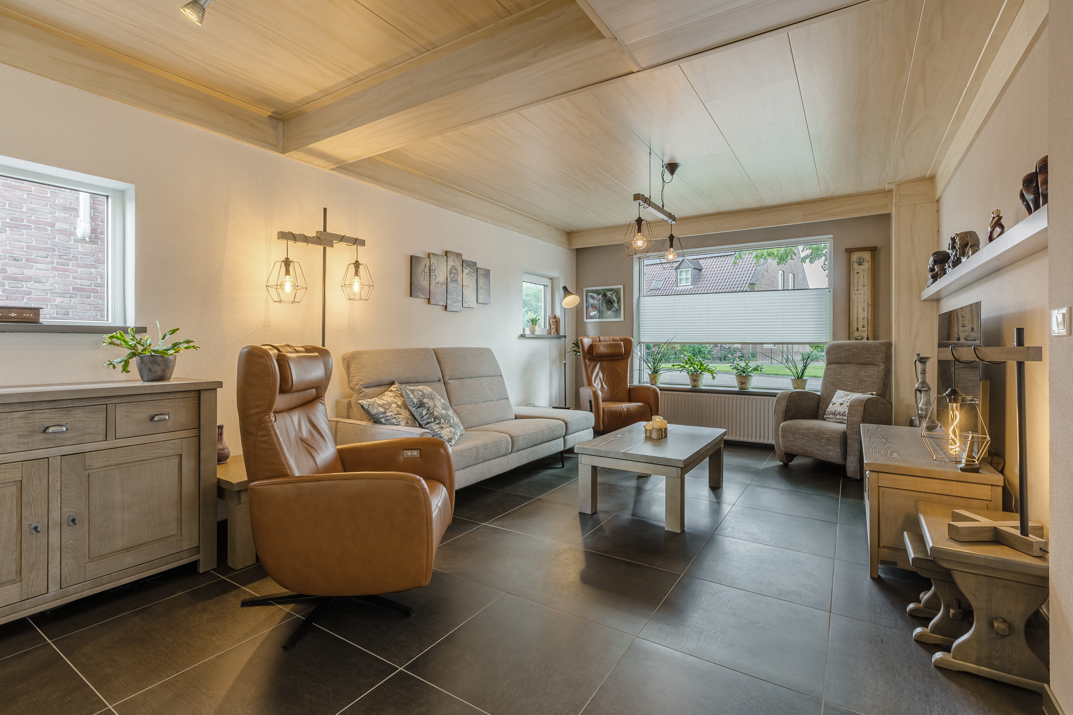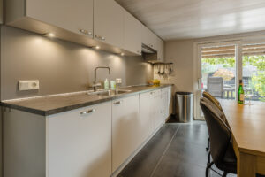 Entree/hal met meterkast, trapopgang naar de eerste verdieping en een geheel betegelde toiletruimte met een vrijhangend closet en een fonteintje. Ruime L-vormige zitkamer (ca. 31m²) gelegen aan de voorzijde van de woning welke in directe verbinding staat met de aan de achterzijde riant aangebouwde woon/eetkeuken van maar liefst 19m². De woon/eetkeuken is ingericht met een moderne keukeninrichting met de navolgende inbouwapparatuur te weten: inductiekookplaat, Quooker (2024), oven, combi-magnetron, brede afzuigschouw, koelkast en een vaatwasmachine. Vanuit de keuken is er een schuifpui naar het tuingerichte overdekte terras van ca. 25m². Eveneens is er vanuit de keuken toegang tot de grote praktische bijkeuken. Hier bevinden zich de aansluitingen ten behoeve van de wasapparatuur en een handig keukenblokje (inclusief grote extra inbouwkoelkast).