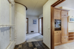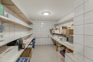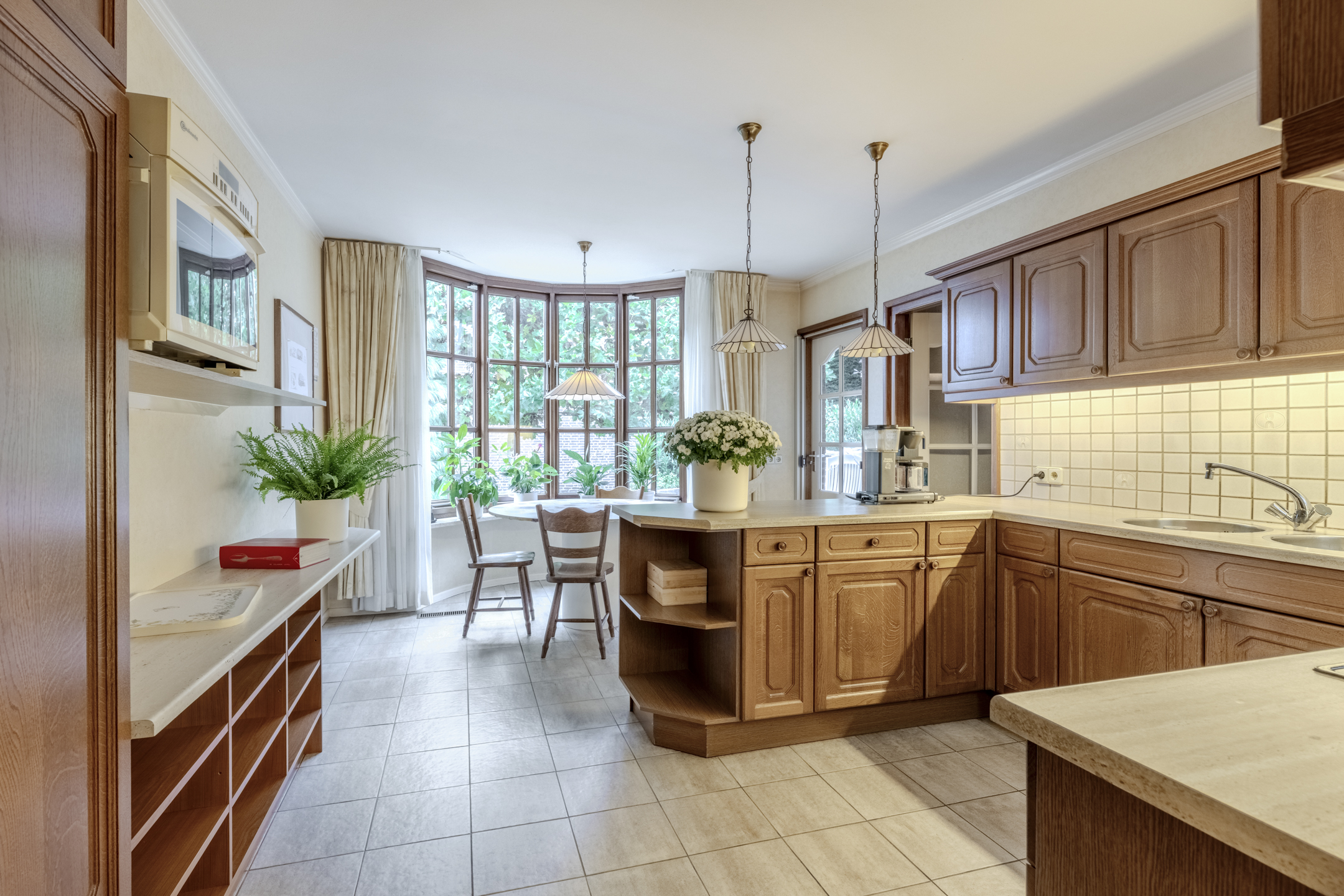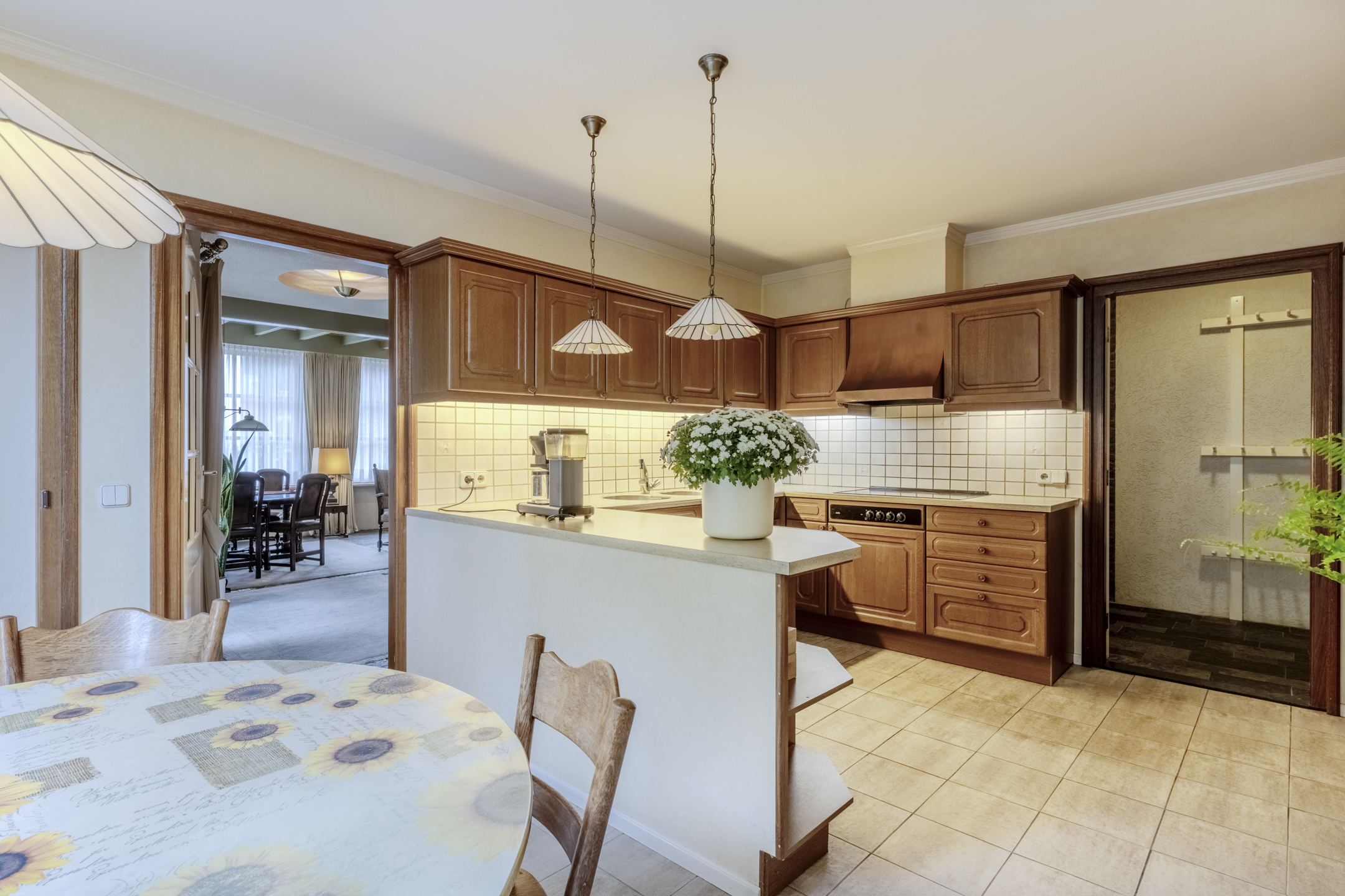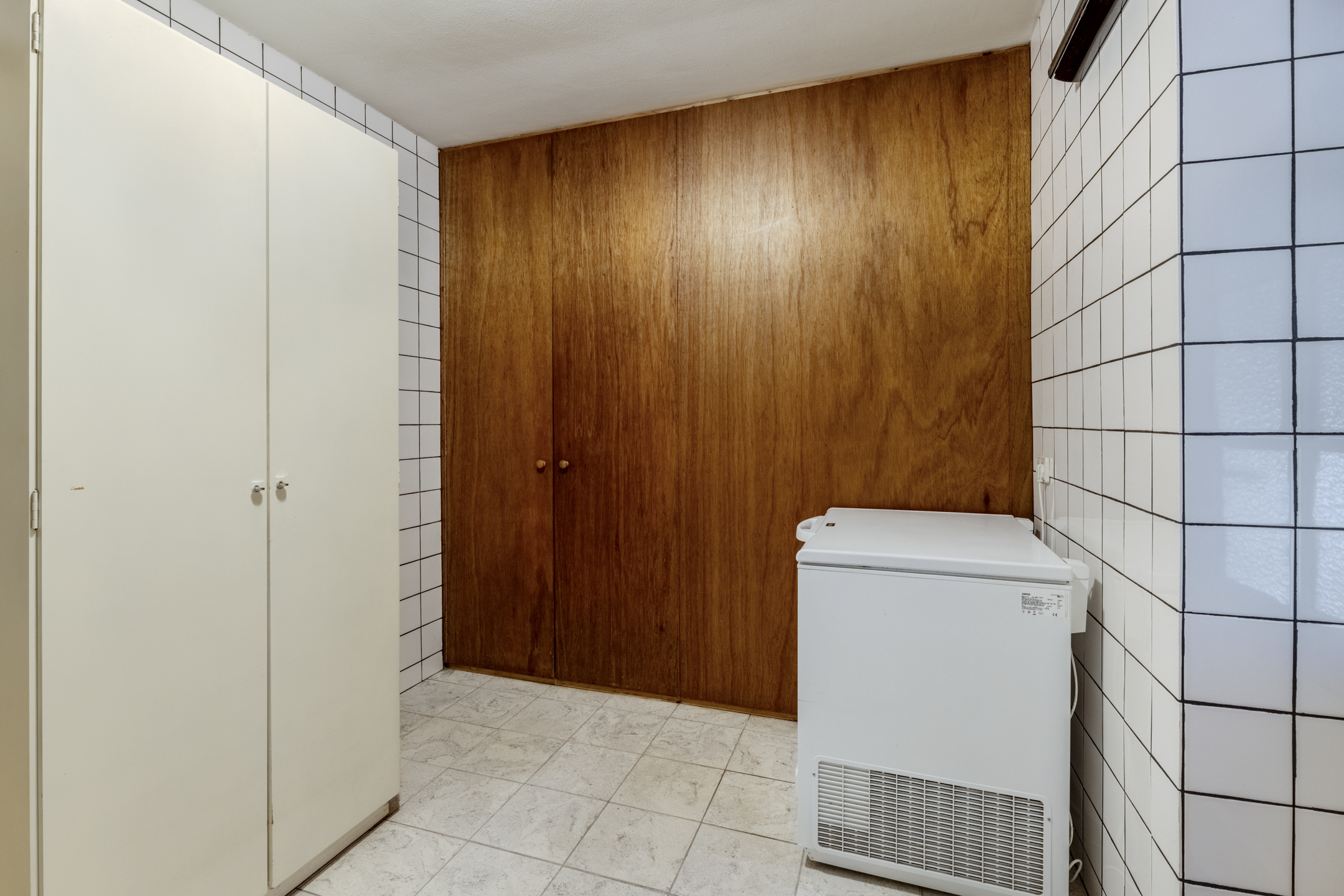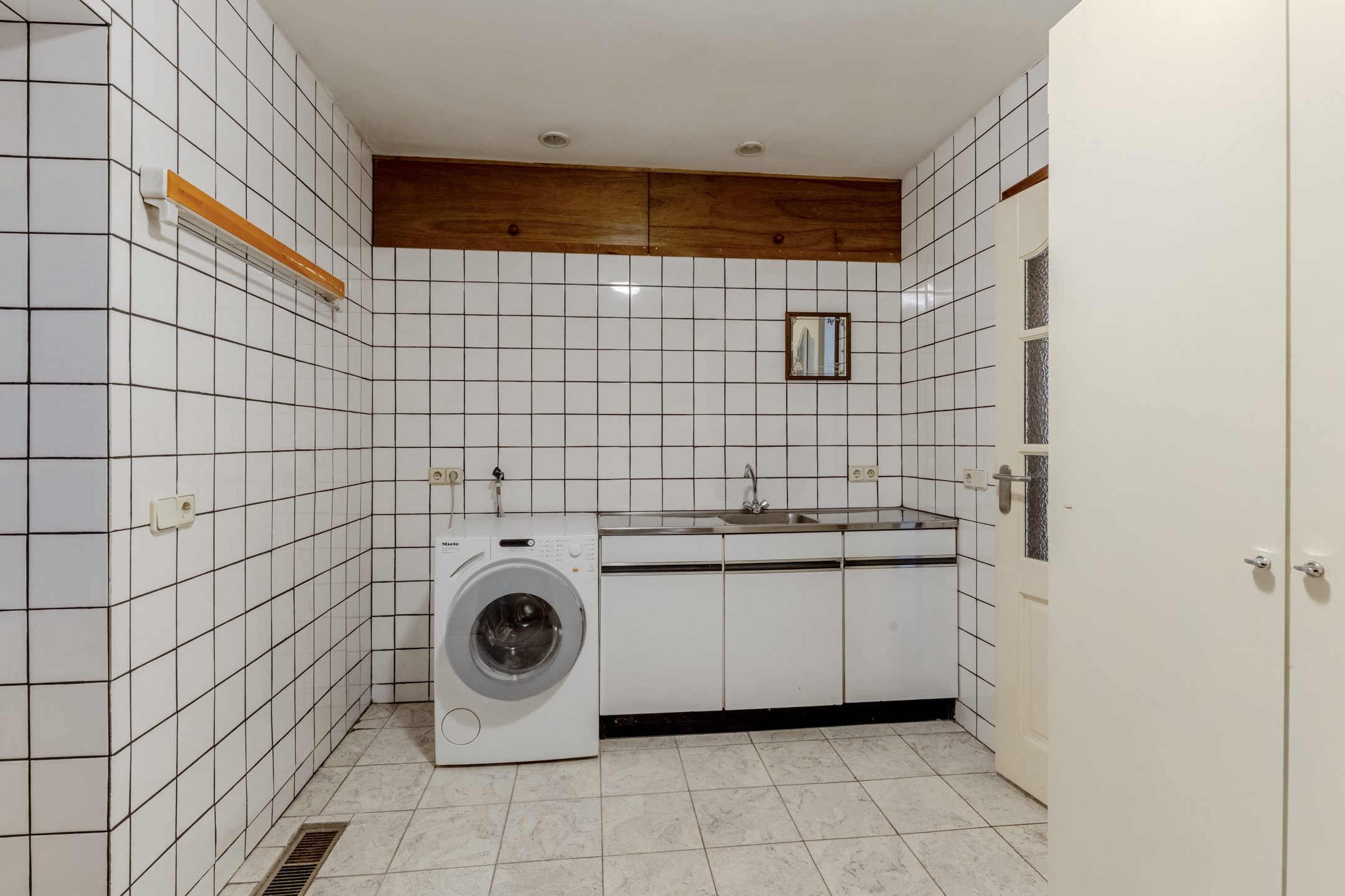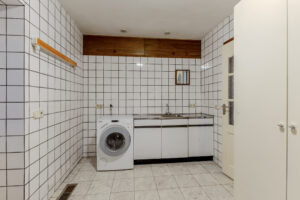 Praktische en betegelde bijkeuken voorzien van een keukenblok met spoelbak, inbouwkasten en de aansluitingen voor de wasapparatuur. Vanuit de bijkeuken is er toegang tot de dubbele garage.