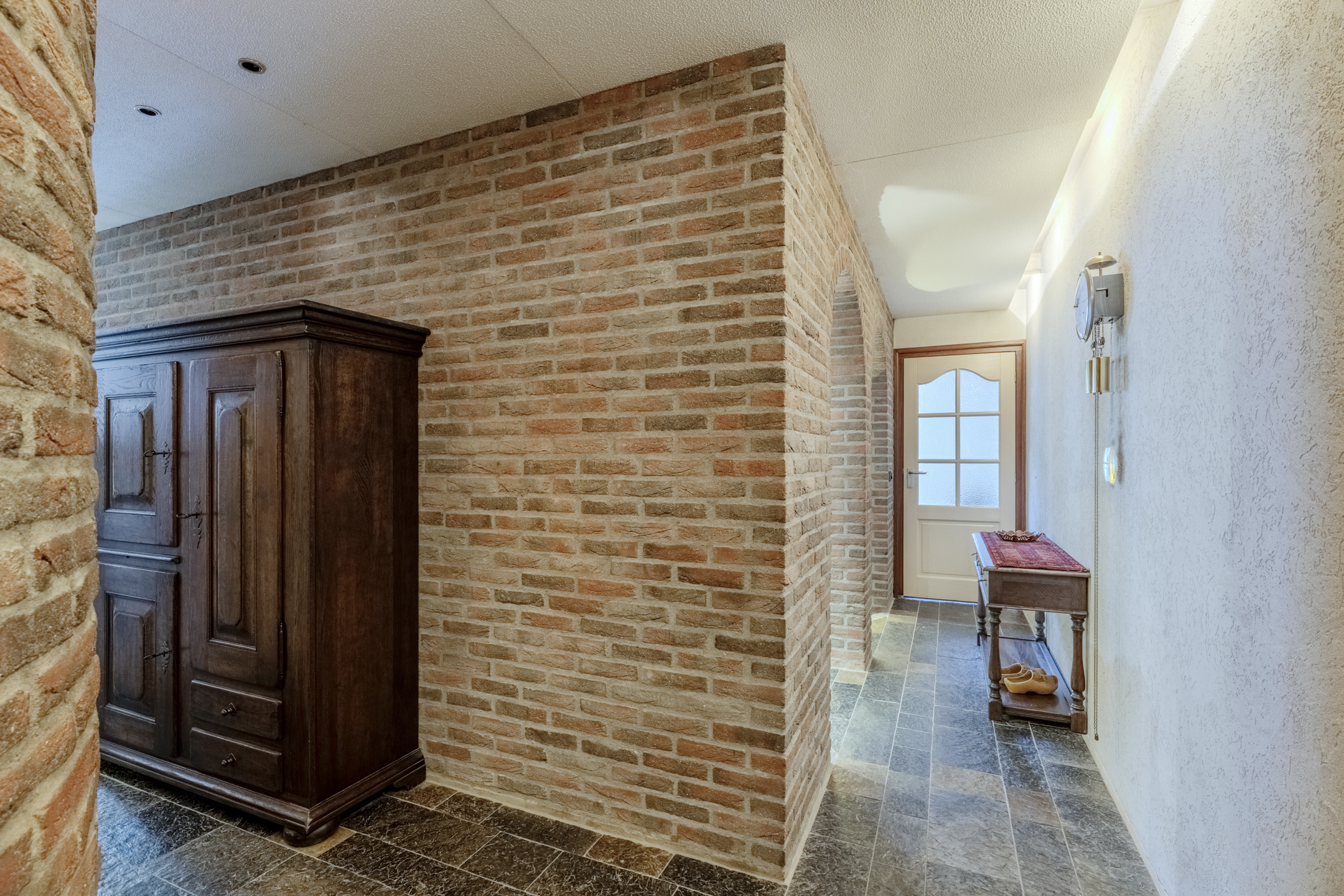 Entree, hal met leistenen vloer, de meterkast en een garderobe hoek. De hal geeft toegang tot de woonkamer.