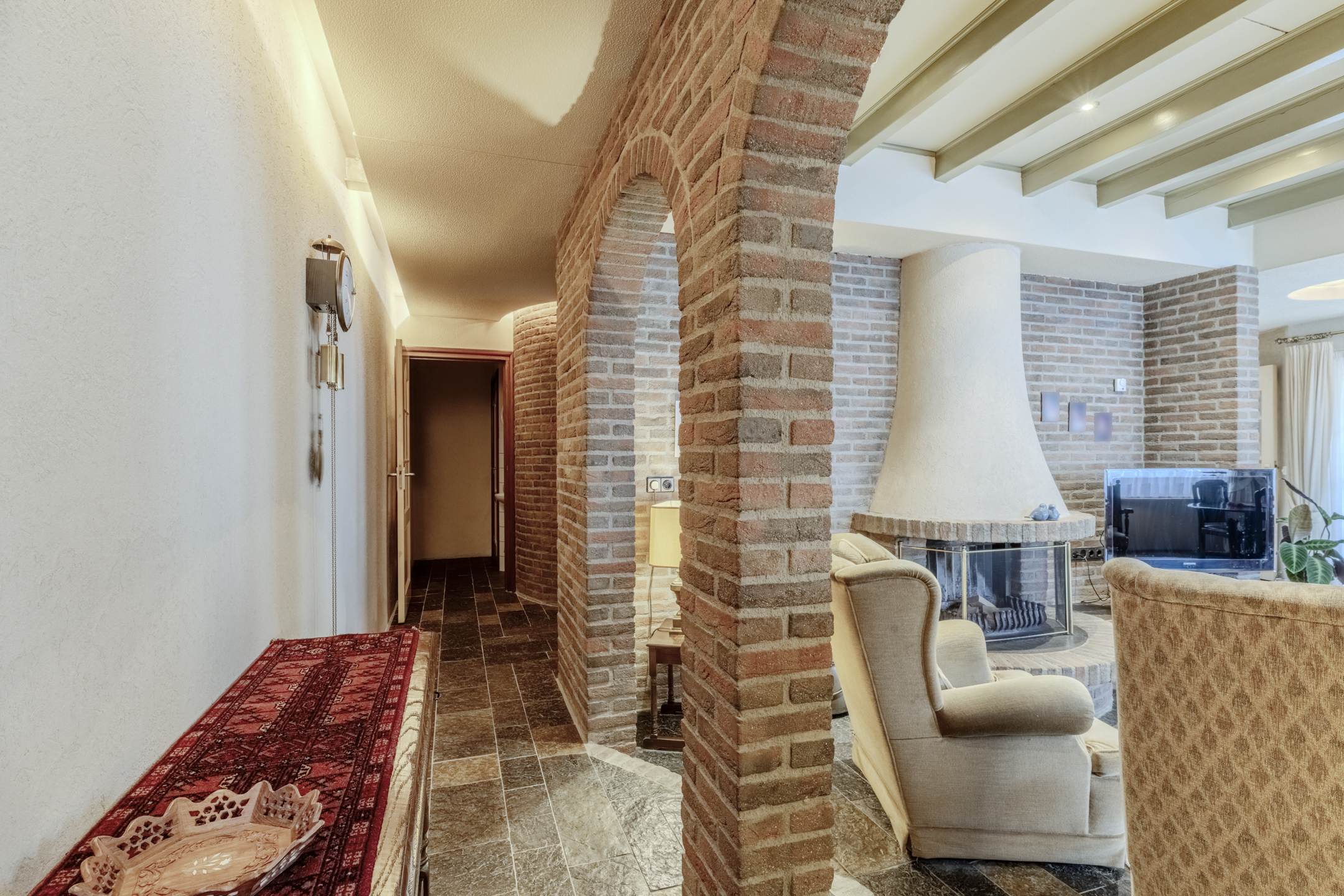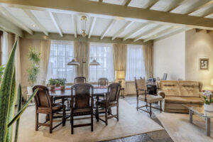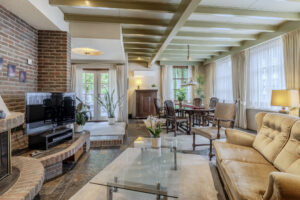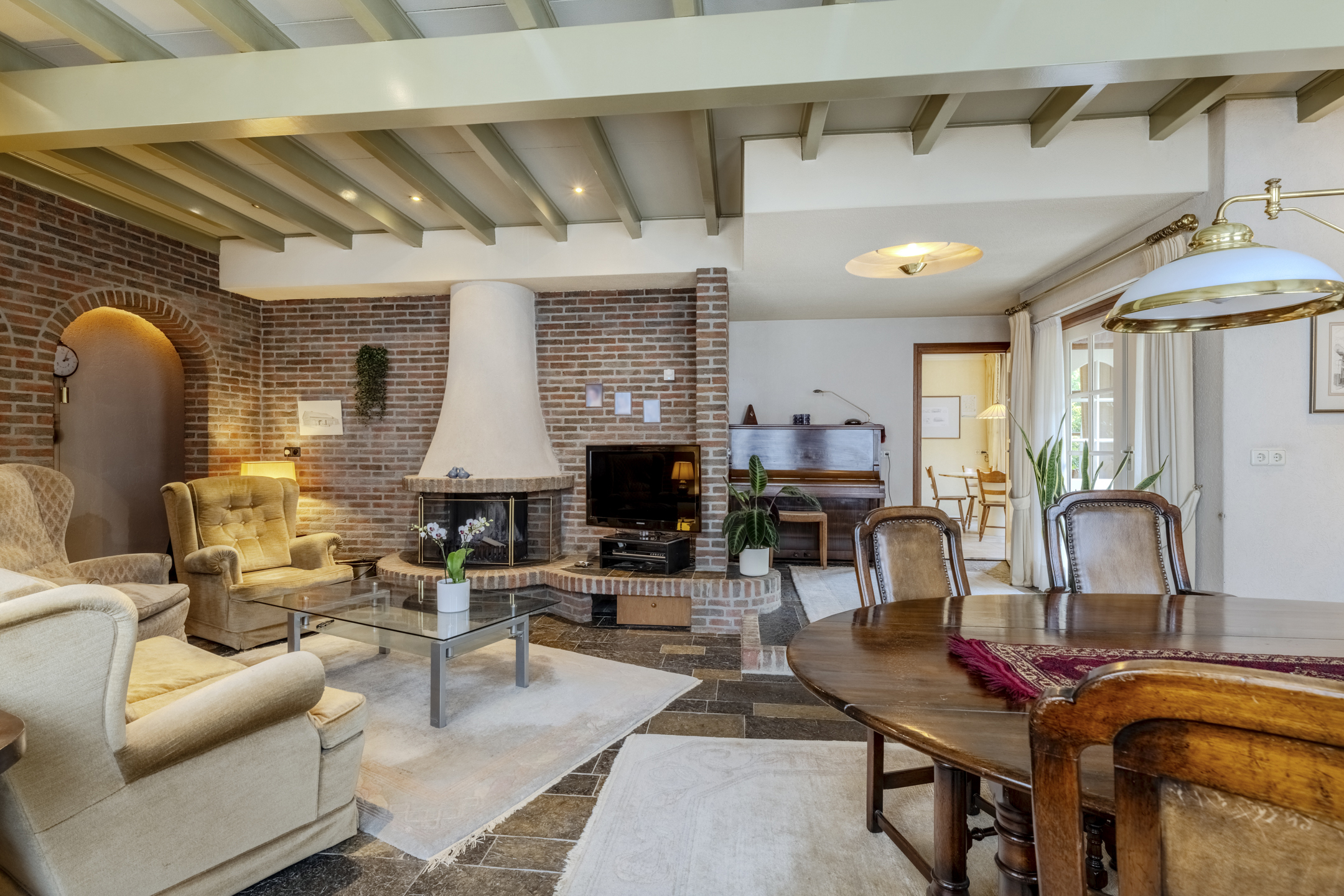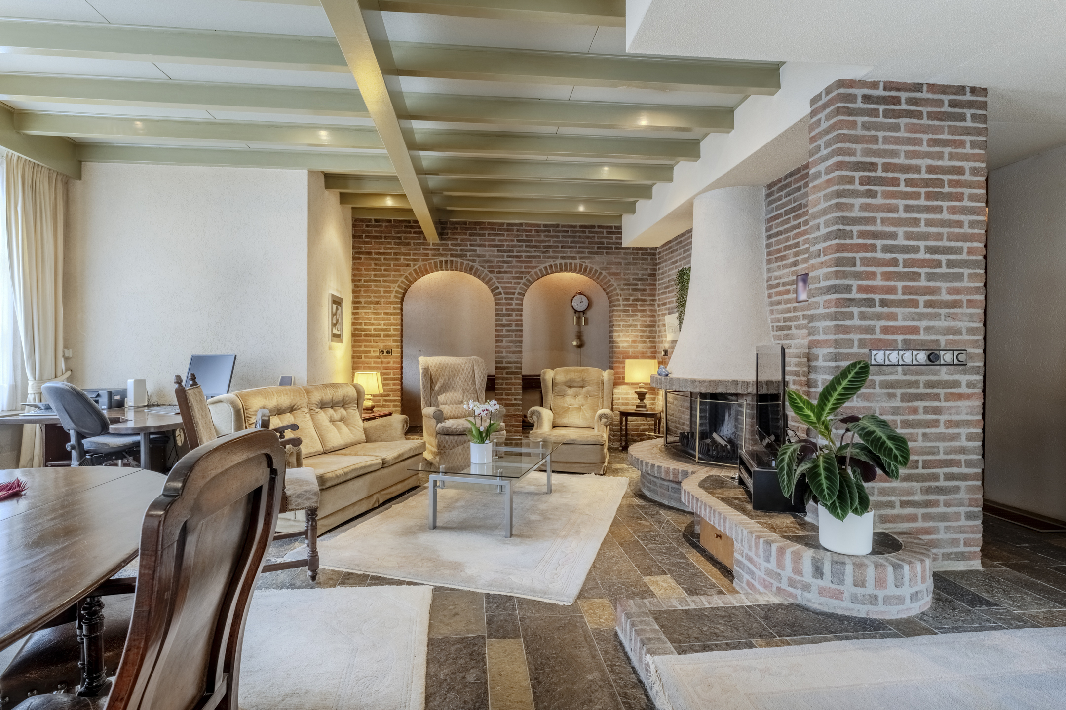Royale woonkamer circa 60m² met leistenen vloer voorzien van vloerverwarming, sfeervol balken plafond, open haard en twee openslaande tuindeuren.