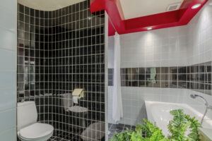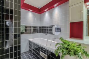 Ruime badkamer voorzien van vloerverwarming, vaste wastafel met meubel, ligbad, douche met thermostaatkraan en een toilet.