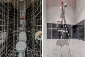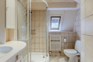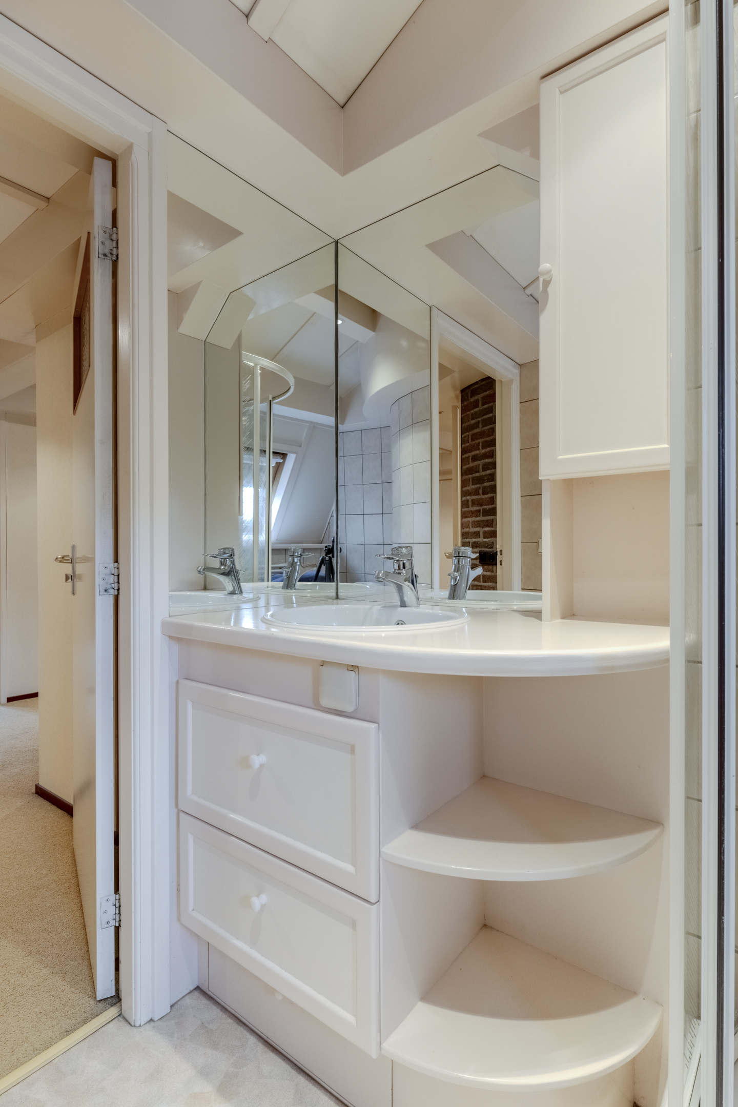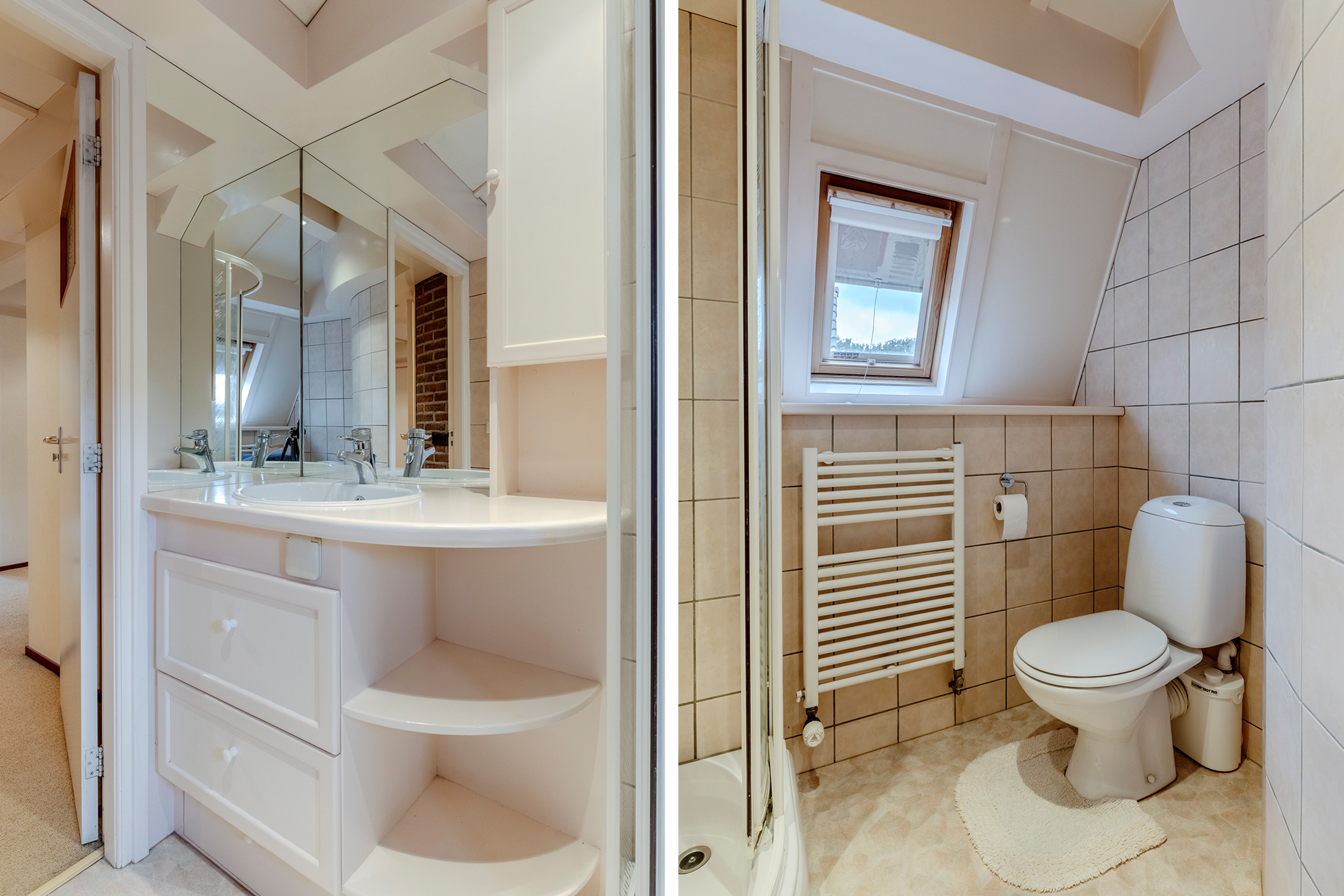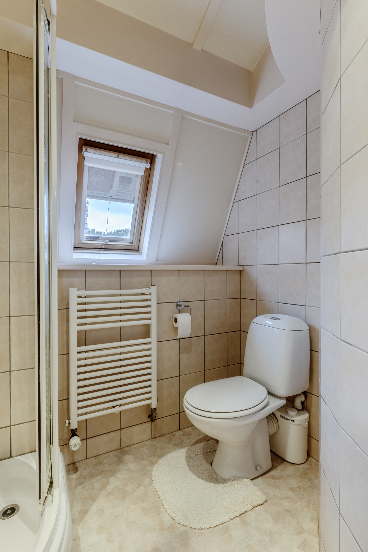 2e badkamer voorzien van een vaste wastafel met meubel, douche met thermostaatkraan en een toilet. In de badkamer is daarnaast een Velux dakraam aanwezig.
