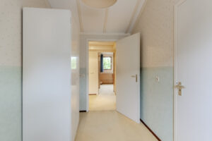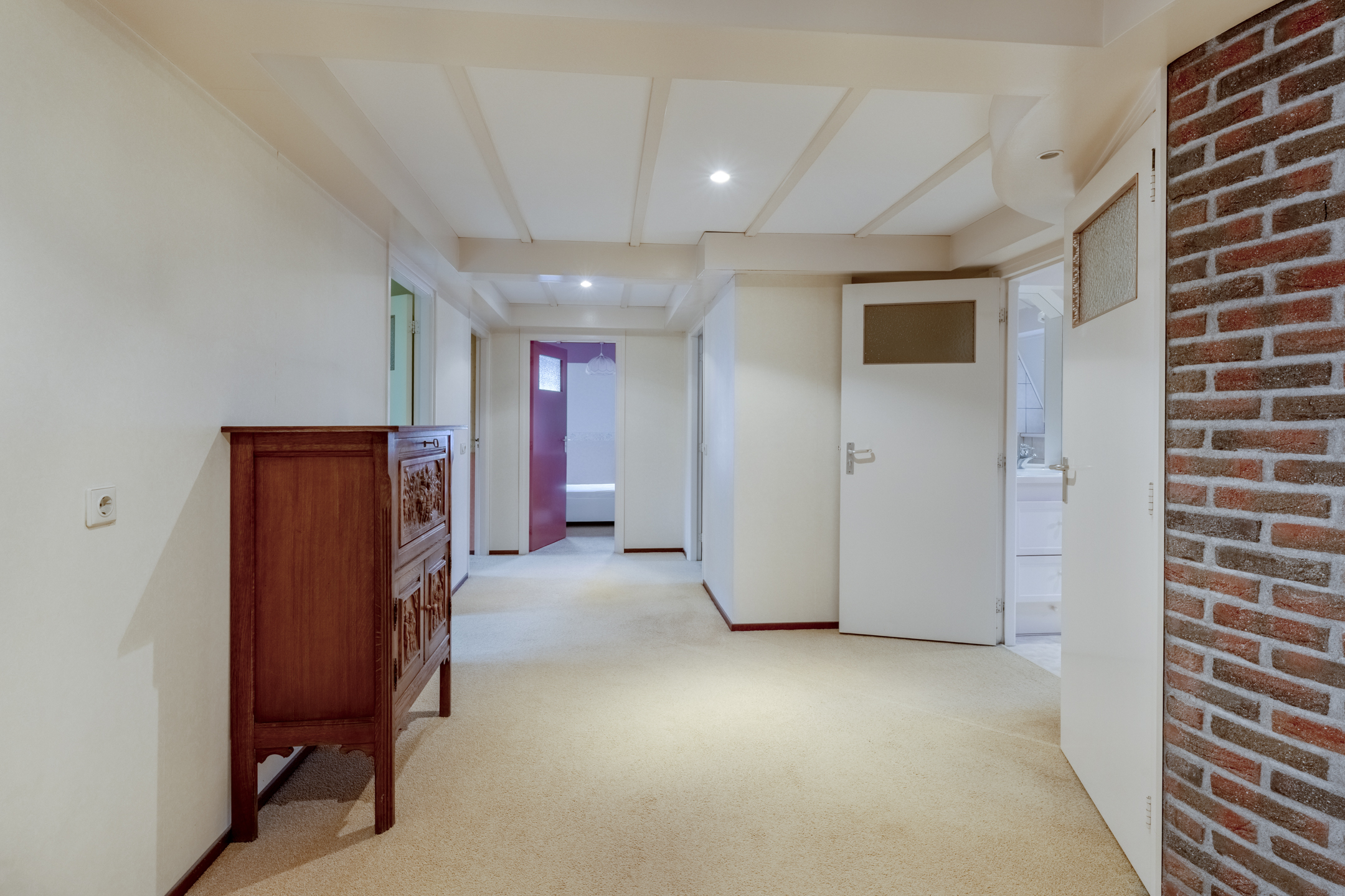 Aan de achterzijde is een hal gelegen die toegang geeft tot twee slaapkamers, een badkamer en de bijkeuken. Centraal in de hal bevindt zich de trapopgang naar de kelder en verdieping.