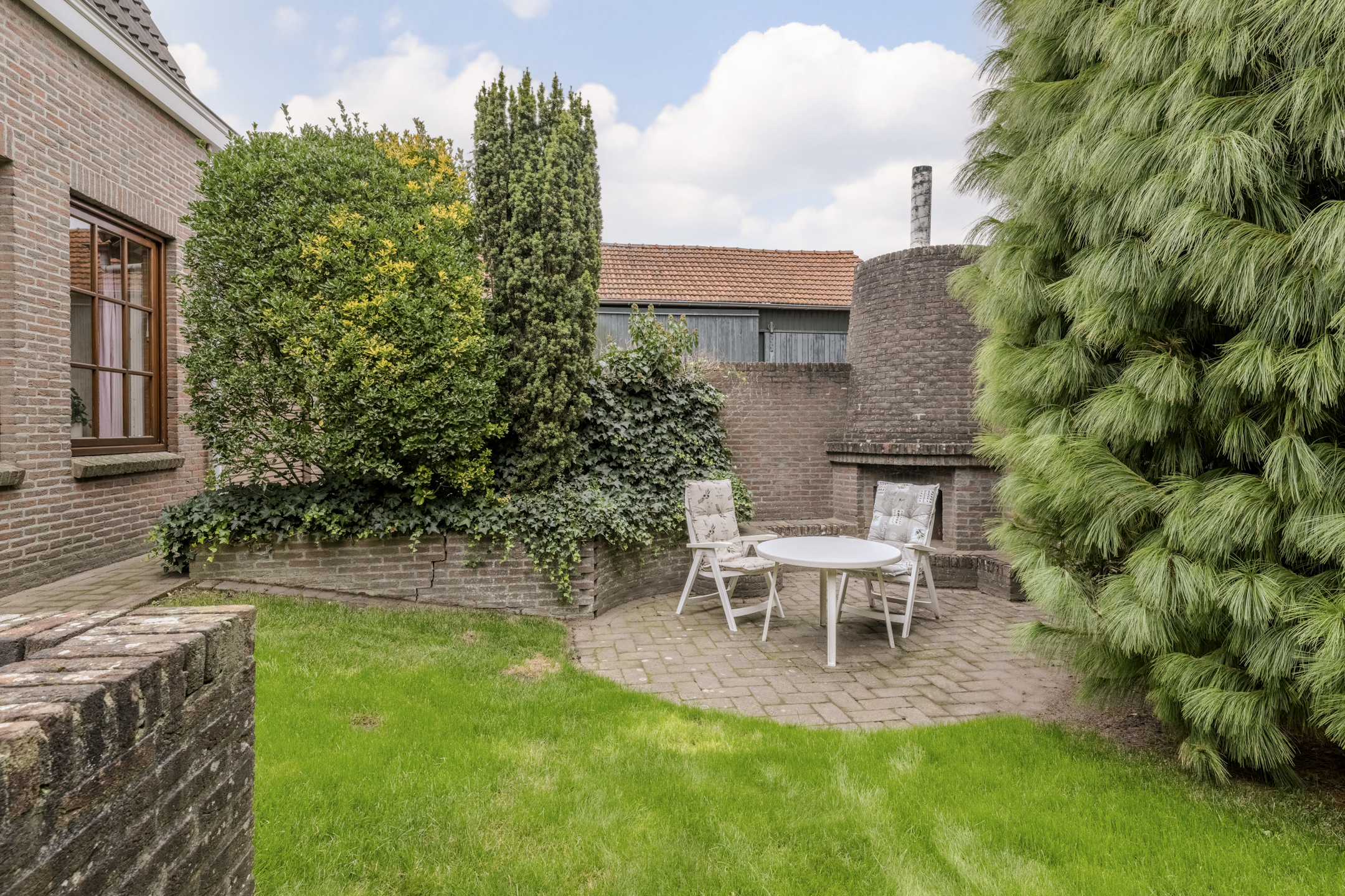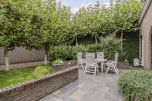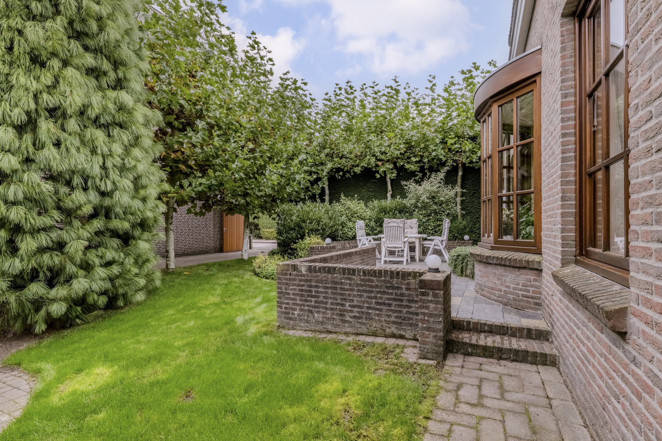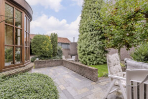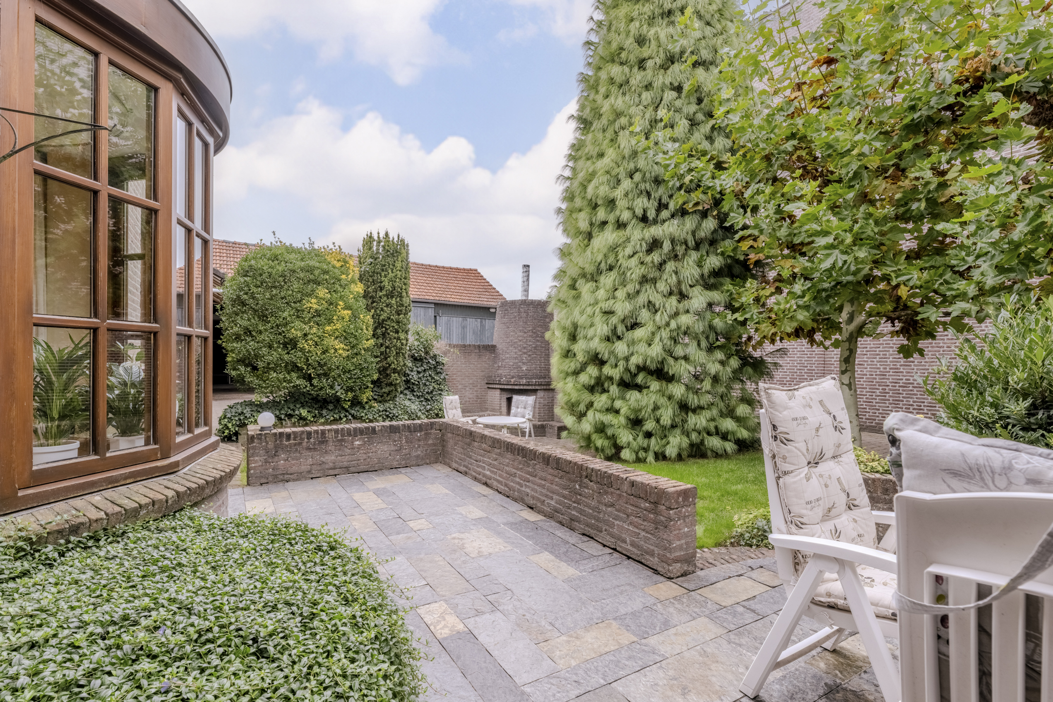 Aansluitend aan de woonkamer bevindt zich een verhoogd en gezellig terras. In de achtertuin is daarnaast een 2e terras met buitenhaard, graspartij en diverse borders.