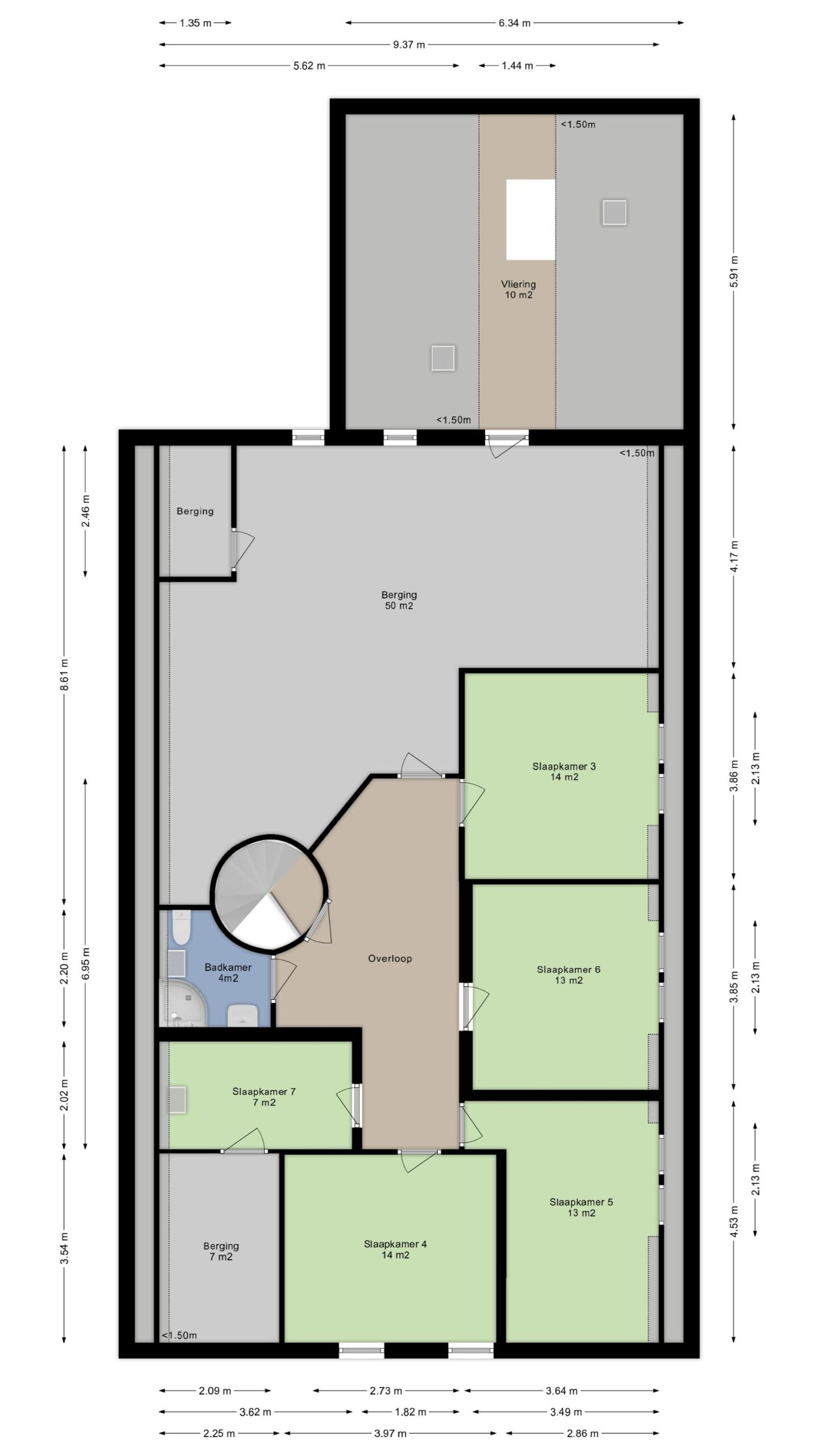Slaapkamer circa 14m², slaapkamer circa 7m² met inloopkast/ berging circa 7m², slaapkamer circa 13m² met dakkapel, slaapkamer circa 13m² met dakkapel en een slaapkamer circa 14m² met dakkapel.