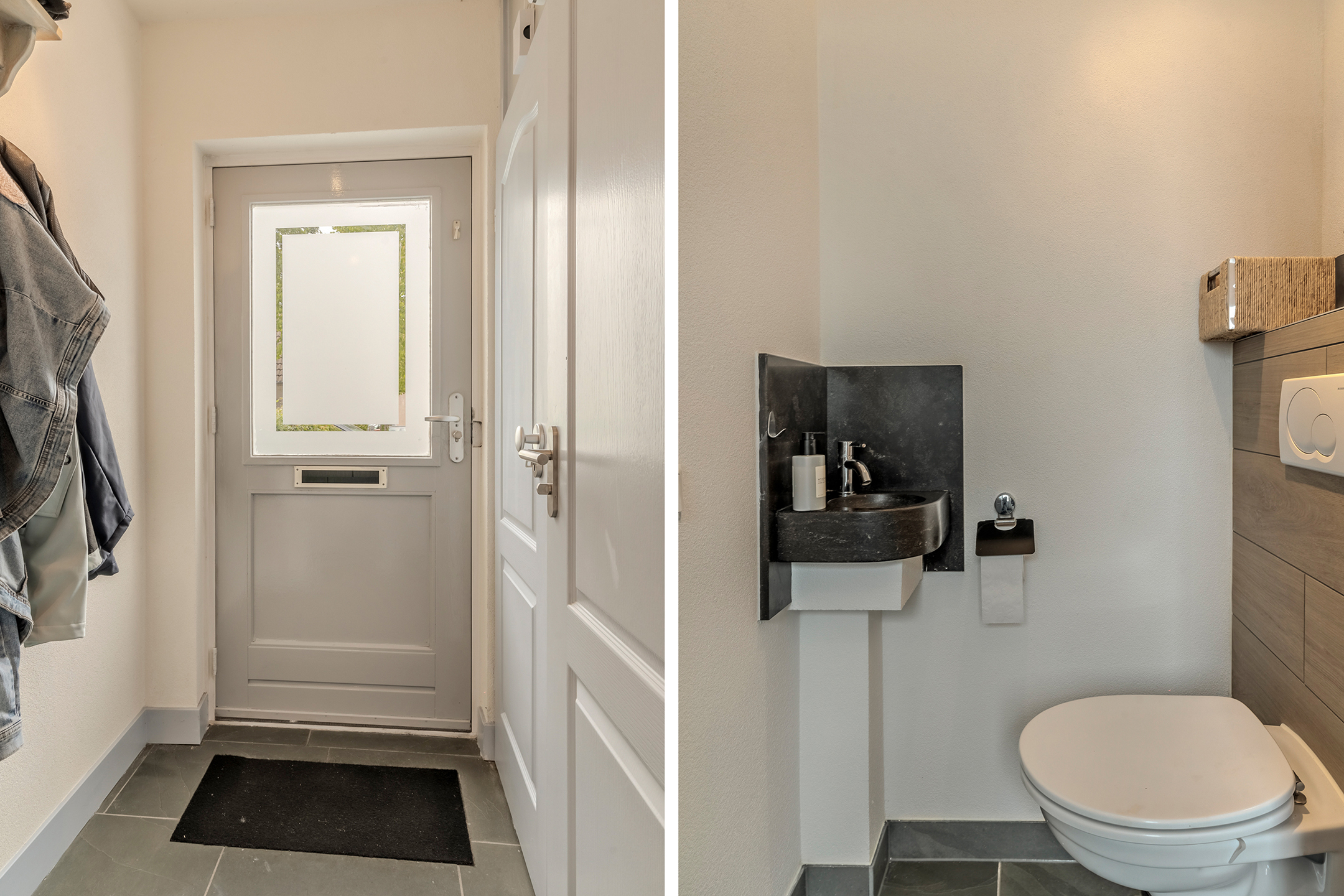 Entree, hal met grijze tegelvoer, vernieuwde meterkast (2023) en een moderne toiletruimte voorzien van een vrij hangend toilet met natuurstenen fontein.