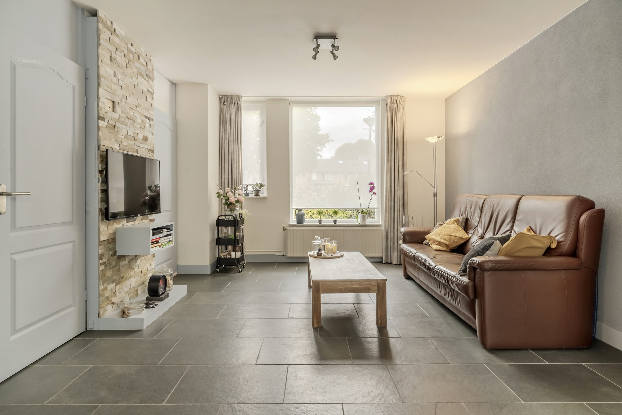 Op de begane grond bevindt zich grotendeels een moderne, doorlopende grijze tegelvloer.