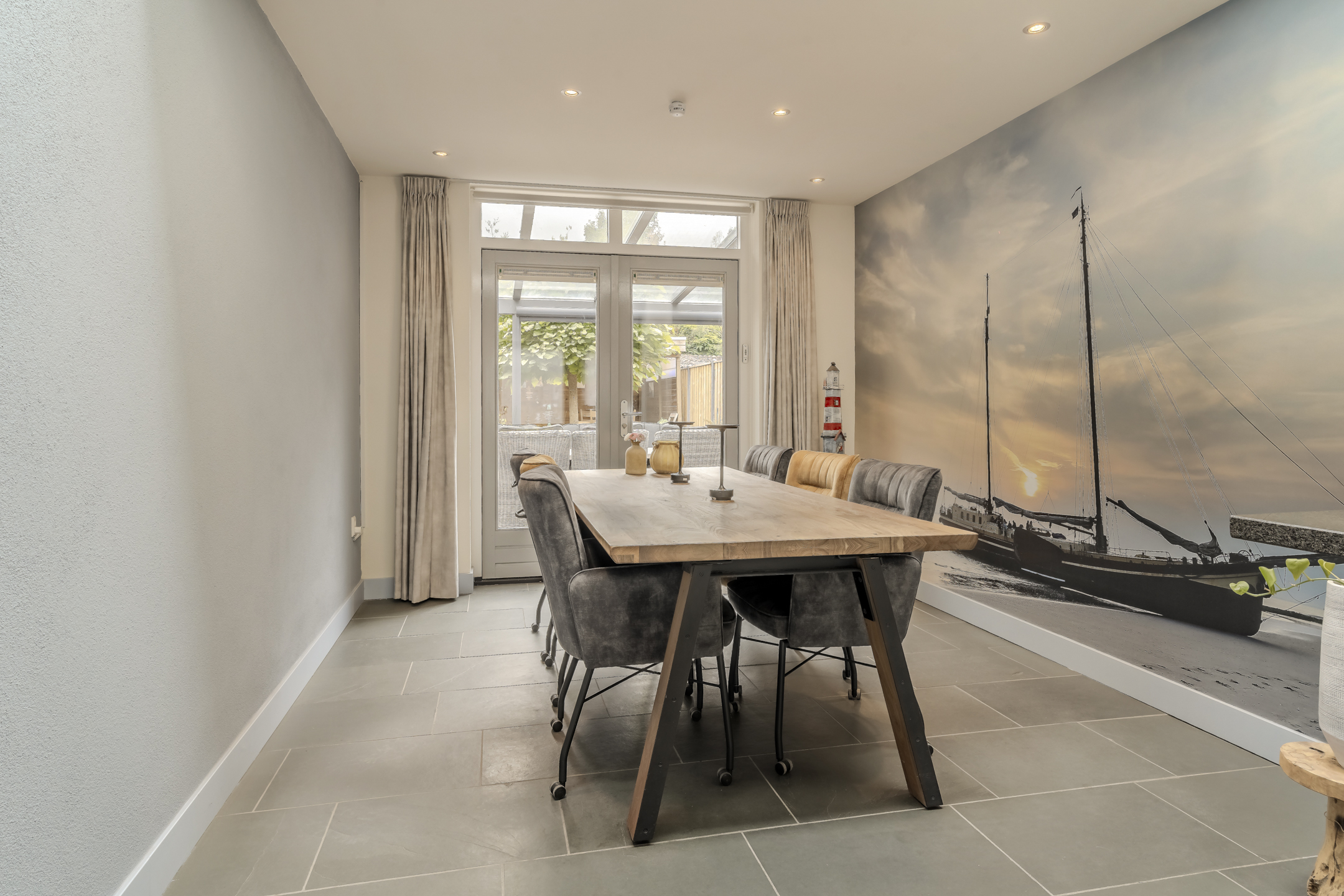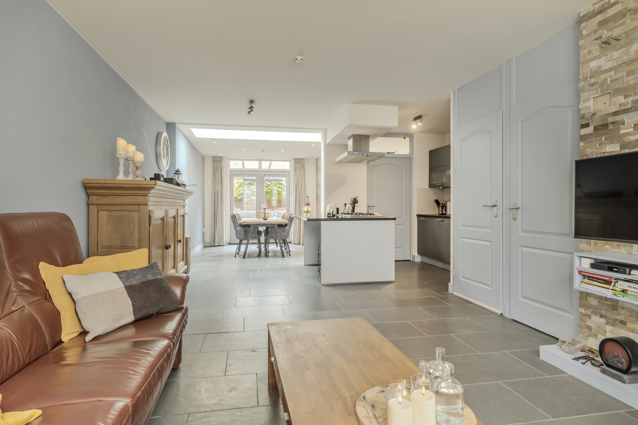 Sfeervolle en uitgebouwde woonkamer circa 41m² (inclusief keuken) met grijze tegelvloer voorzien van vloerverwarming, stucwerk wand- en plafondafwerking, trapkast en twee openslaande tuindeuren. In de uitbouw is een lichtstraat aanwezig.