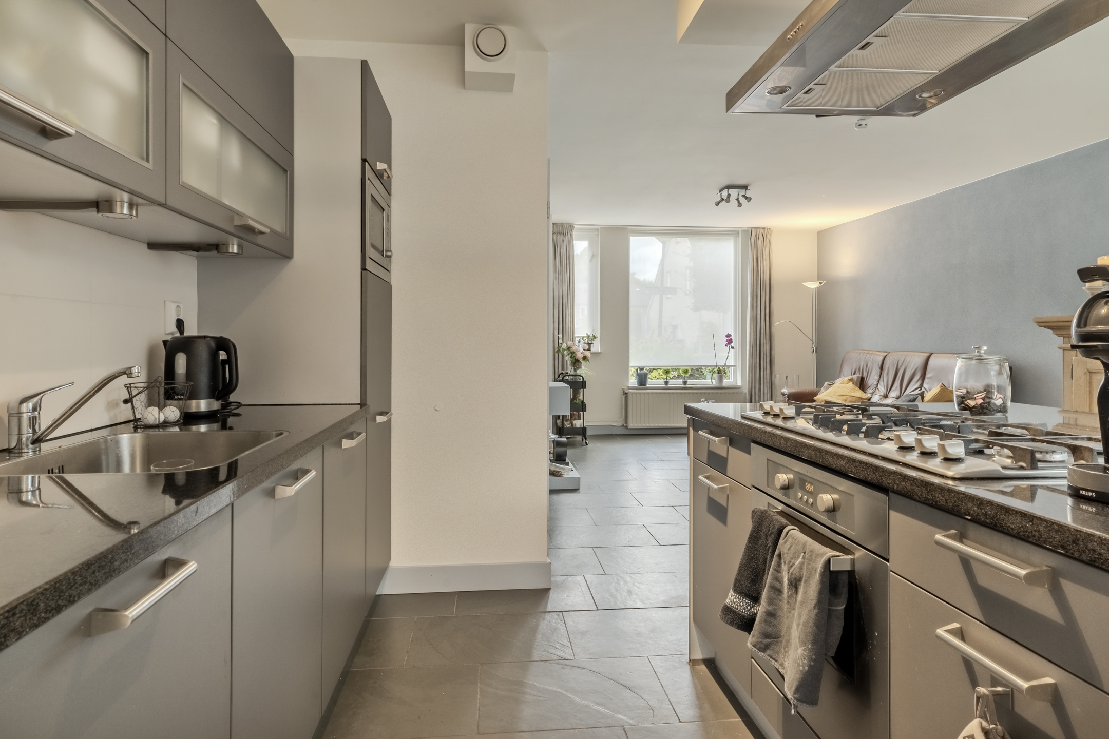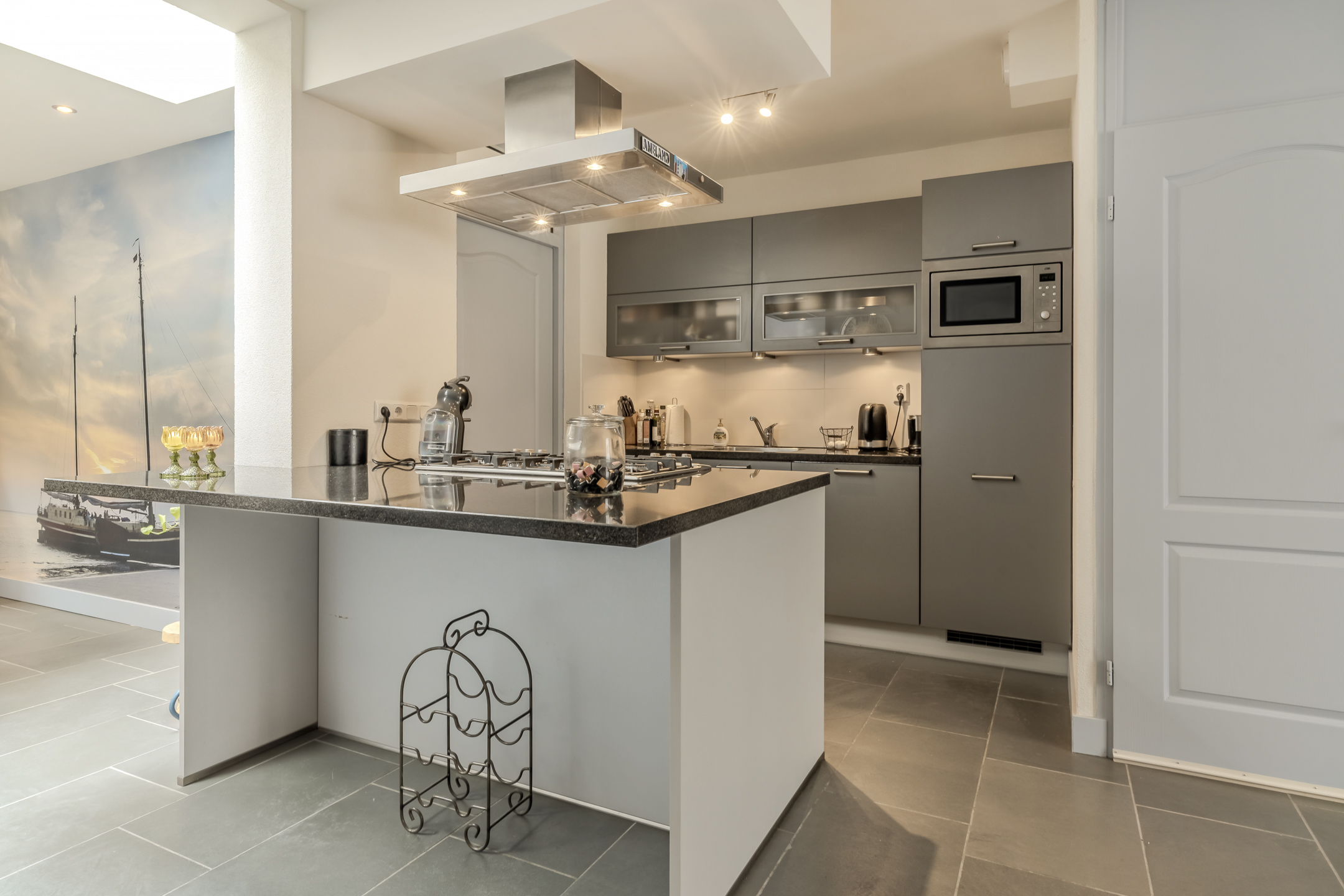 De keukeninrichting is voorzien van een granieten blad, 6-pits gaskookplaat, afzuigkap, koelkast (2023), oven, magnetron en een vaatwasser (2022).