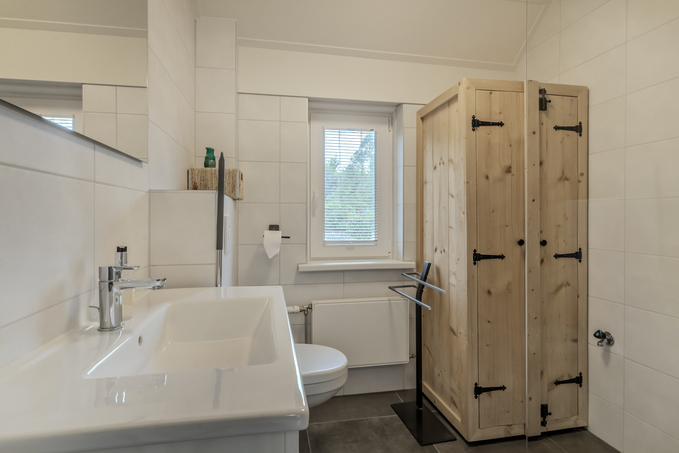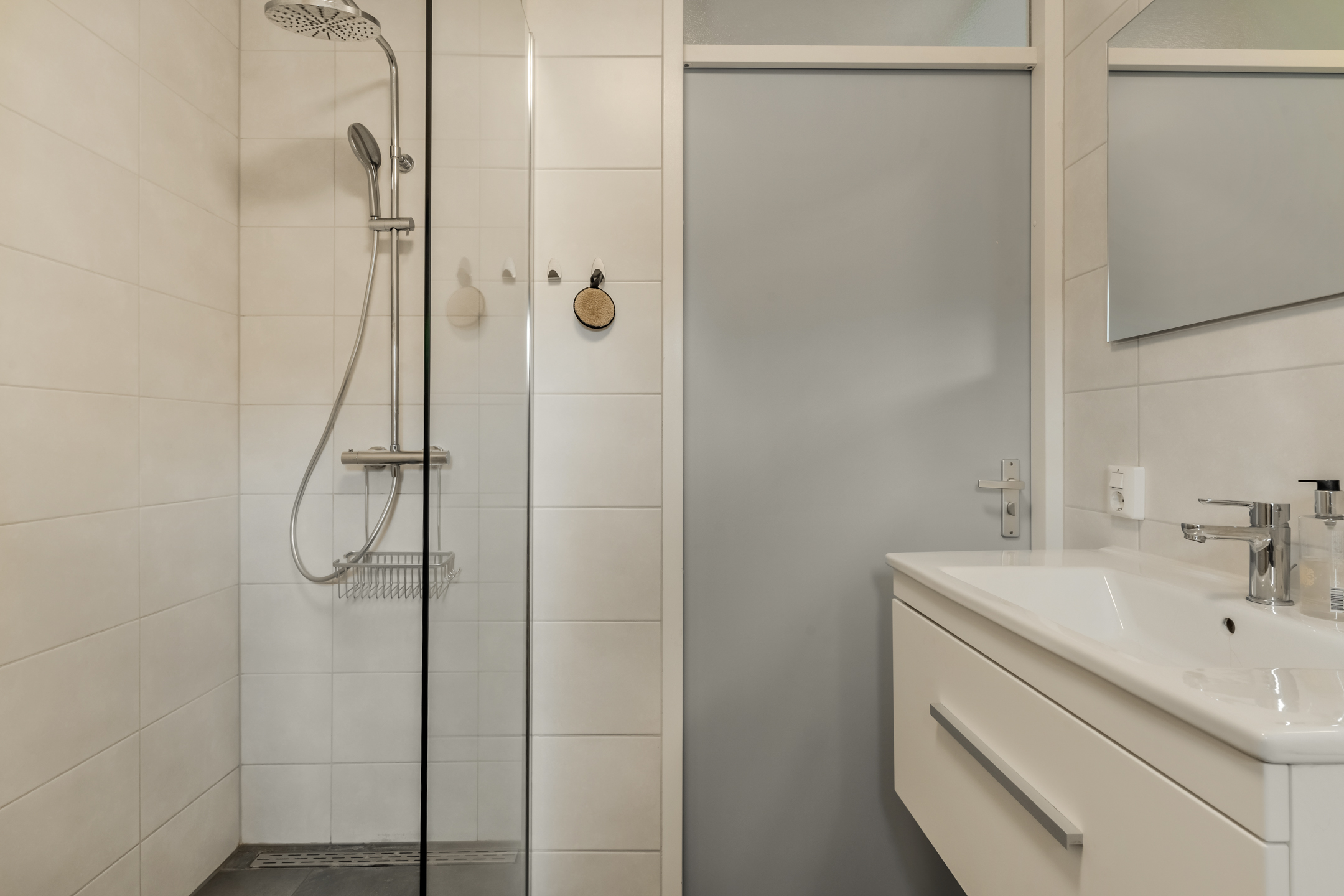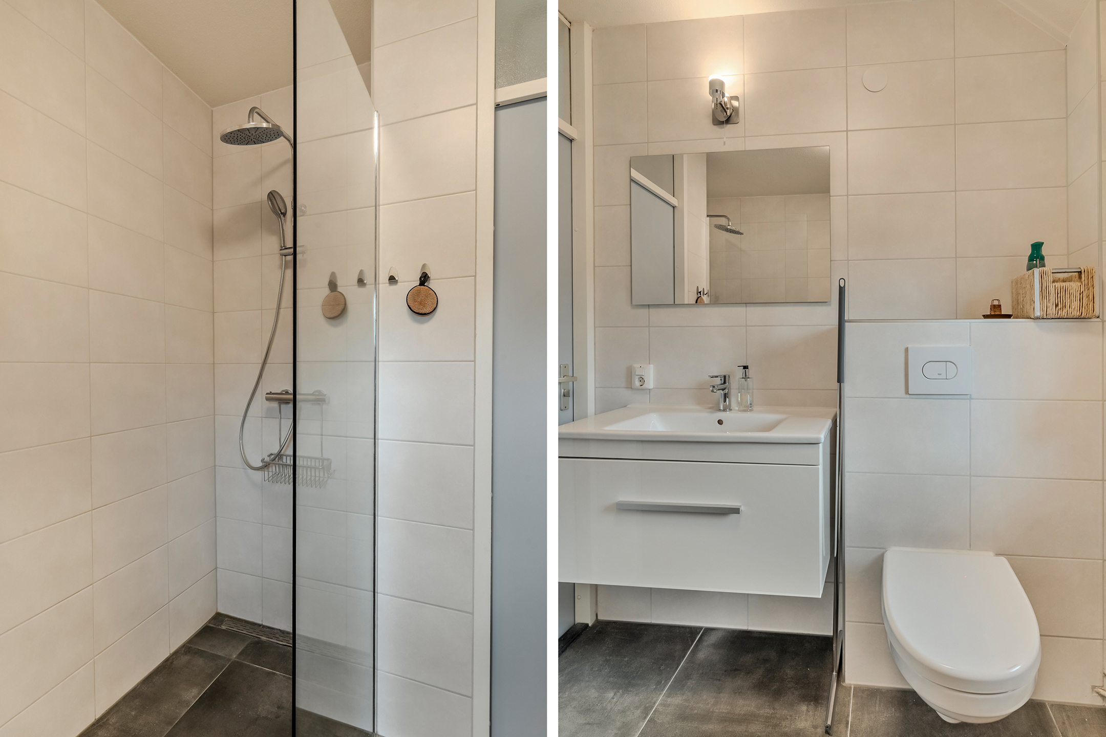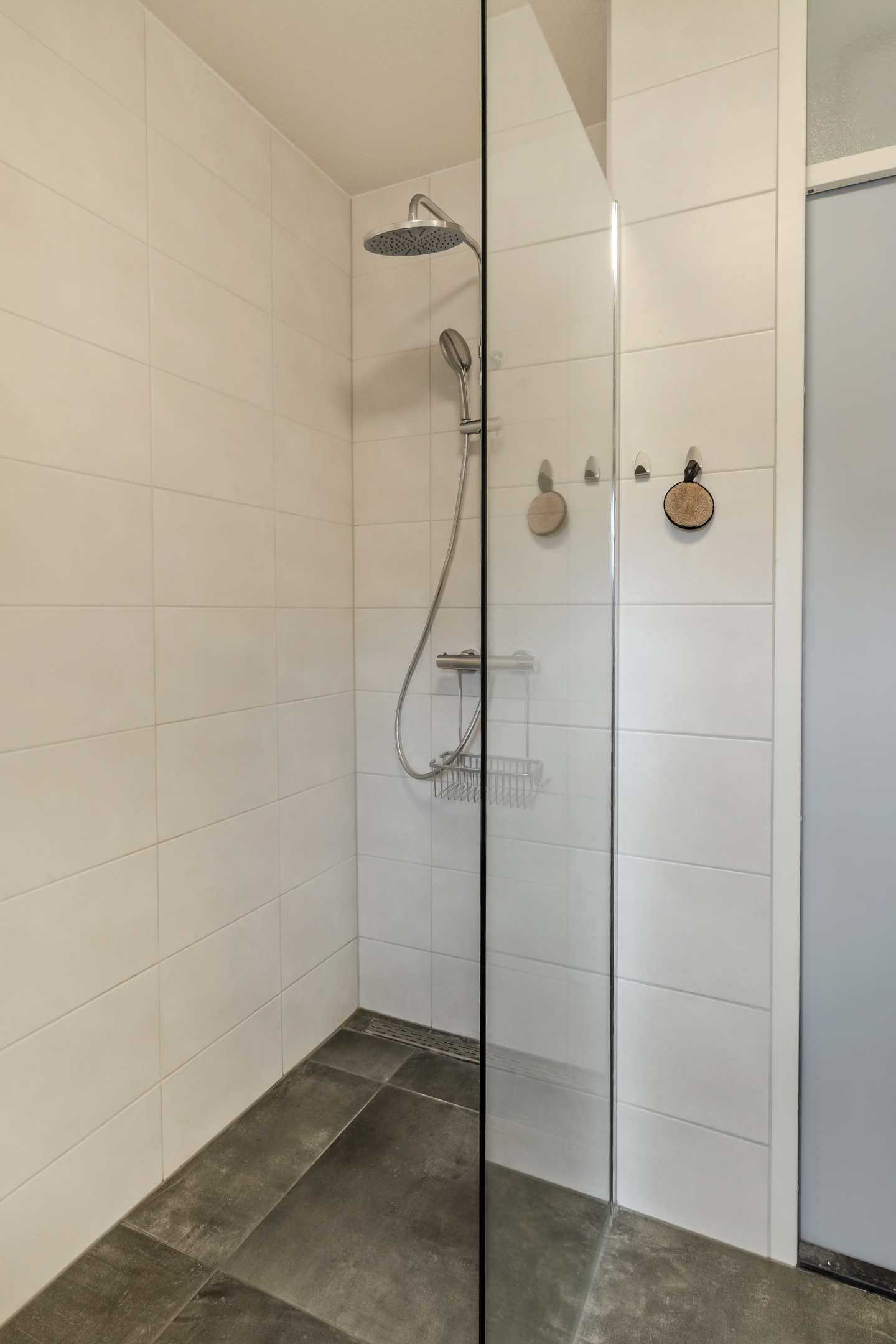 Moderne badkamer voorzien van een vaste wastafel met meubel en spiegel, inloopdouche met regendouche en een vrij hangend toilet.