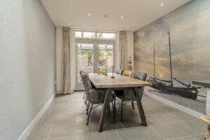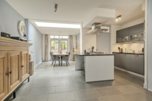 Sfeervolle en uitgebouwde woonkamer circa 41m² (inclusief keuken) met grijze tegelvloer voorzien van vloerverwarming, stucwerk wand- en plafondafwerking, trapkast en twee openslaande tuindeuren. In de uitbouw is een lichtstraat aanwezig.