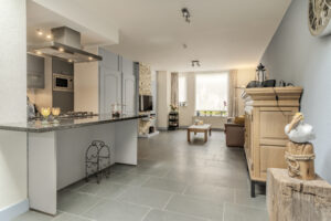Op de begane grond bevindt zich grotendeels een moderne, doorlopende grijze tegelvloer.