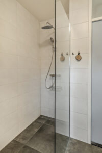 Moderne badkamer voorzien van een vaste wastafel met meubel en spiegel, inloopdouche met regendouche en een vrij hangend toilet.