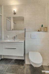 Entree, hal met grijze tegelvoer, vernieuwde meterkast (2023) en een moderne toiletruimte voorzien van een vrij hangend toilet met natuurstenen fontein.