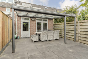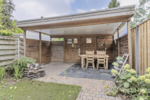 Achterin de tuin bevindt zich een gezellige grote houten overkapping. Er zijn daarnaast nog een achterom en stenen berging aanwezig.