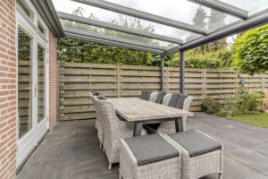 De diepe achtertuin is op het zonnige zuiden gelegen. Aansluitend aan de woonkamer bevindt zich een gezellige aluminium overkapping met veel glas en een elektrisch bedienbare zonwering (aan de onderzijde) en een elektrisch bedienbaar screen (aan de voorzijde).