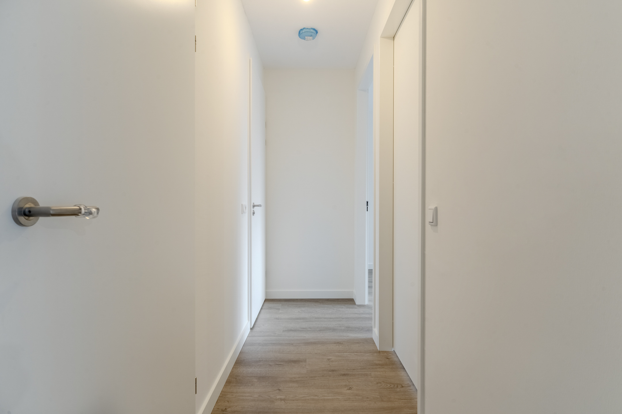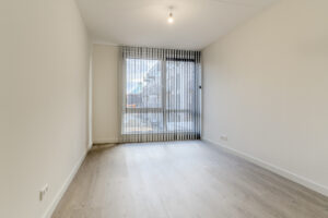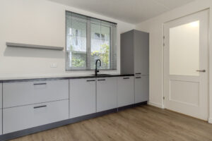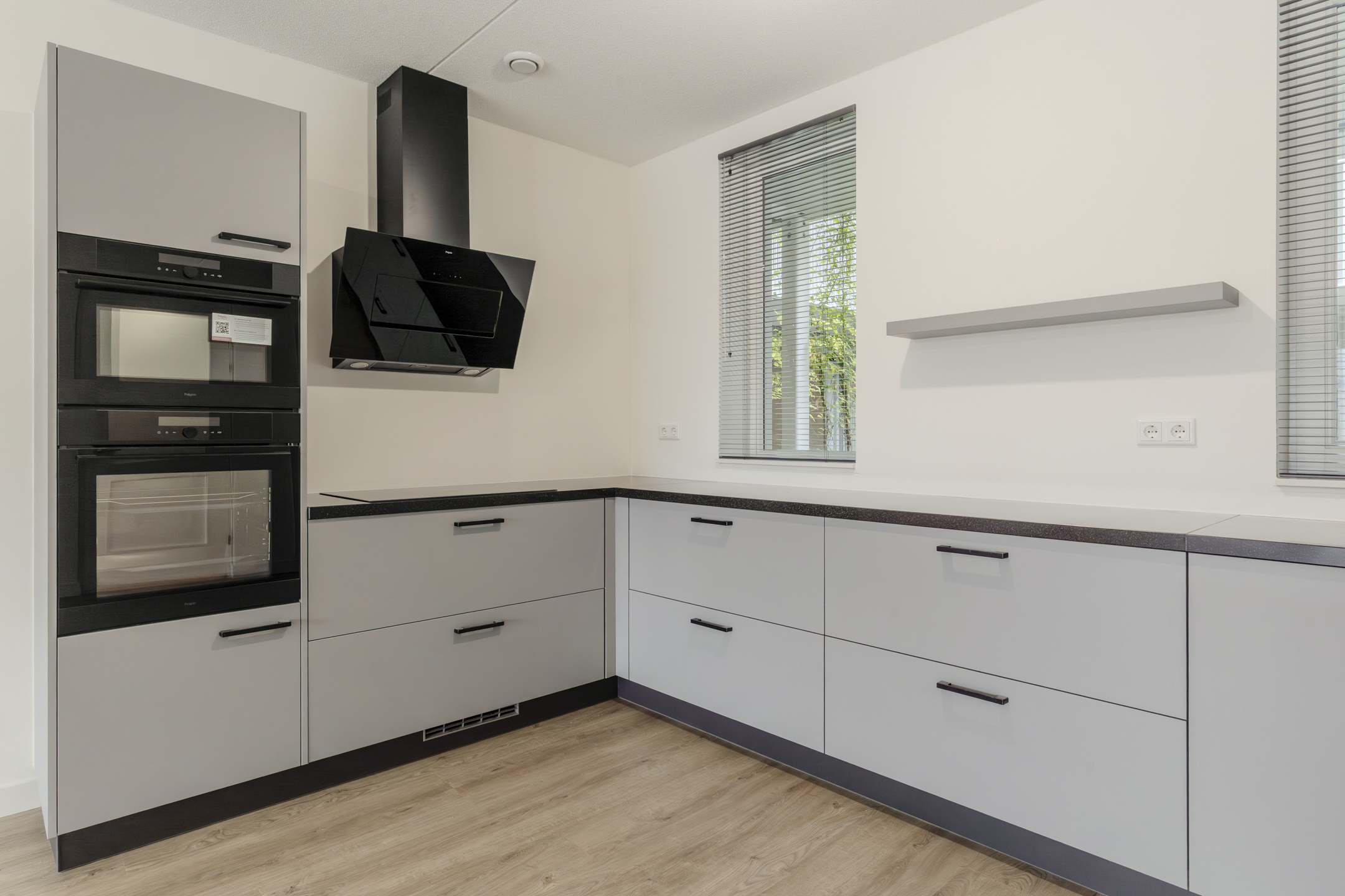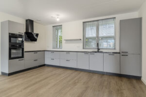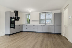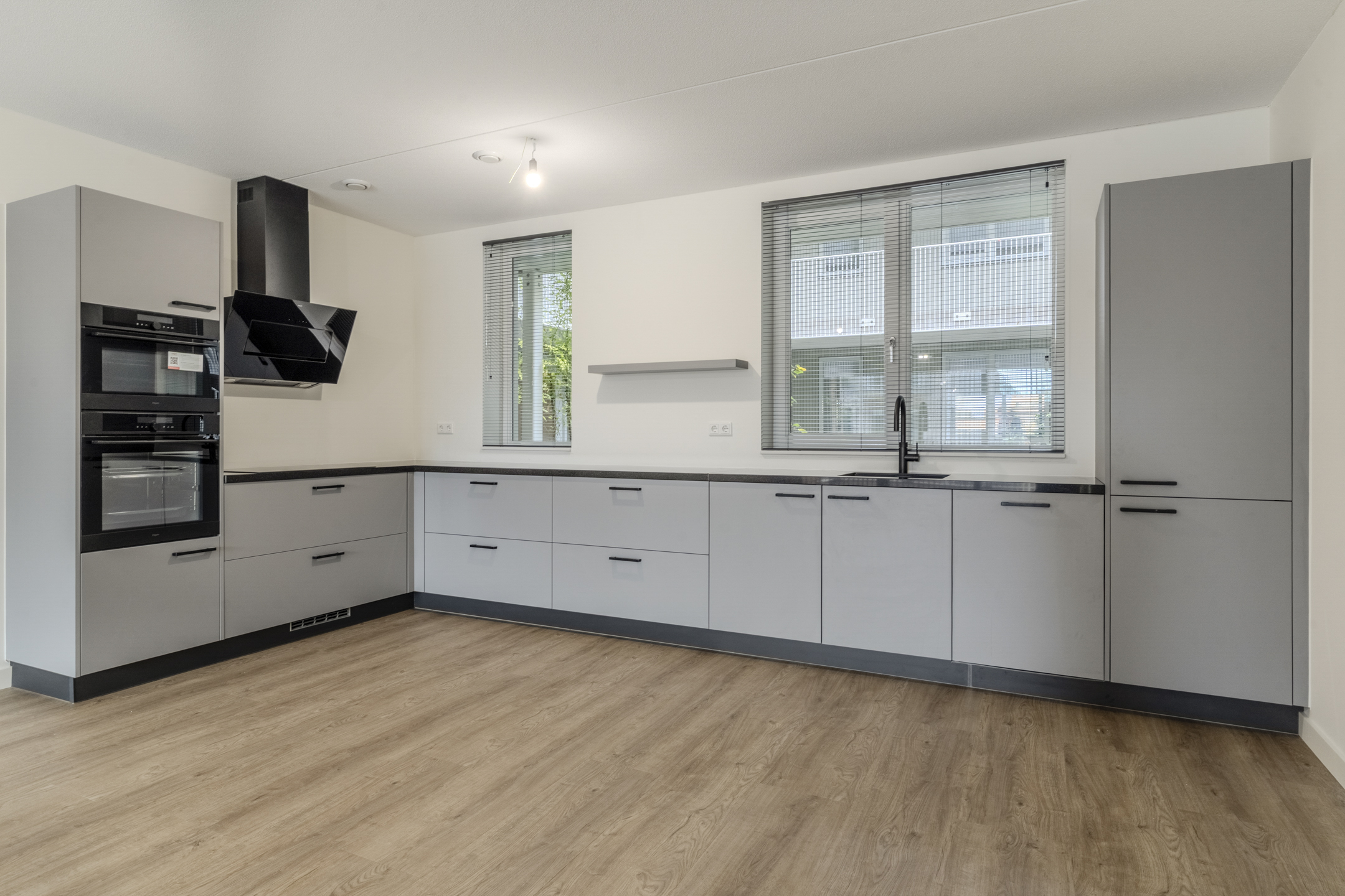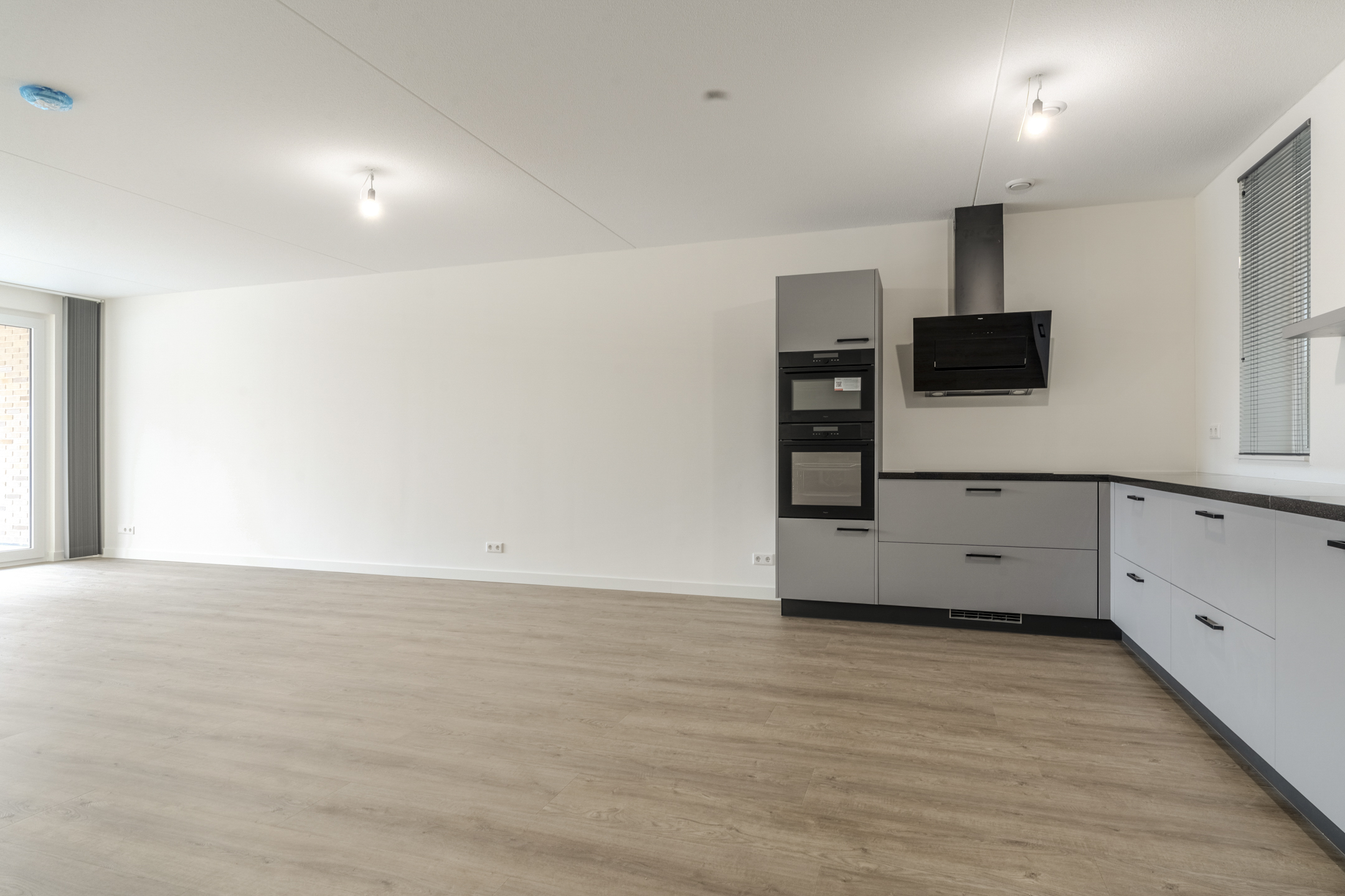 Entree/hal met toegang tot de meterkast, een praktische slaap-/werk-/hobby-/garderobekamer van ca. 7m² en een deels betegelde toiletruimte met wandcloset en fontein met onderbouwkastje, spiegel, closetrolhouder- en borstel en handdoekhaakje. Vanuit de hal komt u in de ruime, lichte living met toegang tot het balkon van ca. 11m² gelegen op het oosten. Het balkon is voorzien van een elektrisch uitvalscherm. De open keuken is voorzien van een luxe keukeninrichting met volop kastjes en lades en diverse inbouwapparatuur, te weten: een vaatwasmachine, heteluchtoven, multifunctionele oven met magnetronfunctie, inductiekookplaat met afzuigkap, koel-/vriescombinatie, spoelbak en een Quooker kraan. Op de vloer ligt een fraaie PVC vloer, aan de balkonzijde zijn er lamellen aanwezig en aan de keukenzijde luxaflex.