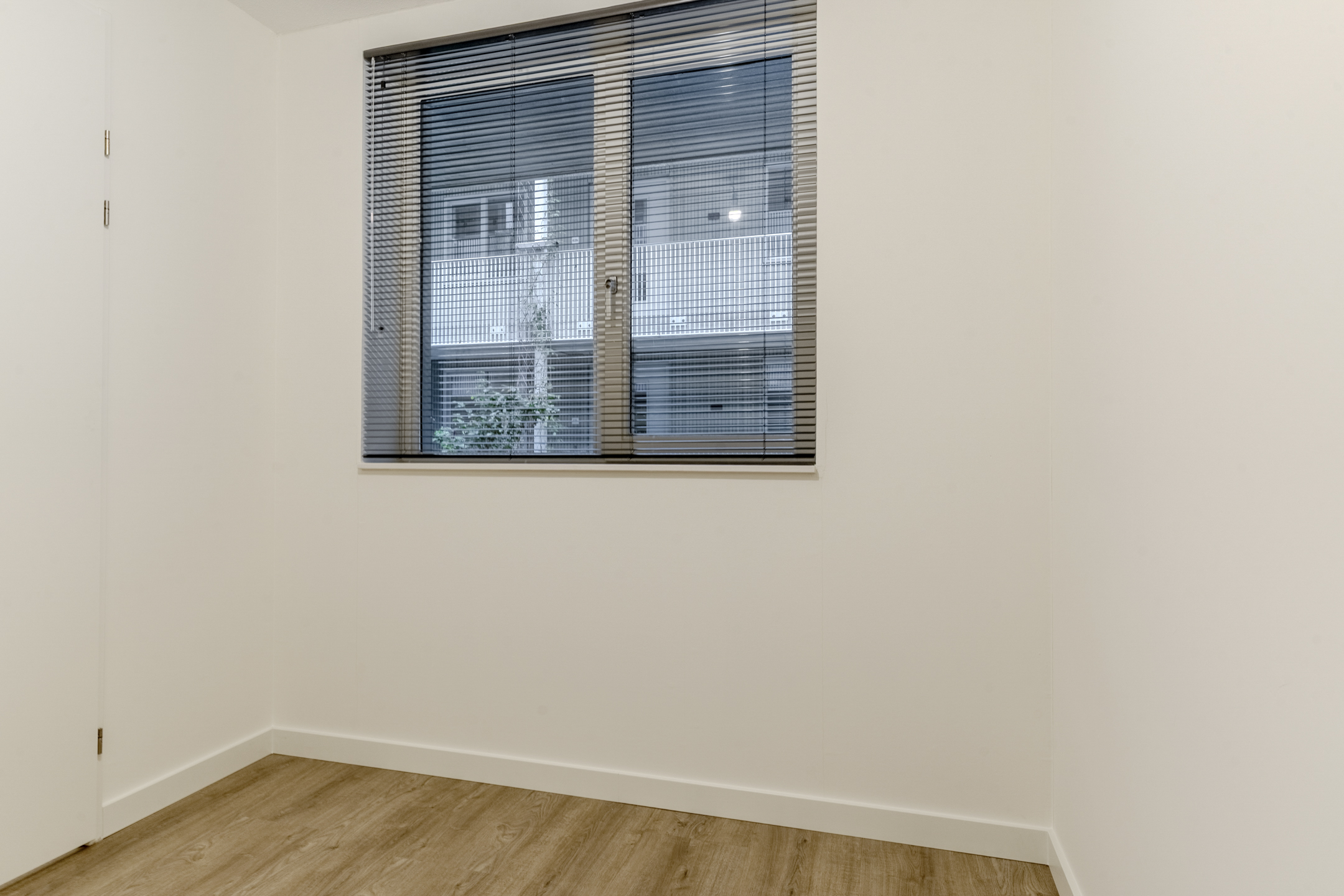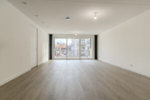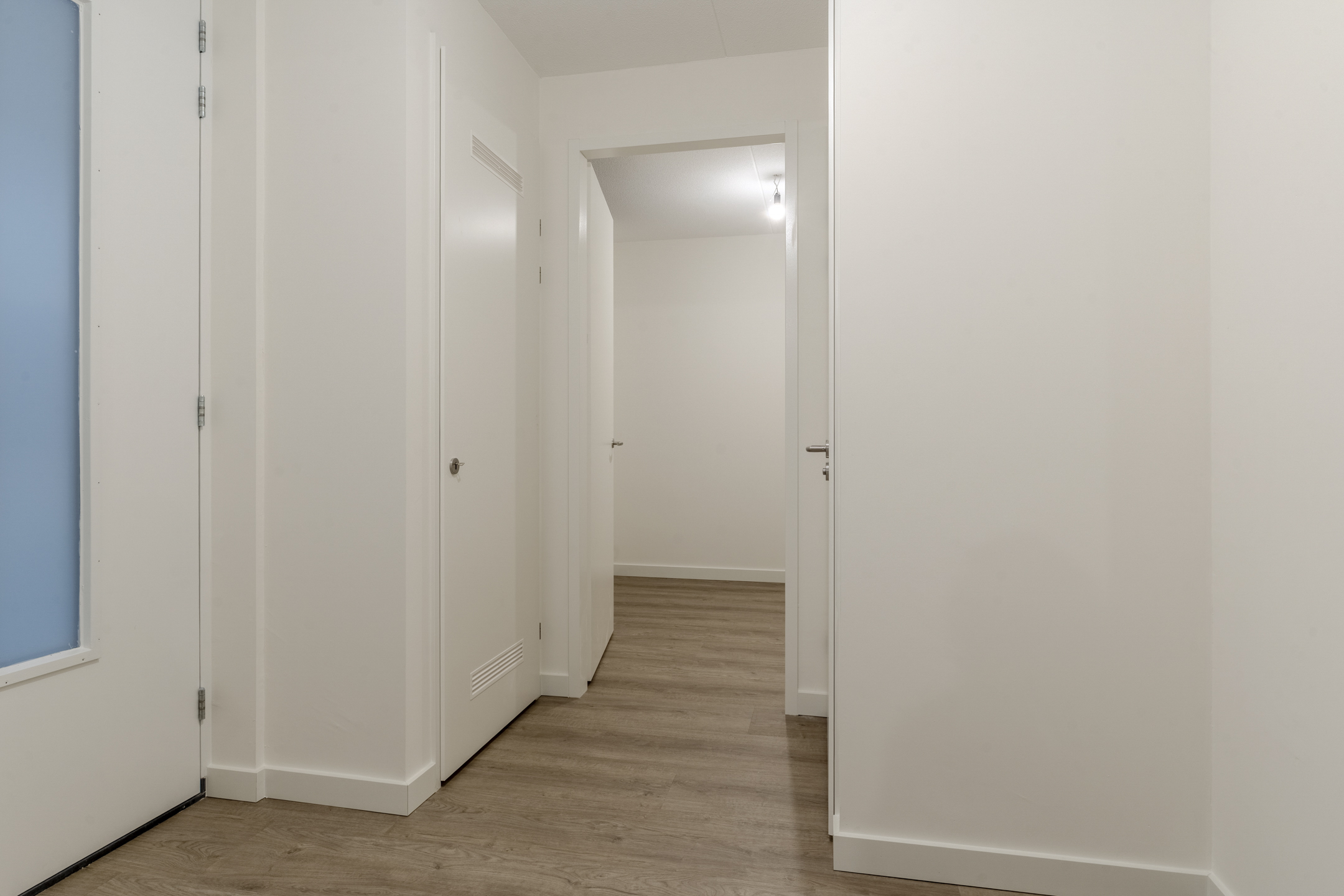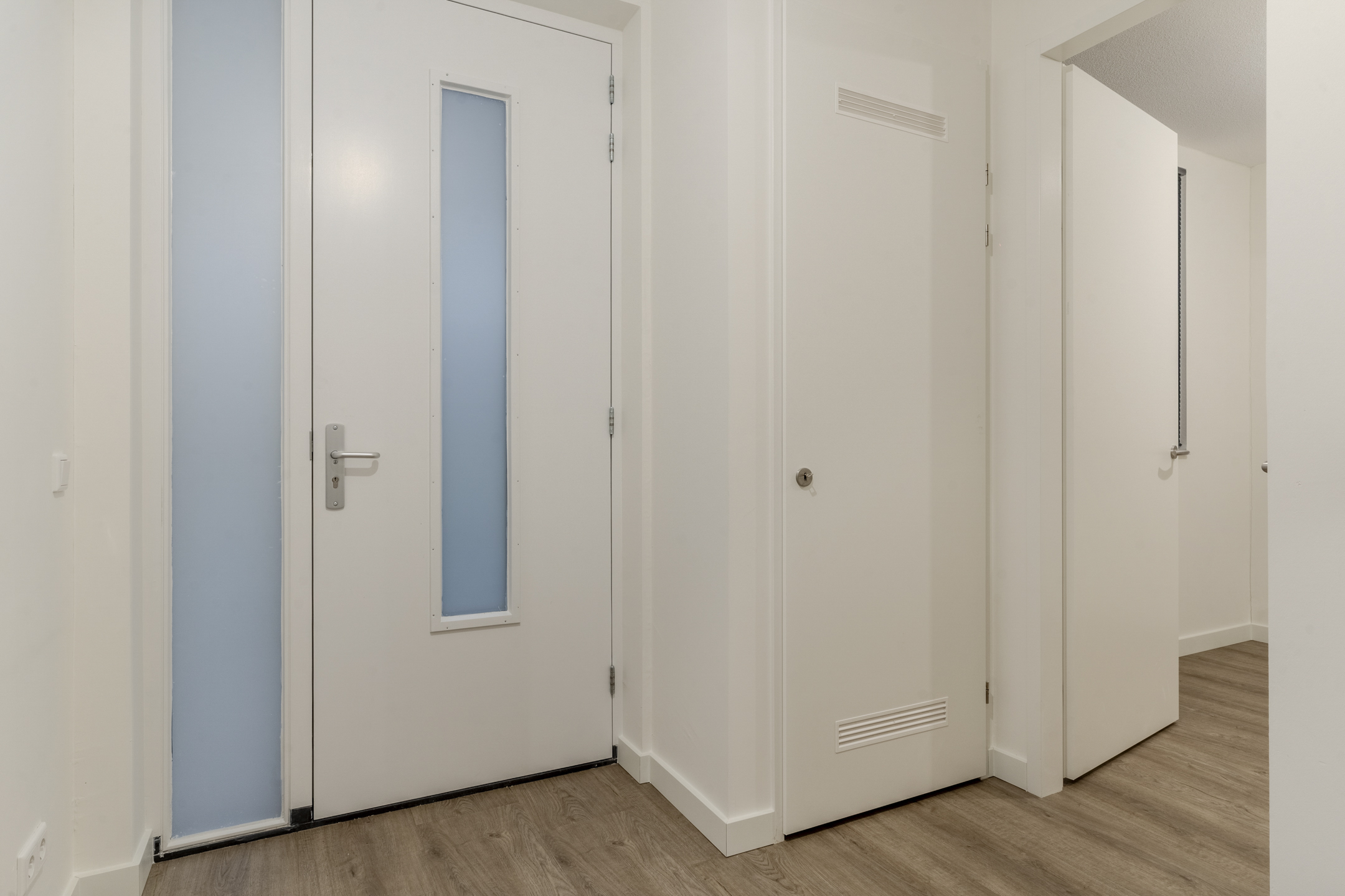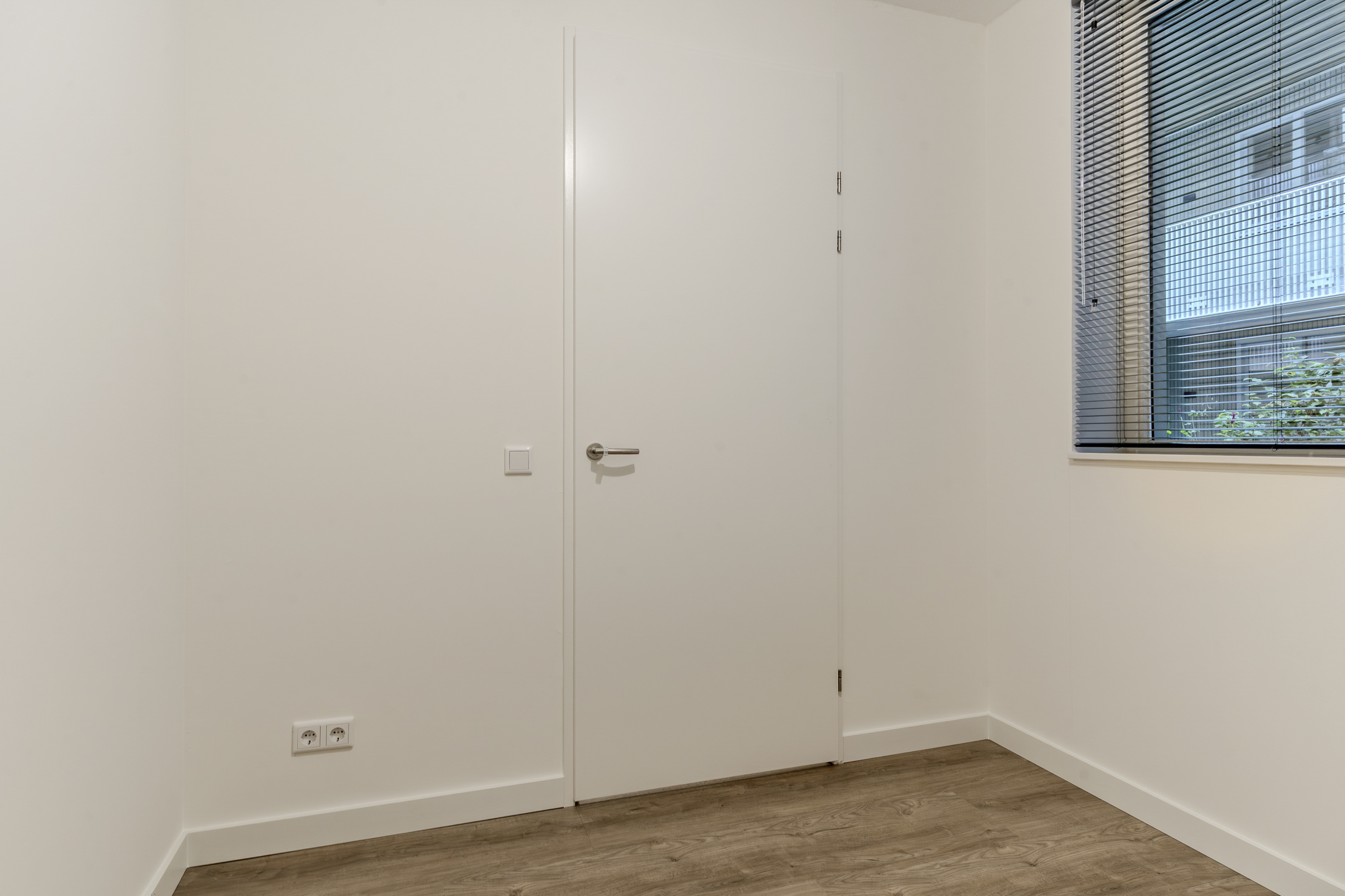 Entree/hal met toegang tot de meterkast, een praktische slaap-/werk-/hobby-/garderobekamer van ca. 7m² en een deels betegelde toiletruimte met wandcloset en fontein met onderbouwkastje, spiegel, closetrolhouder- en borstel en handdoekhaakje. Vanuit de hal komt u in de ruime, lichte living met toegang tot het balkon van ca. 11m² gelegen op het oosten. Het balkon is voorzien van een elektrisch uitvalscherm. De open keuken is voorzien van een luxe keukeninrichting met volop kastjes en lades en diverse inbouwapparatuur, te weten: een vaatwasmachine, heteluchtoven, multifunctionele oven met magnetronfunctie, inductiekookplaat met afzuigkap, koel-/vriescombinatie, spoelbak en een Quooker kraan. Op de vloer ligt een fraaie PVC vloer, aan de balkonzijde zijn er lamellen aanwezig en aan de keukenzijde luxaflex.