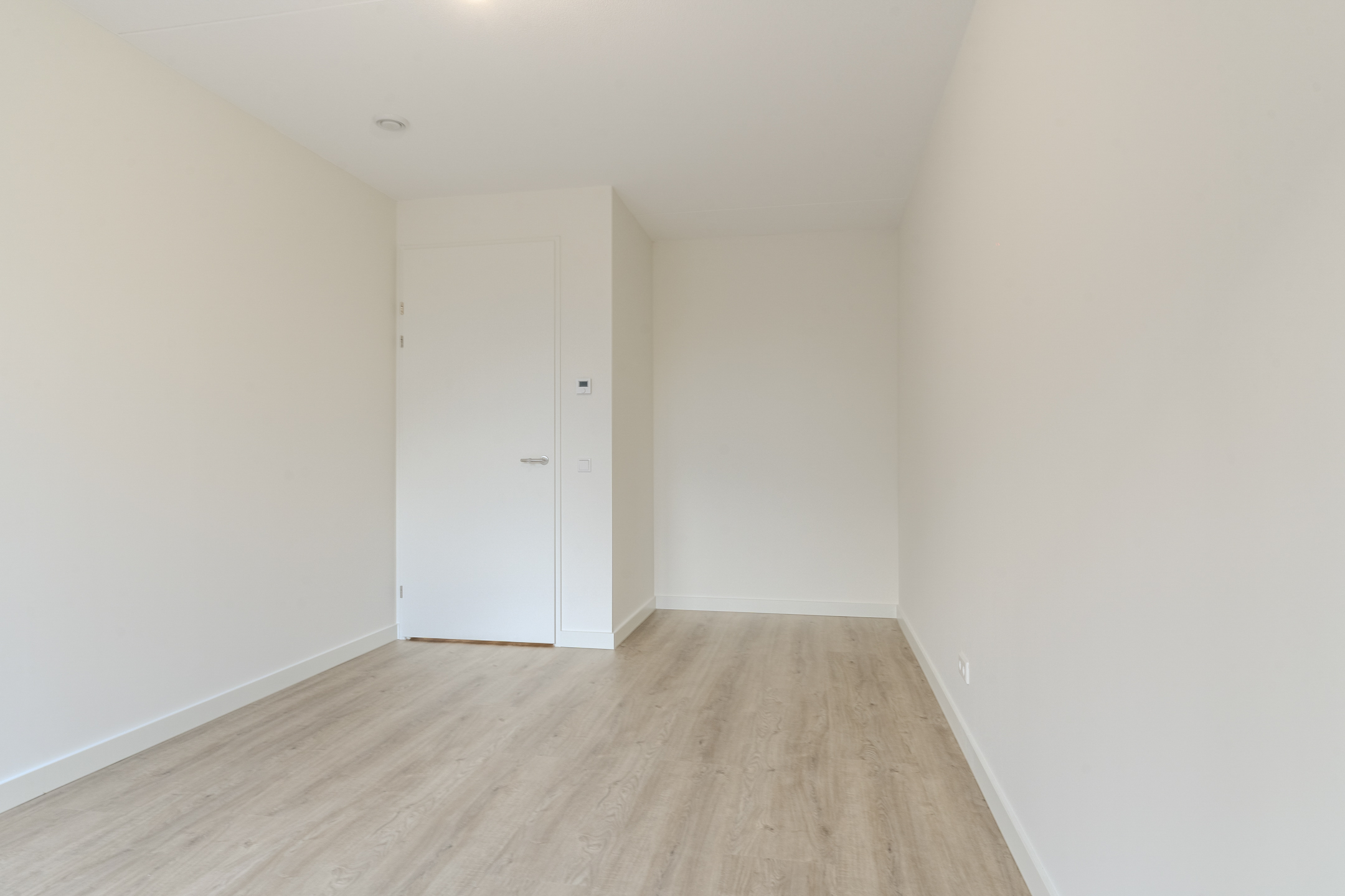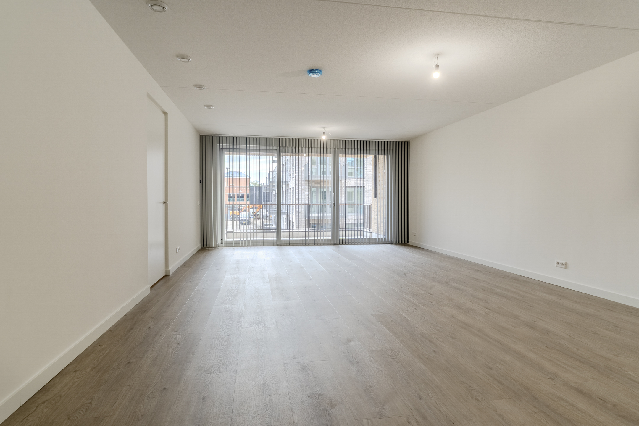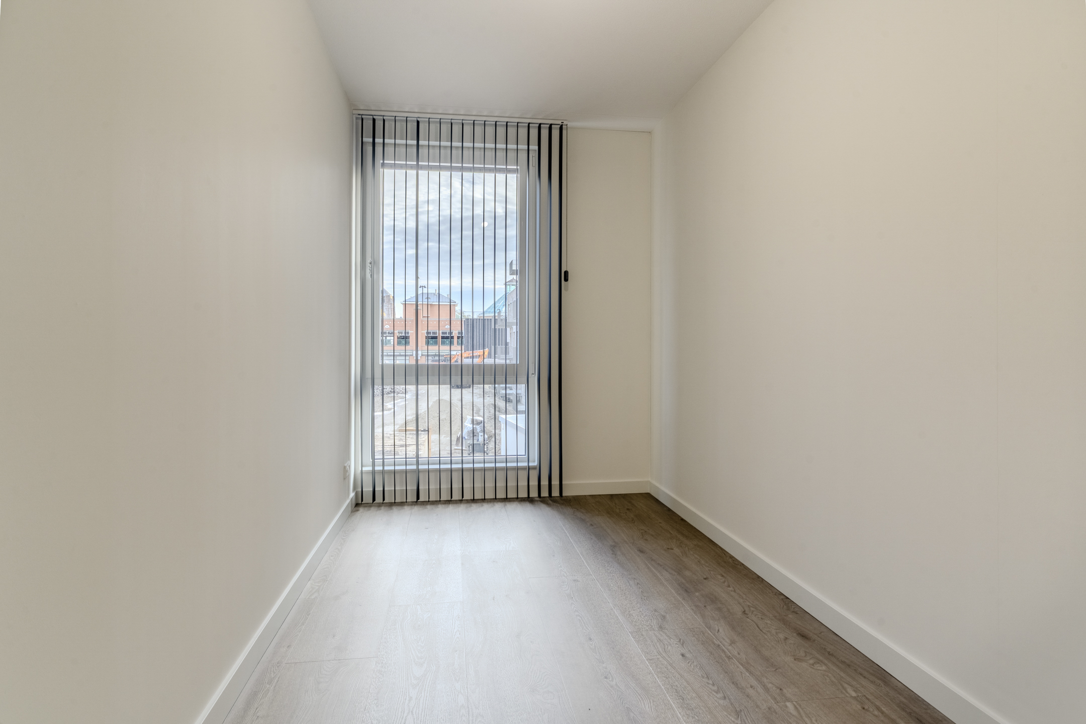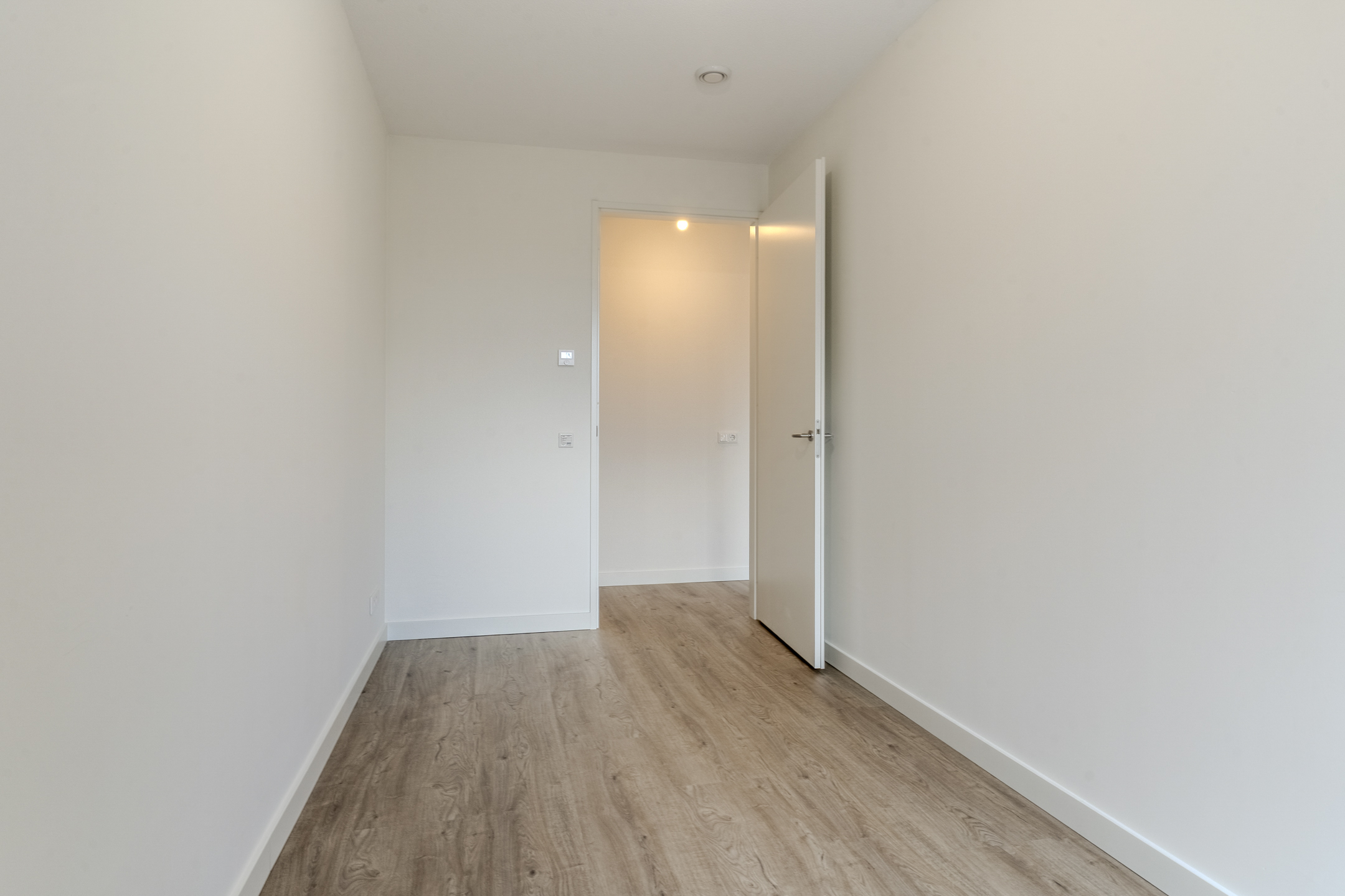 Entree/hal met toegang tot de meterkast, een praktische slaap-/werk-/hobby-/garderobekamer van ca. 7m² en een deels betegelde toiletruimte met wandcloset en fontein met onderbouwkastje, spiegel, closetrolhouder- en borstel en handdoekhaakje. Vanuit de hal komt u in de ruime, lichte living met toegang tot het balkon van ca. 11m² gelegen op het oosten. Het balkon is voorzien van een elektrisch uitvalscherm. De open keuken is voorzien van een luxe keukeninrichting met volop kastjes en lades en diverse inbouwapparatuur, te weten: een vaatwasmachine, heteluchtoven, multifunctionele oven met magnetronfunctie, inductiekookplaat met afzuigkap, koel-/vriescombinatie, spoelbak en een Quooker kraan. Op de vloer ligt een fraaie PVC vloer, aan de balkonzijde zijn er lamellen aanwezig en aan de keukenzijde luxaflex.