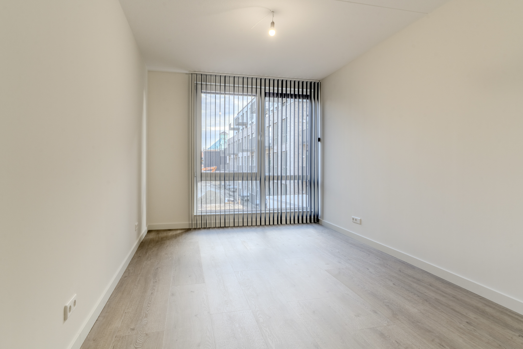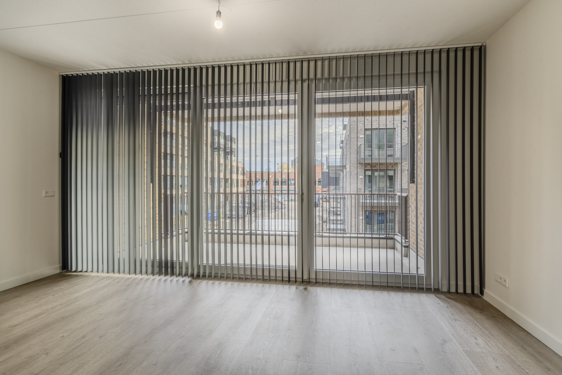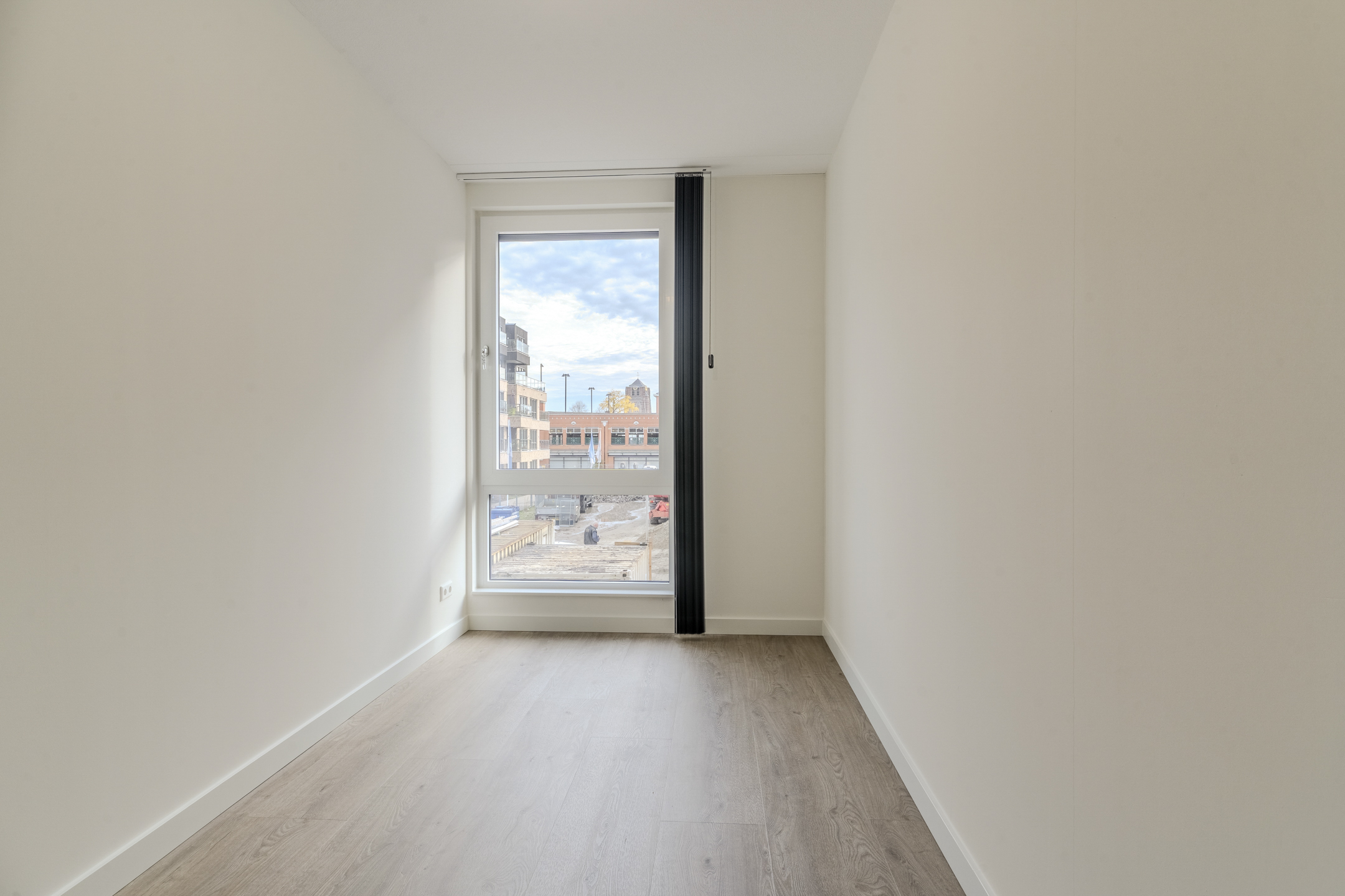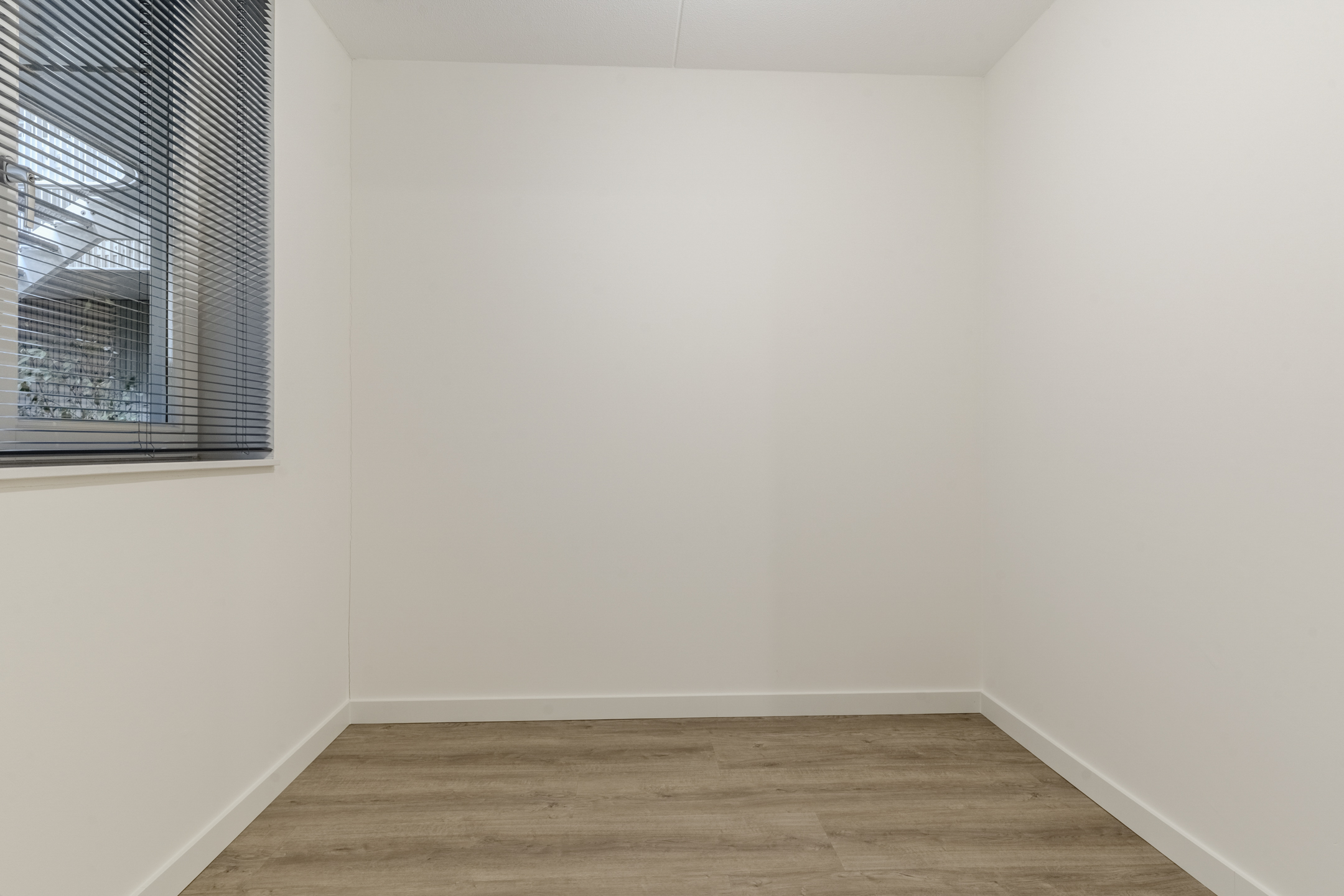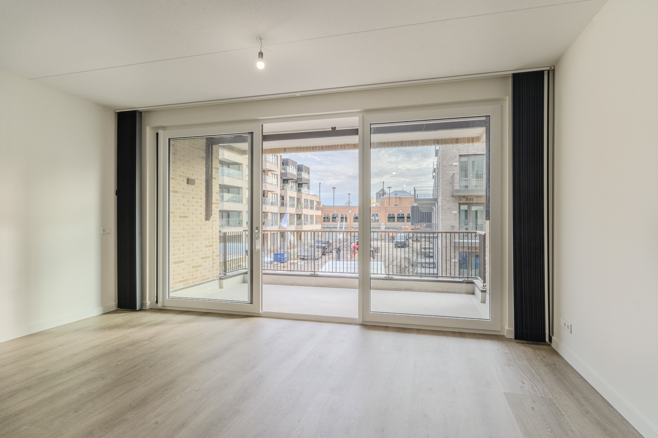 Entree/hal met toegang tot de meterkast, een praktische slaap-/werk-/hobby-/garderobekamer van ca. 7m² en een deels betegelde toiletruimte met wandcloset en fontein met onderbouwkastje, spiegel, closetrolhouder- en borstel en handdoekhaakje. Vanuit de hal komt u in de ruime, lichte living met toegang tot het balkon van ca. 11m² gelegen op het oosten. Het balkon is voorzien van een elektrisch uitvalscherm. De open keuken is voorzien van een luxe keukeninrichting met volop kastjes en lades en diverse inbouwapparatuur, te weten: een vaatwasmachine, heteluchtoven, multifunctionele oven met magnetronfunctie, inductiekookplaat met afzuigkap, koel-/vriescombinatie, spoelbak en een Quooker kraan. Op de vloer ligt een fraaie PVC vloer, aan de balkonzijde zijn er lamellen aanwezig en aan de keukenzijde luxaflex.