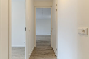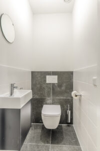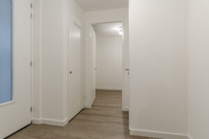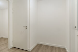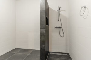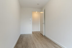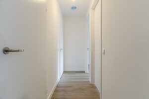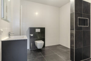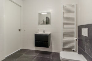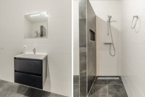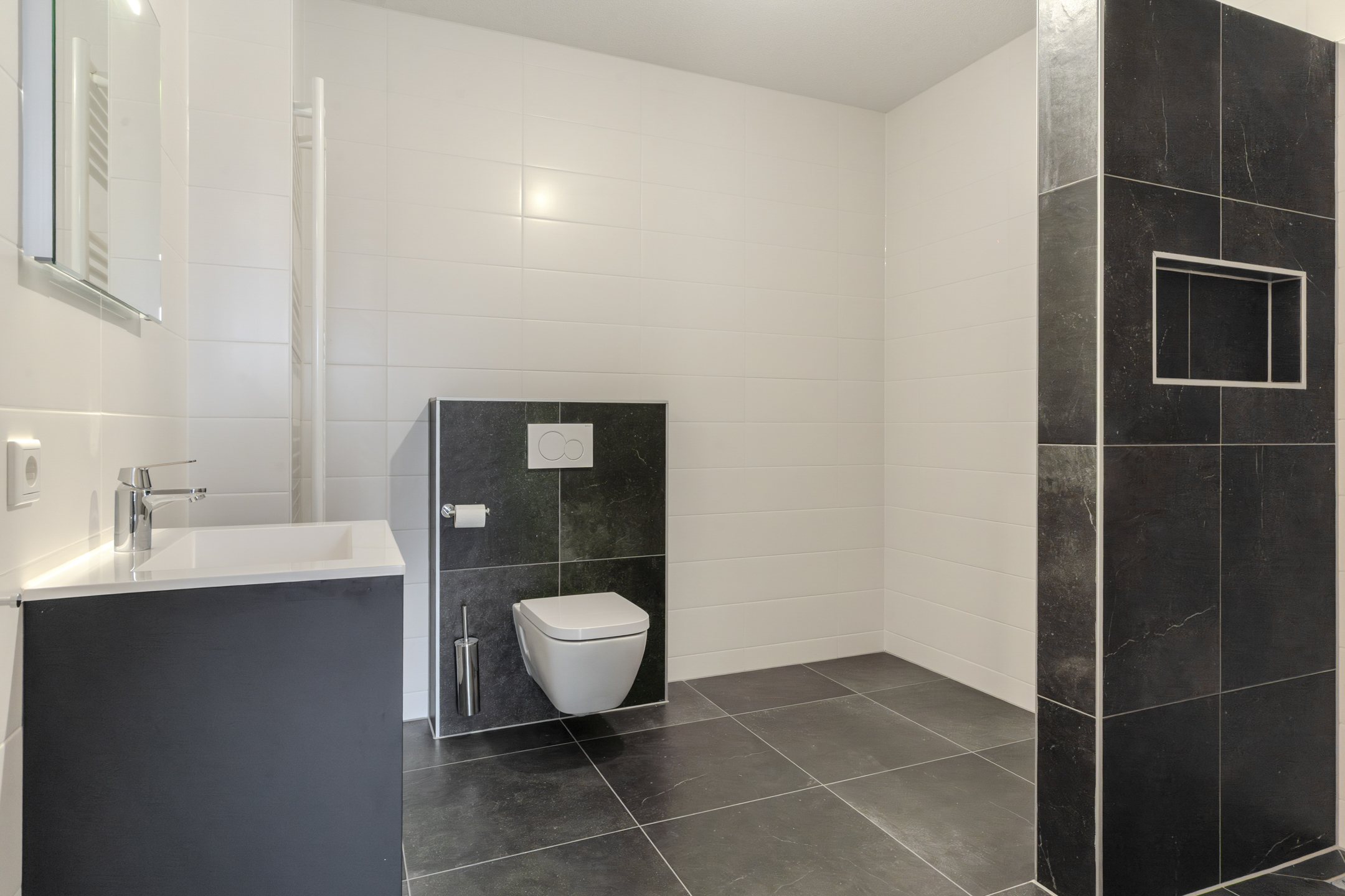 Vanuit de living komt u in een gang welke toegang geeft tot nog twee slaapkamers van ca. 16m² en 10m² welke beide zijn voorzien van elektrische screens. Tevens bereikt u de luxe, volledig betegelde badkamer van ca. 7m² met een inloopdouche, wastafelmeubel, spiegel, tweede wandcloset, designradiator, closetrolhouder- en borstel en handdoekhouder- en haakje en de berging/techniekruimte met de aansluitingen voor de was- en droogapparatuur en de opstelplaats van de WTW-unit en warmtepompsysteem. In alle ruimtes (m.u.v. de badkamer) liggen eveneens dezelfde PVC vloeren.