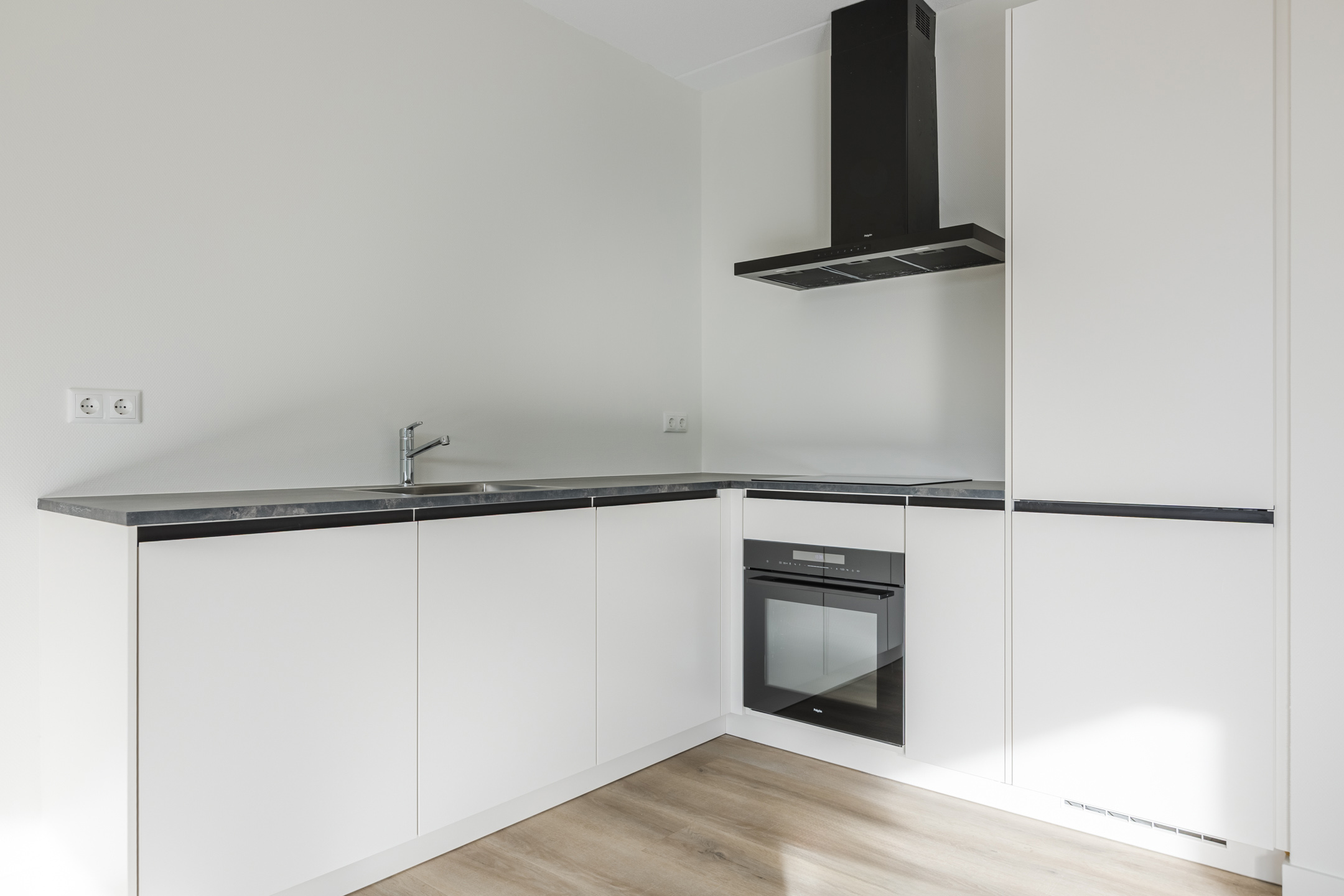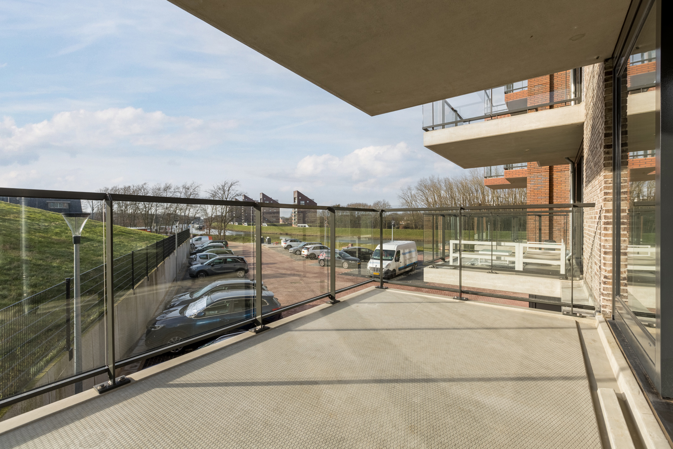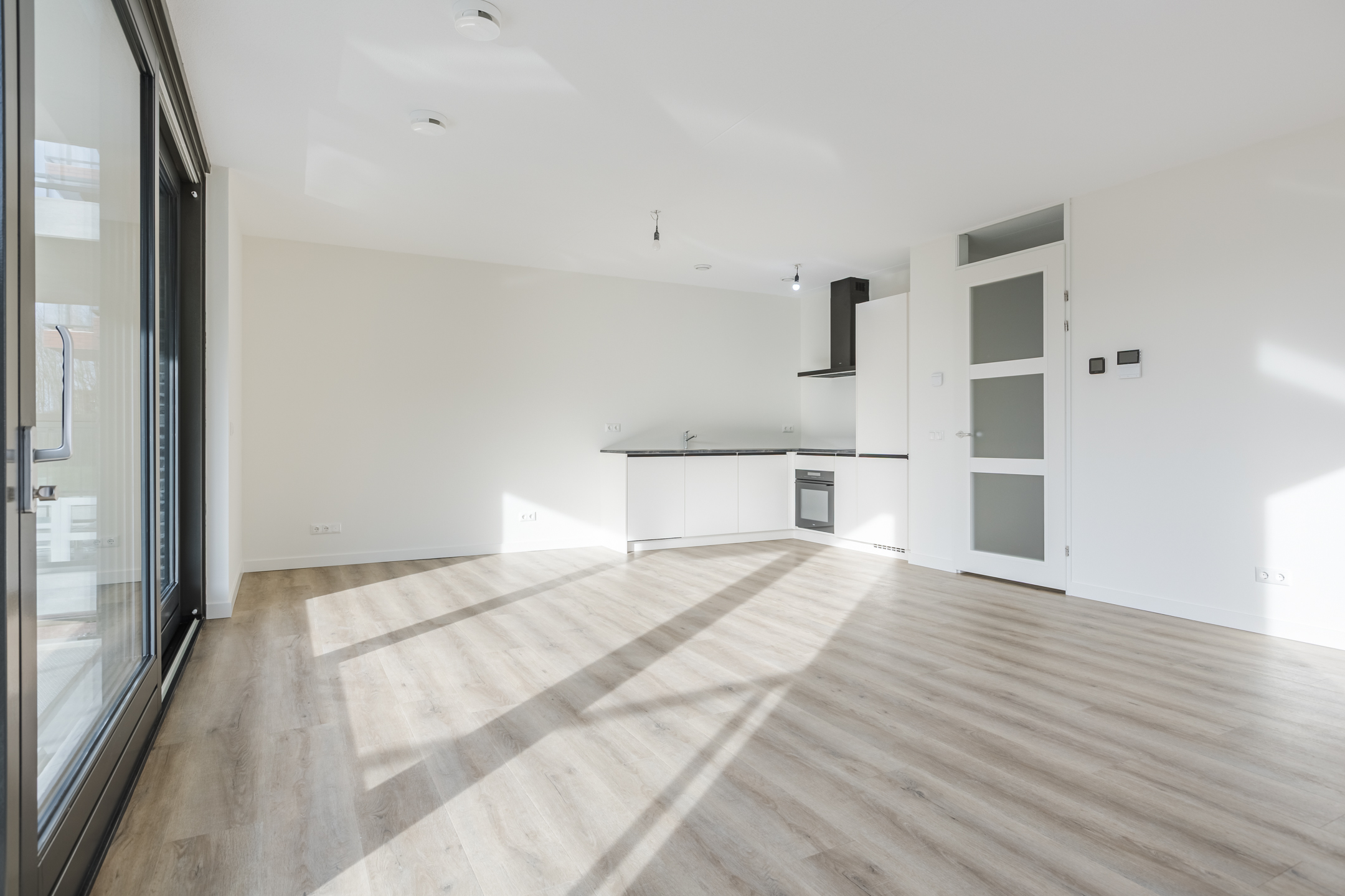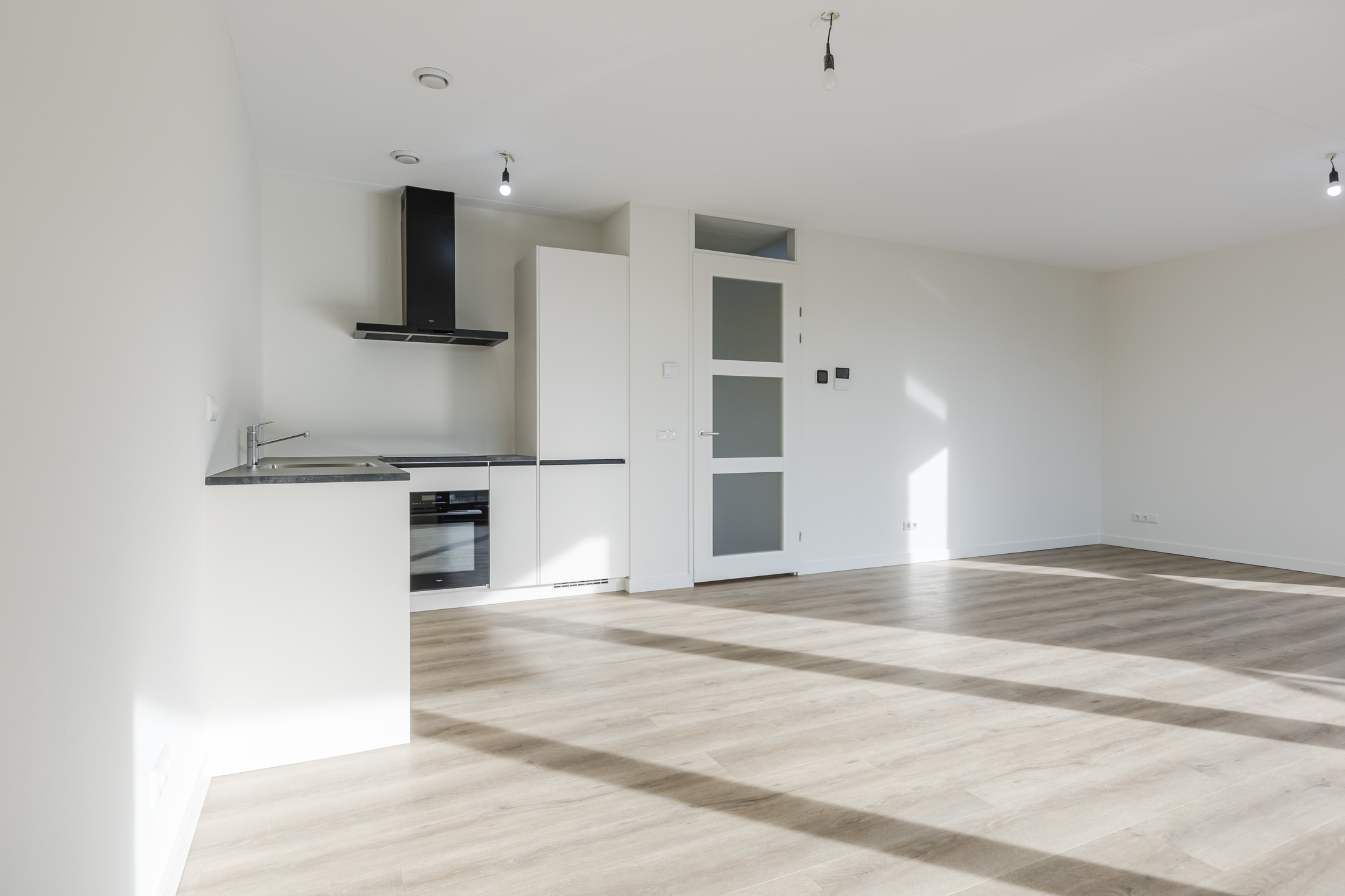Ruime en lichte living (ca. 35m²) voorzien van open keuken en een grote glazen schuifpui naar het bijzonder royaal opgezette balkon van maar liefst 13m² (breed ca. 4.79m en diep ca. 2.75m). De moderne in lichte kleurstelling uitgevoerde complete keukeninrichting is in een hoekopstelling geplaatst. De navolgende hoogwaardige inbouwapparatuur is aanwezig: inductiekookplaat, recirculatie afzuigschouw, combi-oven/magnetron, koel/vriescombinatie en een vaatwasmachine. Het gehele appartement is voorzien van een hoogwaardige laminaatvloer en strakke wandafwerking.