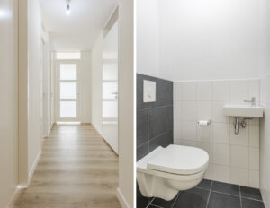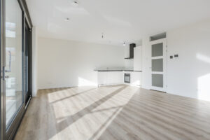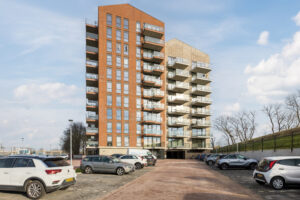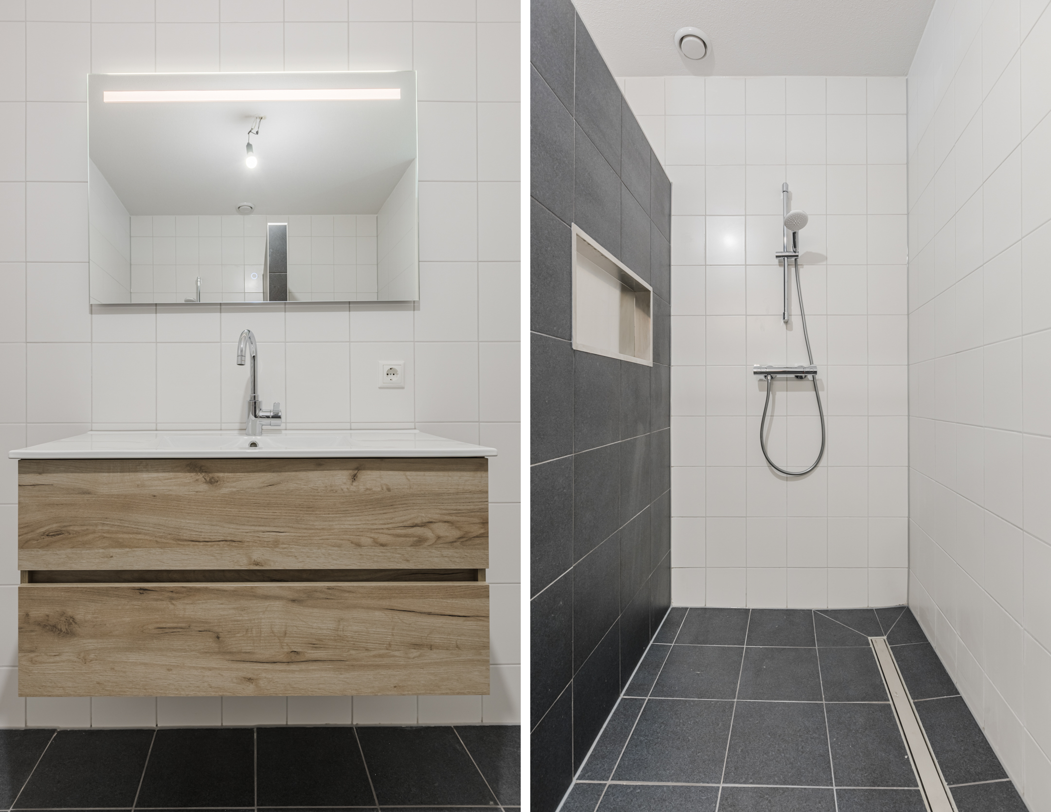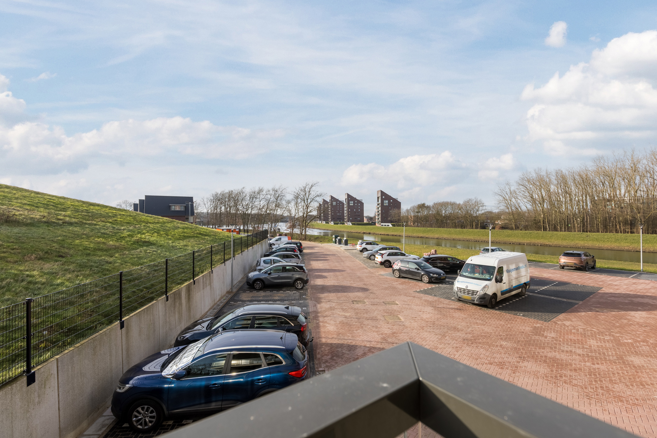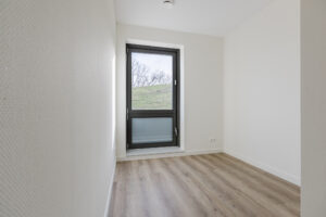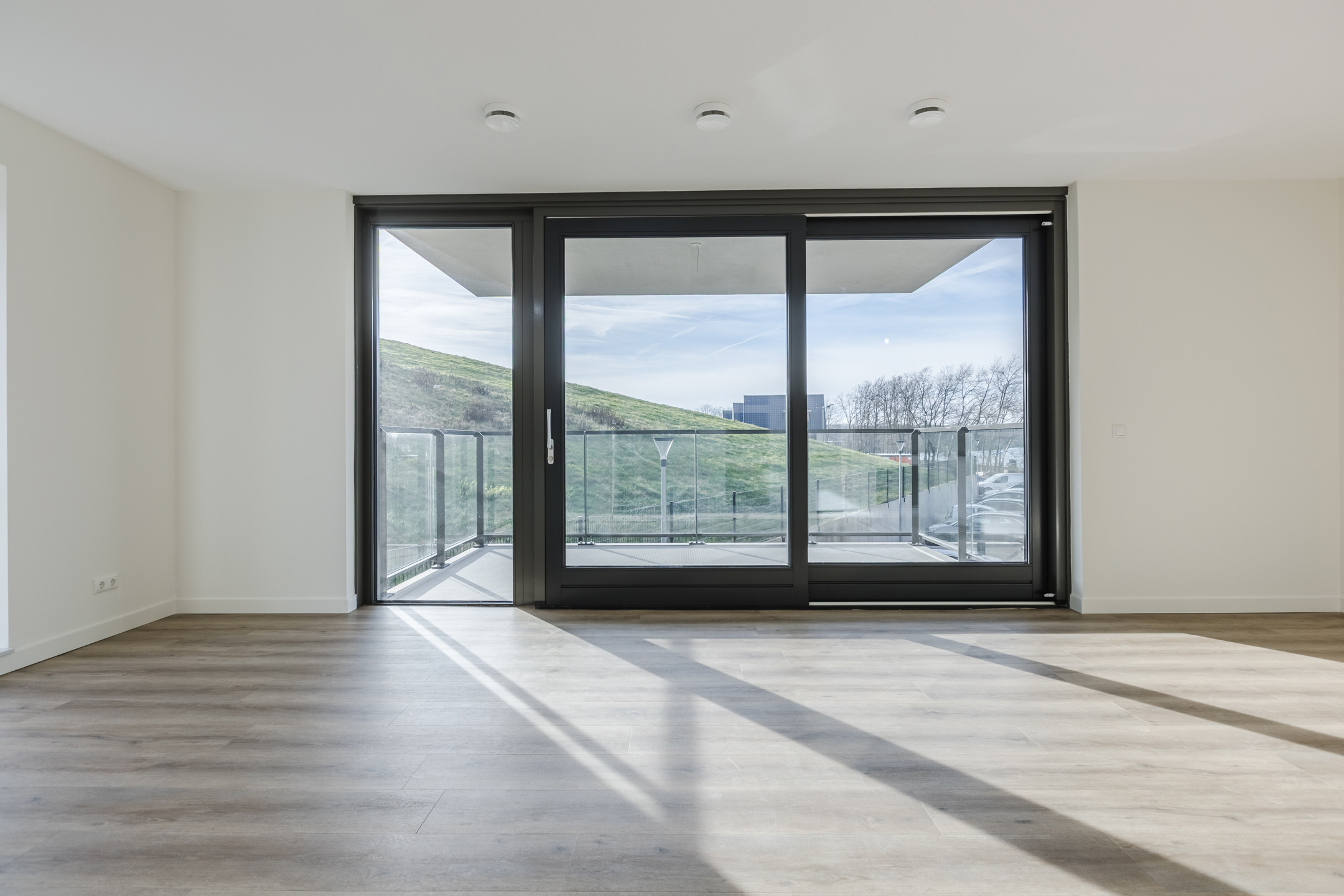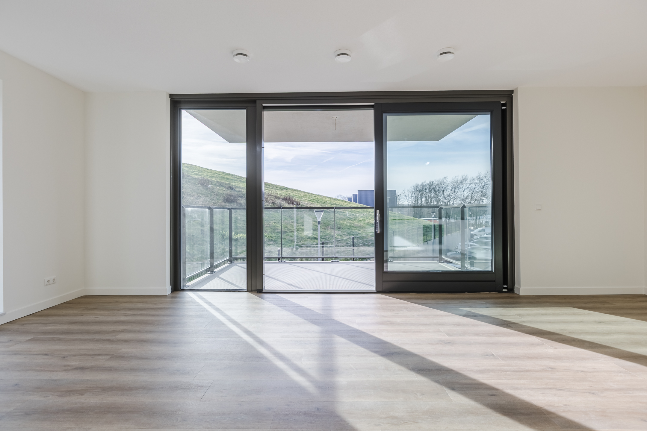 Ruime en lichte living (ca. 35m²) voorzien van open keuken en een grote glazen schuifpui naar het bijzonder royaal opgezette balkon van maar liefst 13m² (breed ca. 4.79m en diep ca. 2.75m). De moderne in lichte kleurstelling uitgevoerde complete keukeninrichting is in een hoekopstelling geplaatst. De navolgende hoogwaardige inbouwapparatuur is aanwezig: inductiekookplaat, recirculatie afzuigschouw, combi-oven/magnetron, koel/vriescombinatie en een vaatwasmachine. Het gehele appartement is voorzien van een hoogwaardige laminaatvloer en strakke wandafwerking.