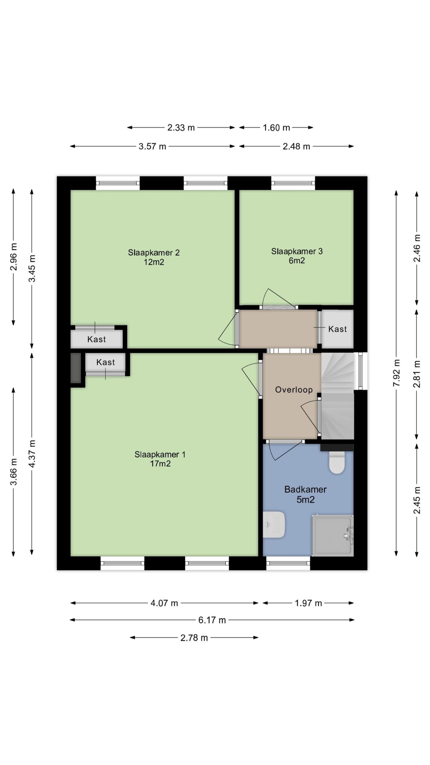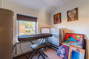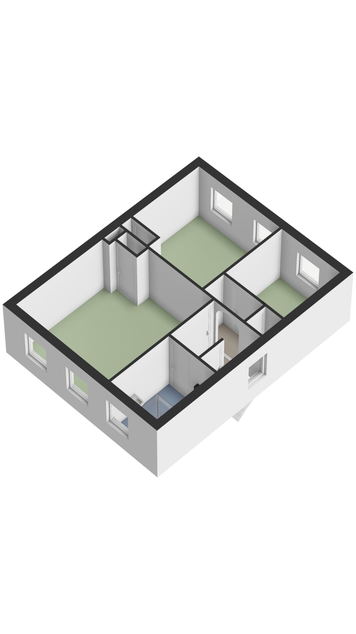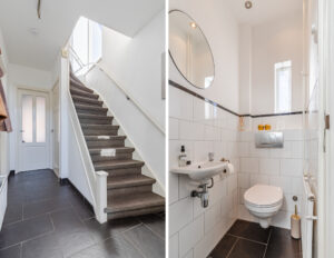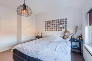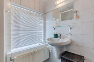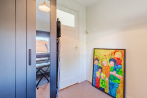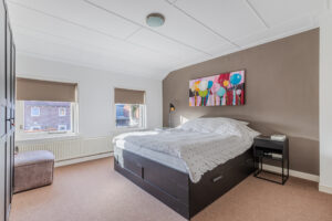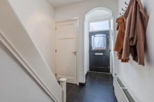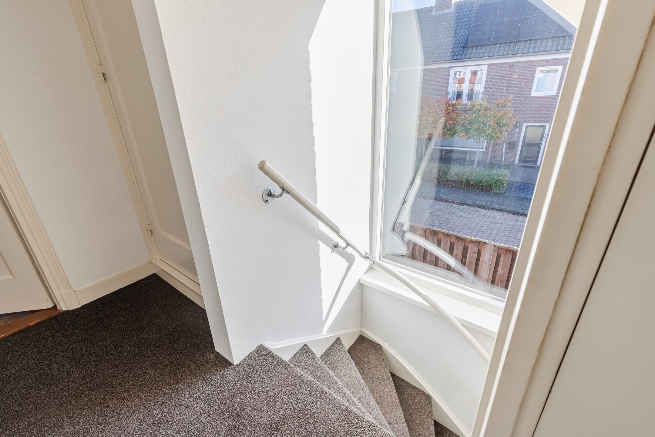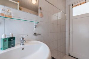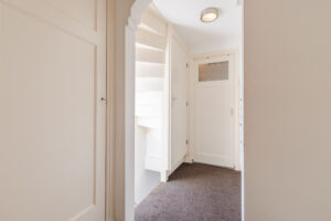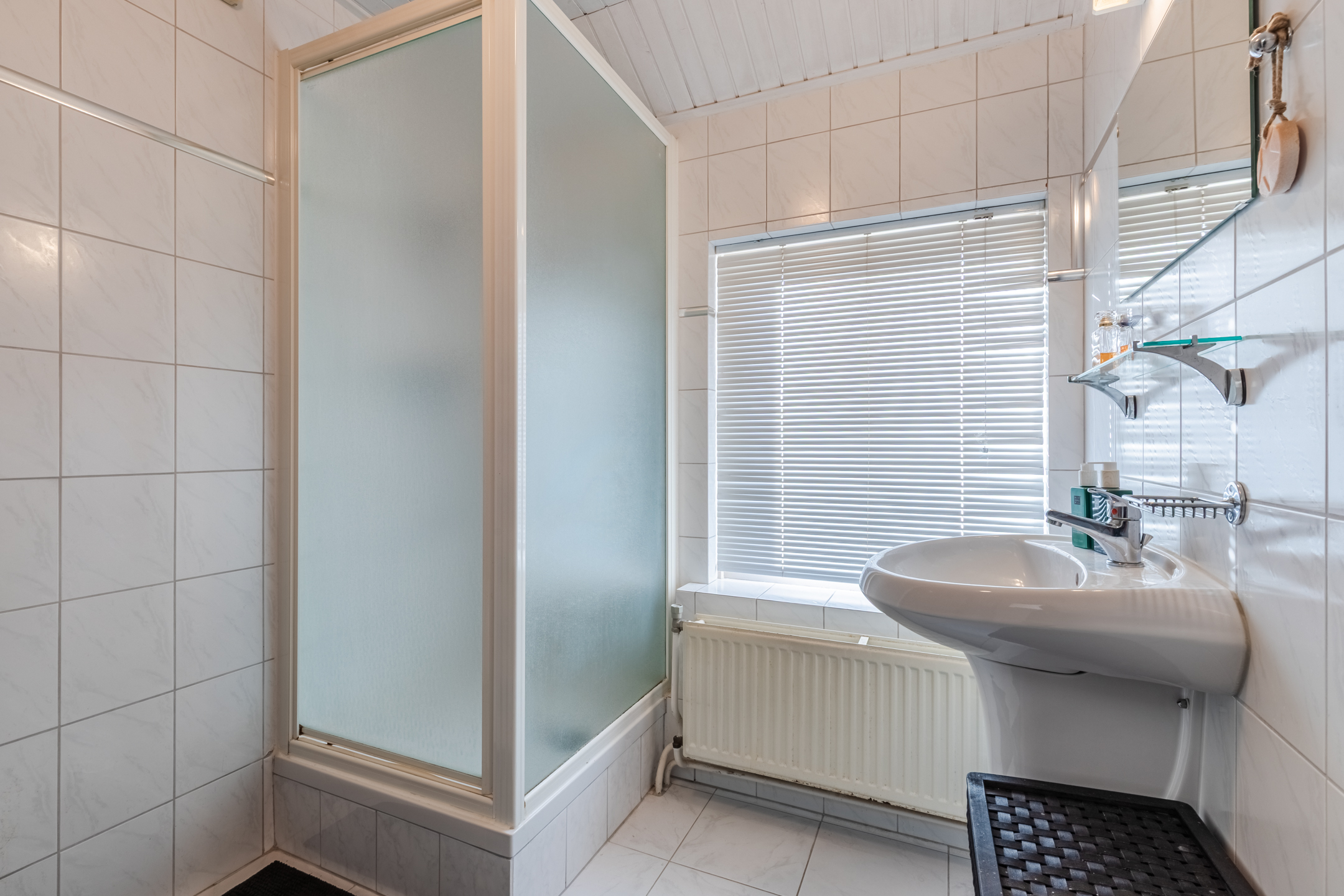 Overloop met inbouwkast, trapopgang naar de tweede verdieping en toegang tot 3 slaapkamers en de volledig betegelde badkamer welke is voorzien van een douchecabine, wastafel en wasmachineaansluiting. Alle slaapkamers zijn voorzien van vloerbedekking en de twee grootste kamers beschikken over een inbouwkast.