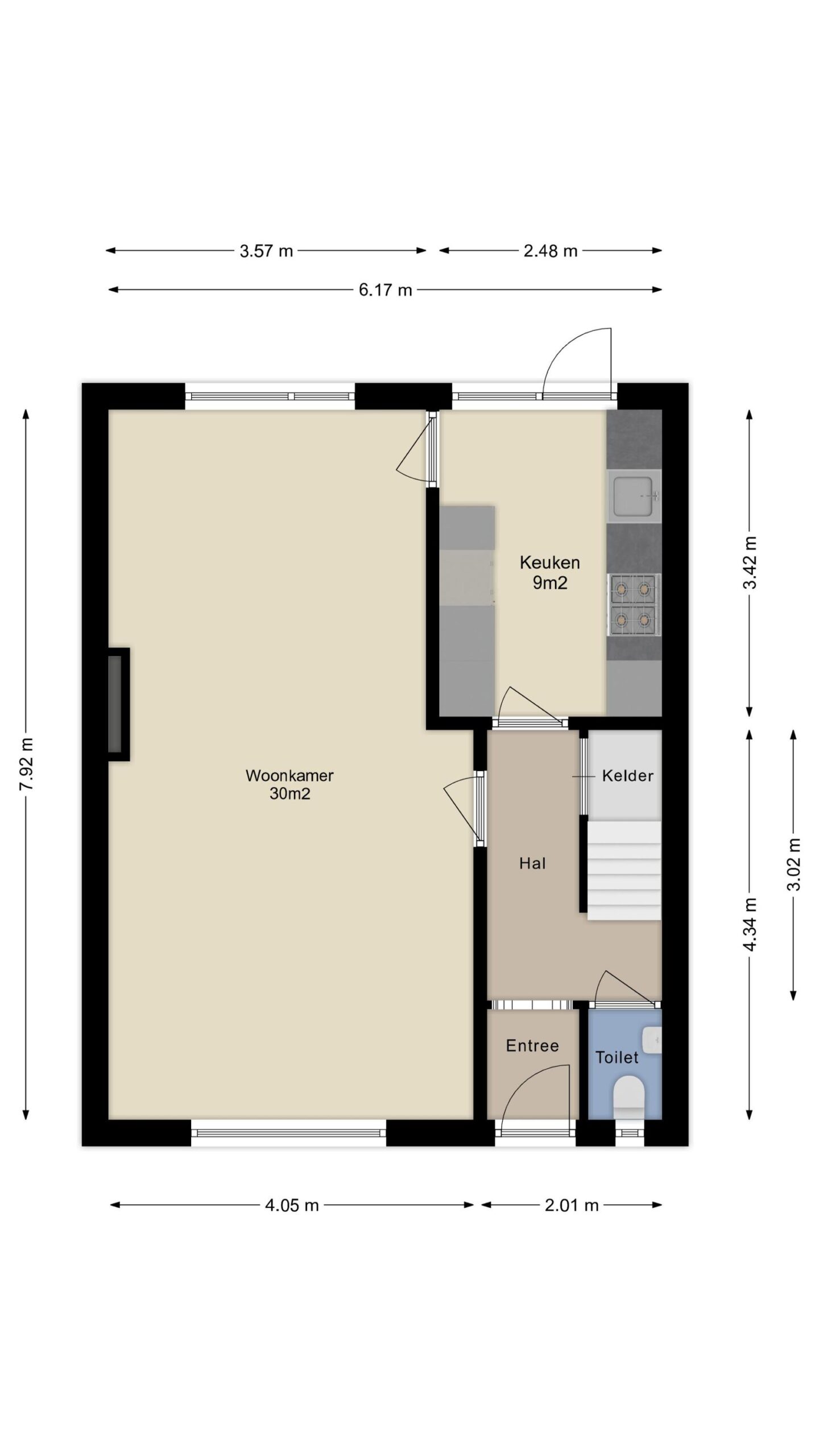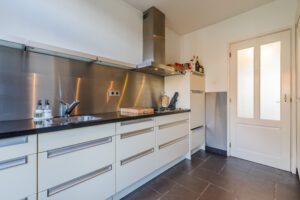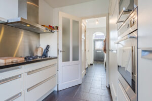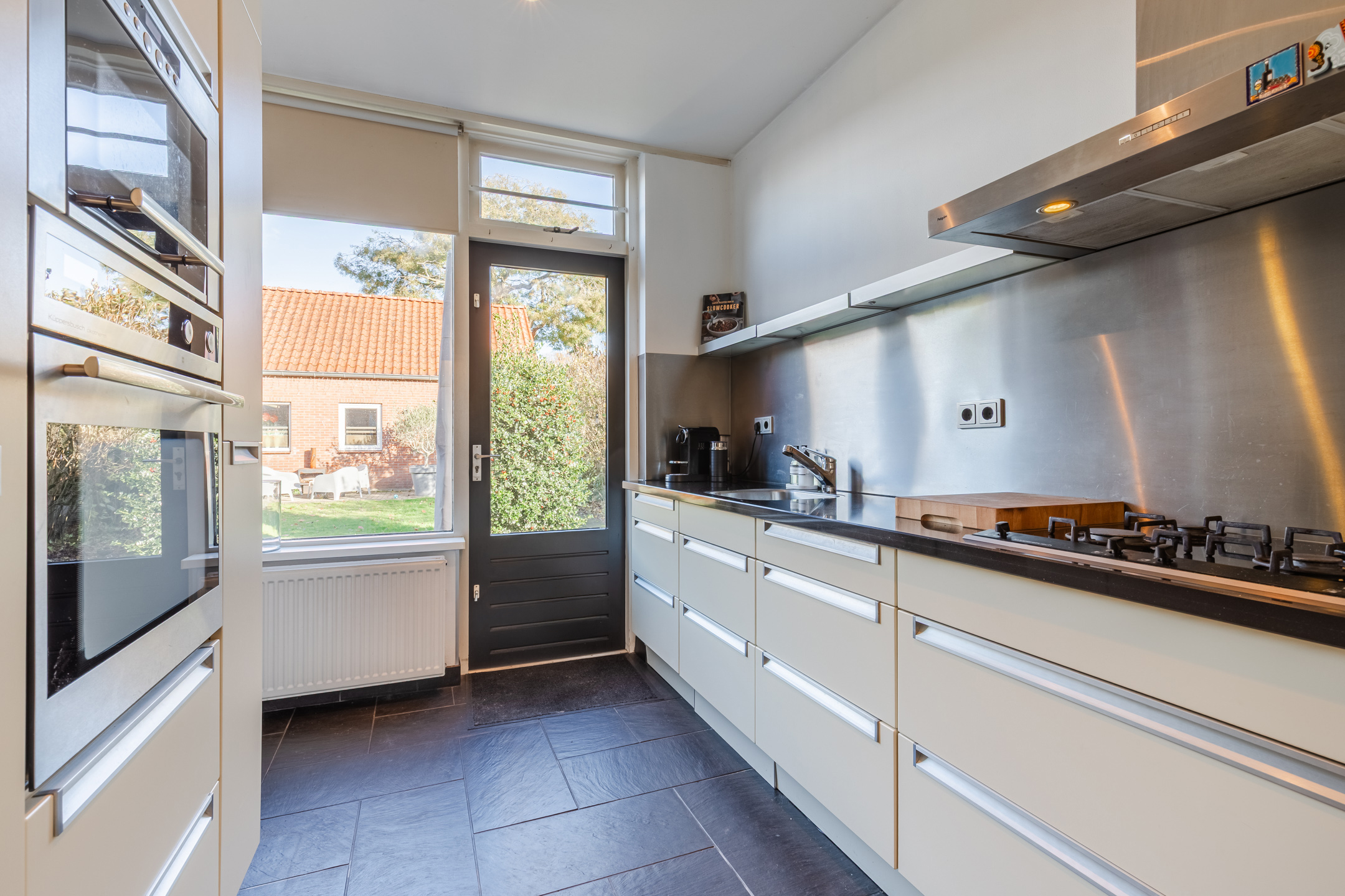 Entree/hal met toegang tot de meterkast, half betegelde toiletruimte met wandcloset en fontein, de trapopgang naar de eerste verdieping en de ruime praktische kelderkast. Vanuit de hal bereikt u zowel de woonkamer alsook de keuken. De woning beschikt over een ruime woonkamer welke is voorzien van een massief houten vloer en een sfeervolle houtkachel. De dichte keuken, welke ook toegankelijk is via de woonkamer, is voorzien van een lichte kleurstelling met diverse apparatuur, zoals te weten: een 4-pits gaskookplaat, afzuigkap, oven, magnetron, vaatwasmachine en koelkast met vriesvak. Vanuit de keuken bereikt u middels een loopdeur de diepe, fraai aangelegde achter- en zij-tuin.