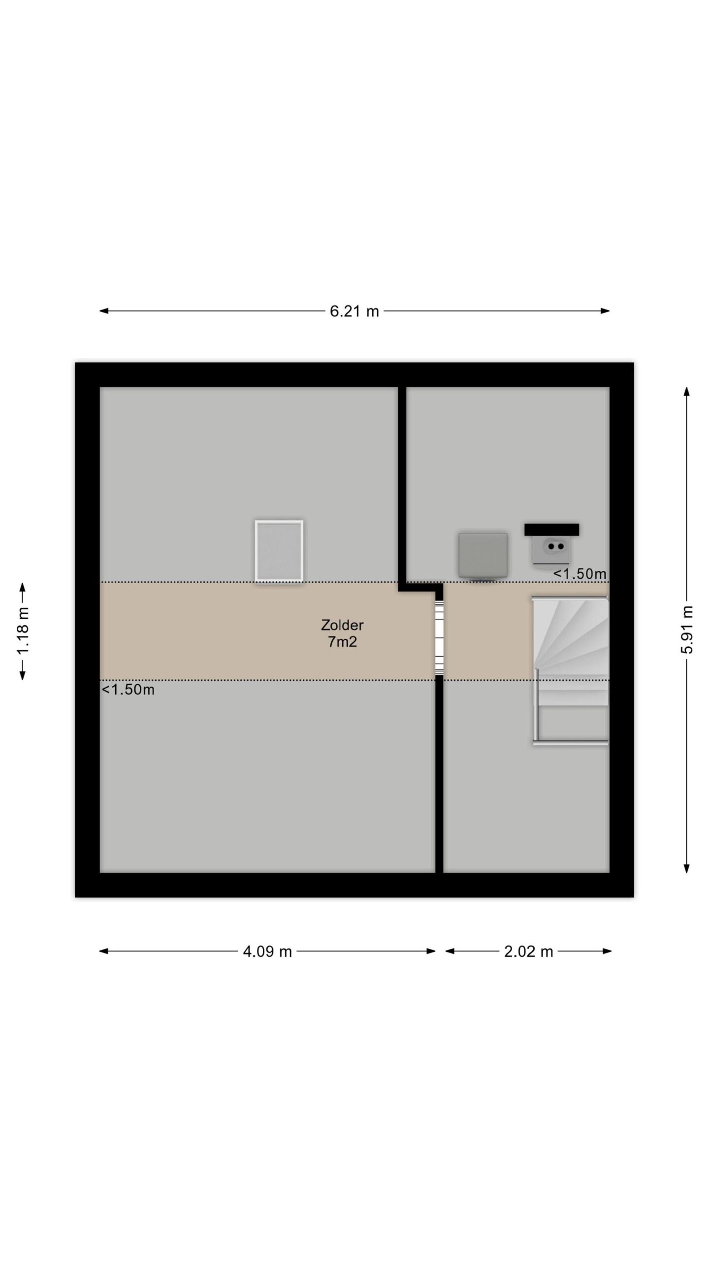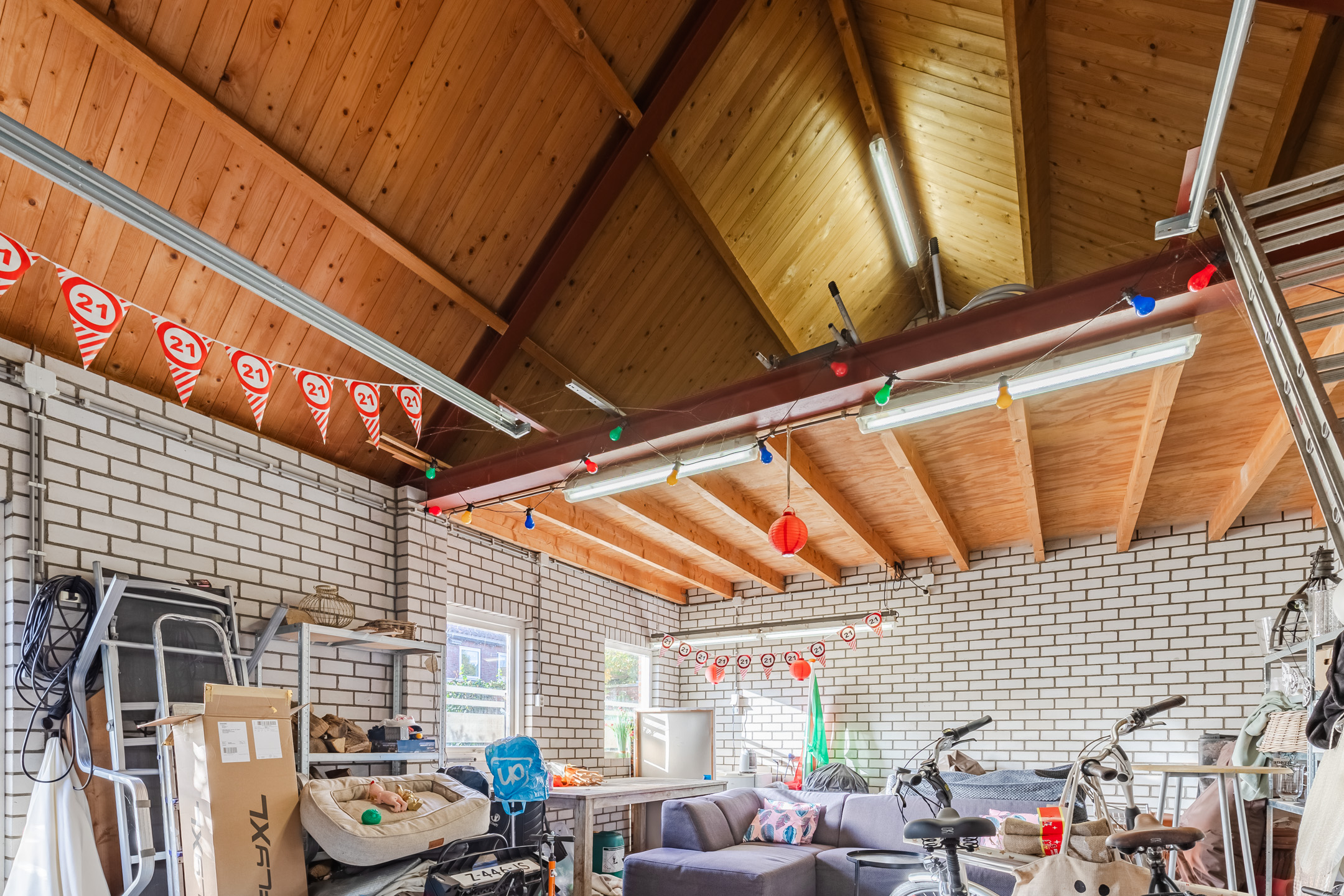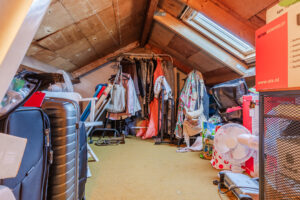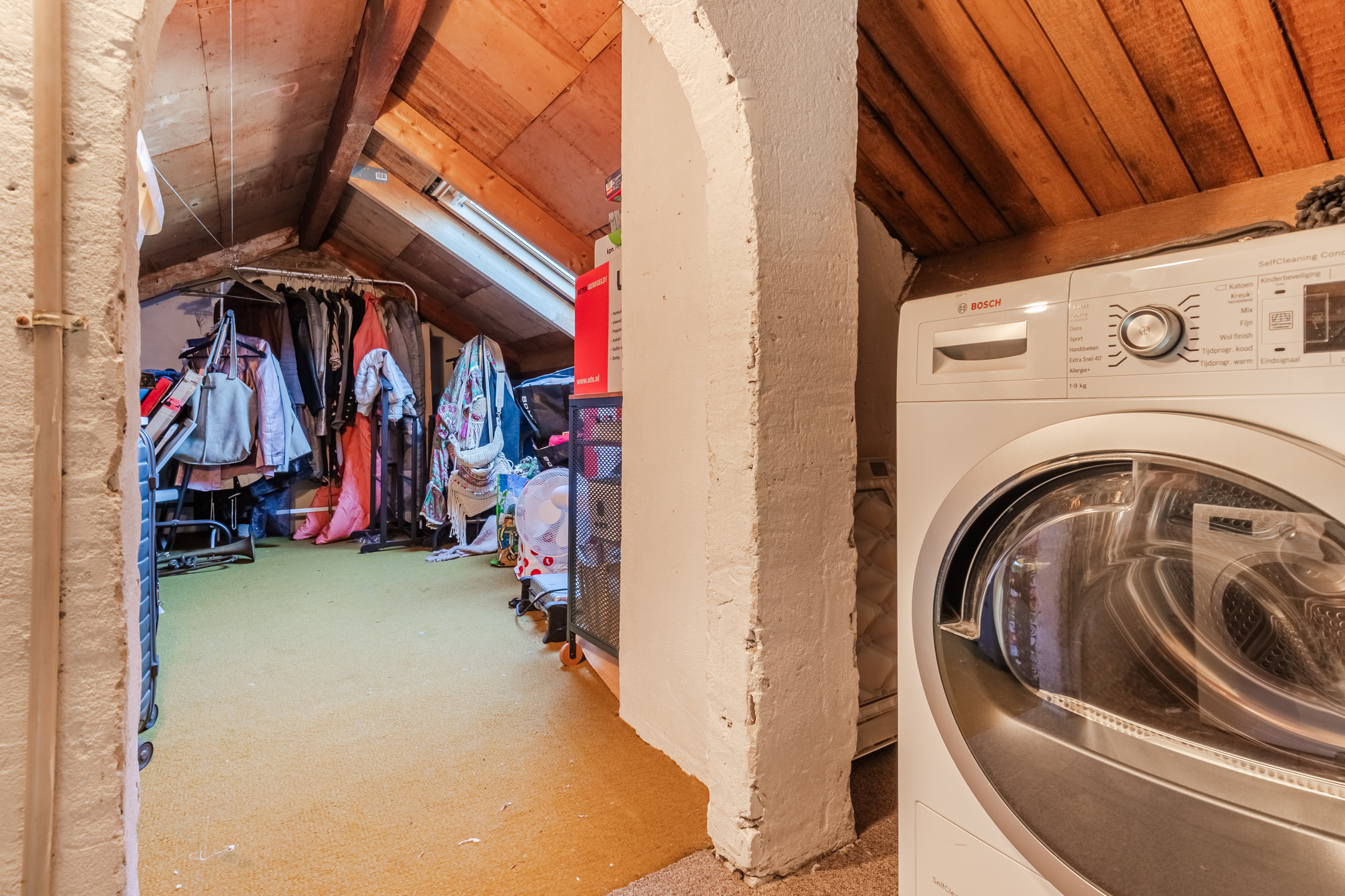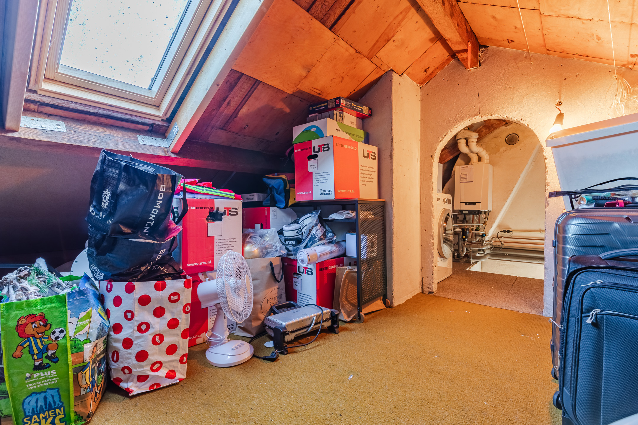Middels een vaste trap bereikt u de praktische bergzolder. Hier bevindt zich de opstelplaats van de CV-combiketel (Remeha Tzerra Ace 39c Solan, uit 2020) gecombineerd met een hybride-warmtepomp (2024) en is er aan de achterzijde een dakraam aanwezig.