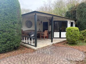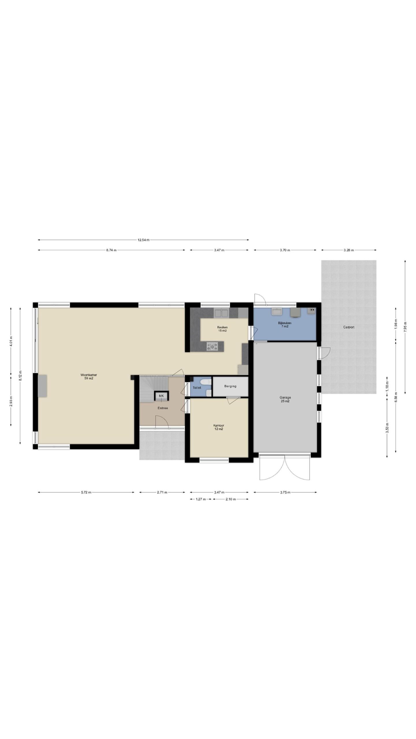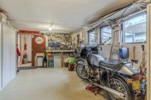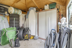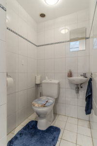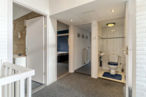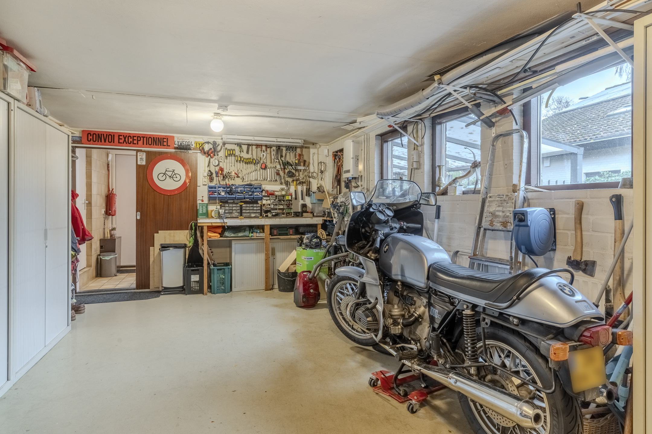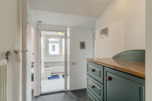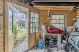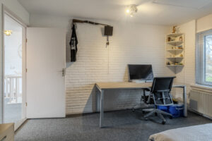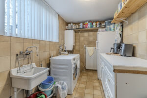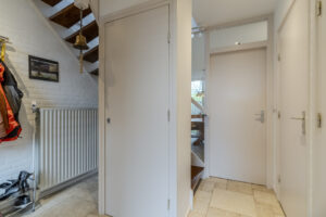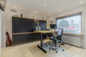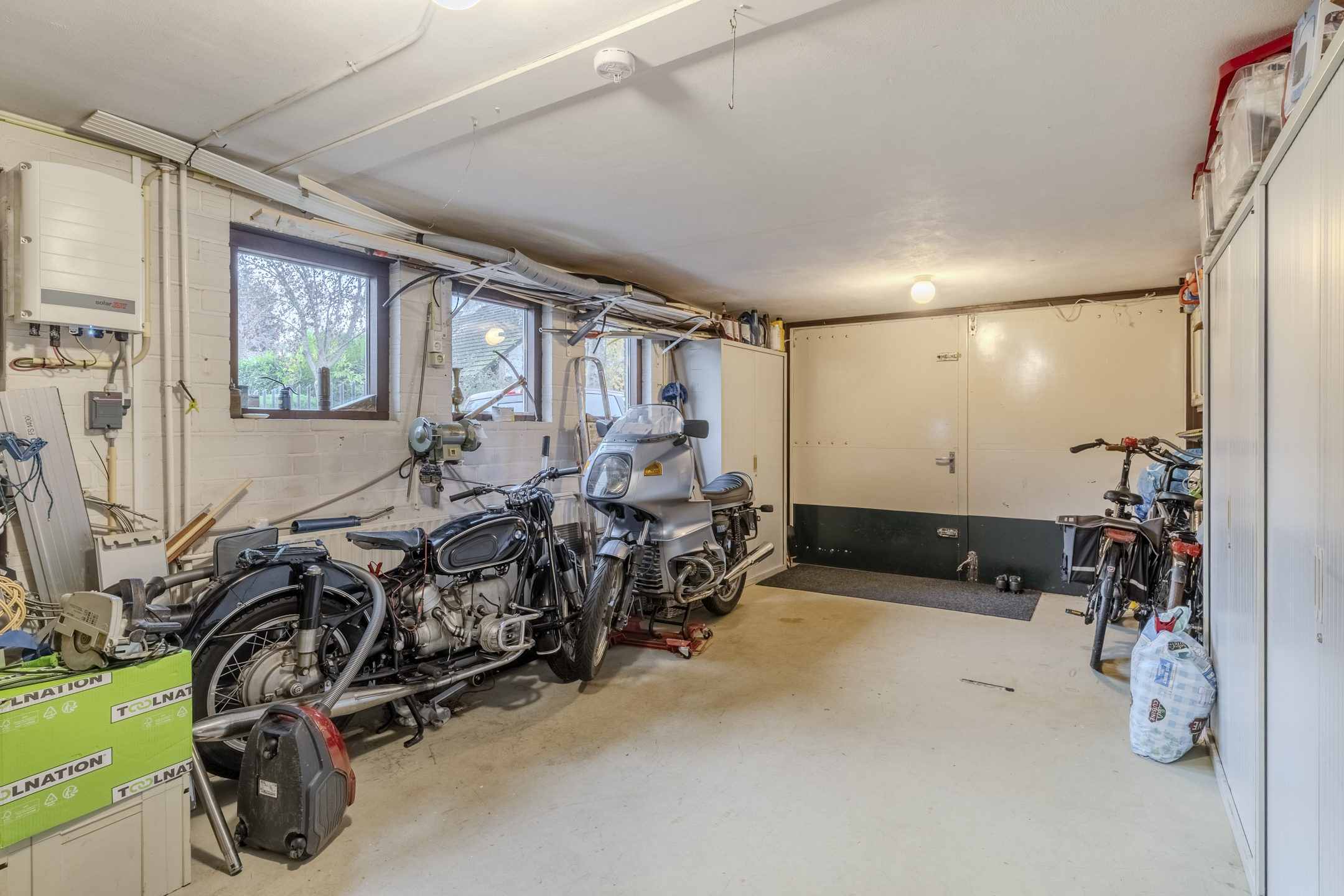 Praktische bijkeuken met aansluitingen ten behoeve van de wasapparatuur, opstelplaats van de binnenunit van de Daikin warmtepomp en een loopdeur naar buiten. Vanuit de bijkeuken is er verder inpandige toegang tot de grote garage met openslaande deuren naar de oprit en een loopdeur naar de naar de naastgelegen carport. In de garage bevindt zich de set van 5 thuisbatterijen (ter overname) van Sessy met een totale opslagcapaciteit van maar liefst 25KW.
